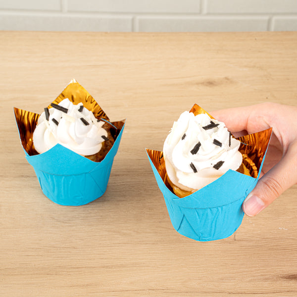 Enhance your bakery's presentation with stylish, greaseproof liners. Panificio Greaseproof Blue Tulip Cupcake Liners feature a greaseproof coating that ensures easy removal of baked goods, making them an essential item for efficient service. Designed with a beautiful tulip shape, these liners beautifully showcase your muffins and cupcakes, enhancing their visual appeal and creating an impressive display for customers. Made with heavy-duty foil paper, these liners maintain their shape in high-heat ovens, guaranteeing consistent results and reliability for your baking needs. Measuring 3.35 inches in width and 2.75 inches in height, these foil baking cups provide ample space for your treats while ensuring a sturdy base. Elevate your dessert presentations and streamline your baking process with these dependable muffin paper cups. Each order includes 500 Panificio Greaseproof Blue Tulip Cupcake Liners.
