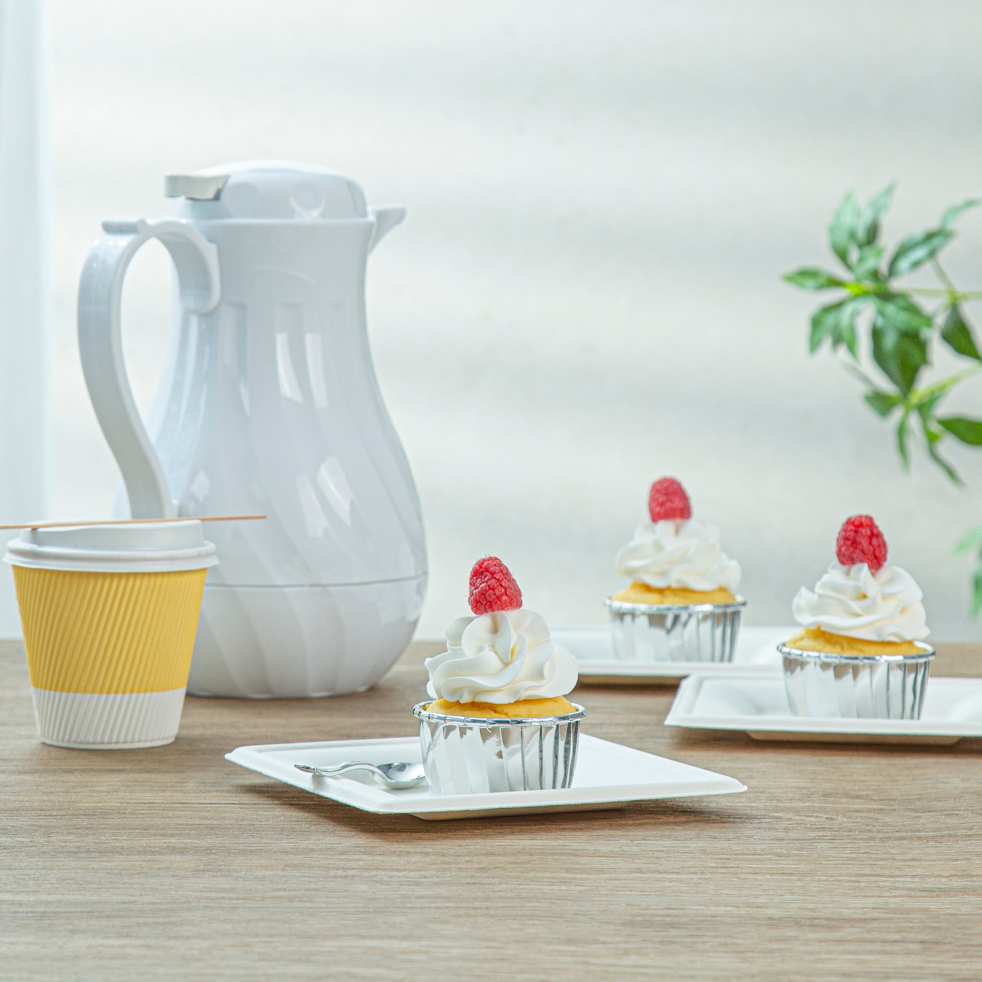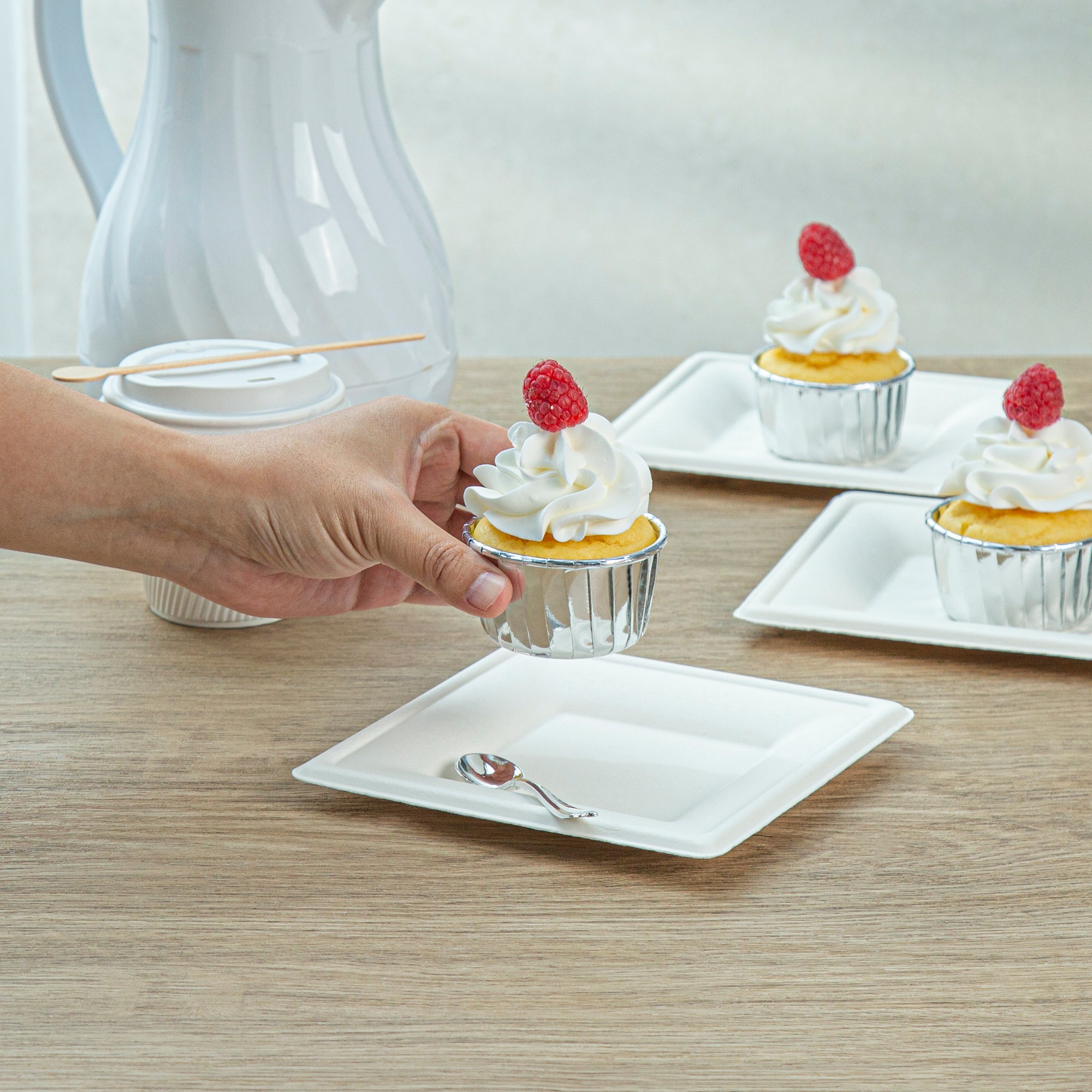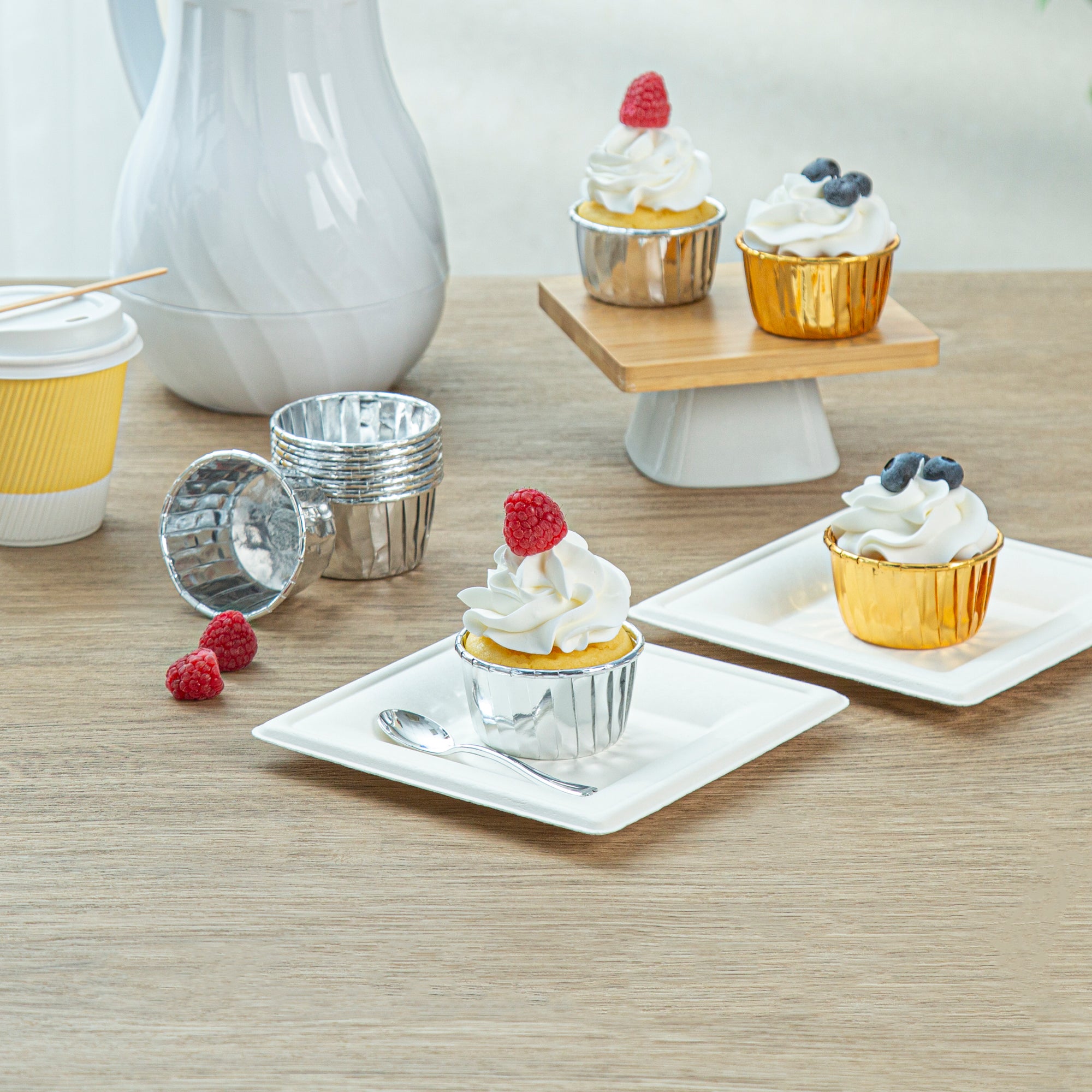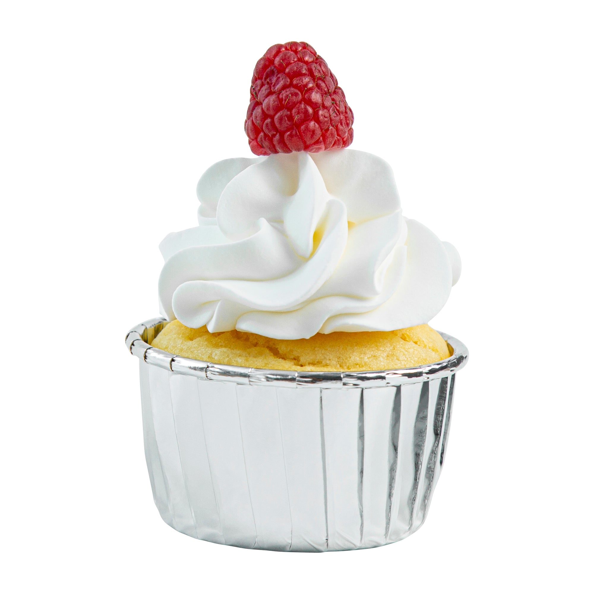 Create and serve dazzling desserts with our Panificio 3-ounce Round Metallic Silver Paper Small Baking Cups. The pleated design of these baking cups provides reinforcement to the sides. These silver baking cups come with a rolled edge, which facilitates them to retain their form perfectly in high and low temperatures up to 425F. Made of grease-resistant material, these cupcake liners avoid undesirable splotches. To add a touch of elegance to your baked goods, these cupcake baking cups are fashioned with a metallic silver shade. These baking liners can be conveniently disposed of after use, making cleaning a breeze. Measuring 2.5 inches in diameter by 1.5 inches in height, these baking liners contain up to 3 ounces, making them ideal for baking mini cupcakes, muffins, and puddings. Shipped in a 200 count box.