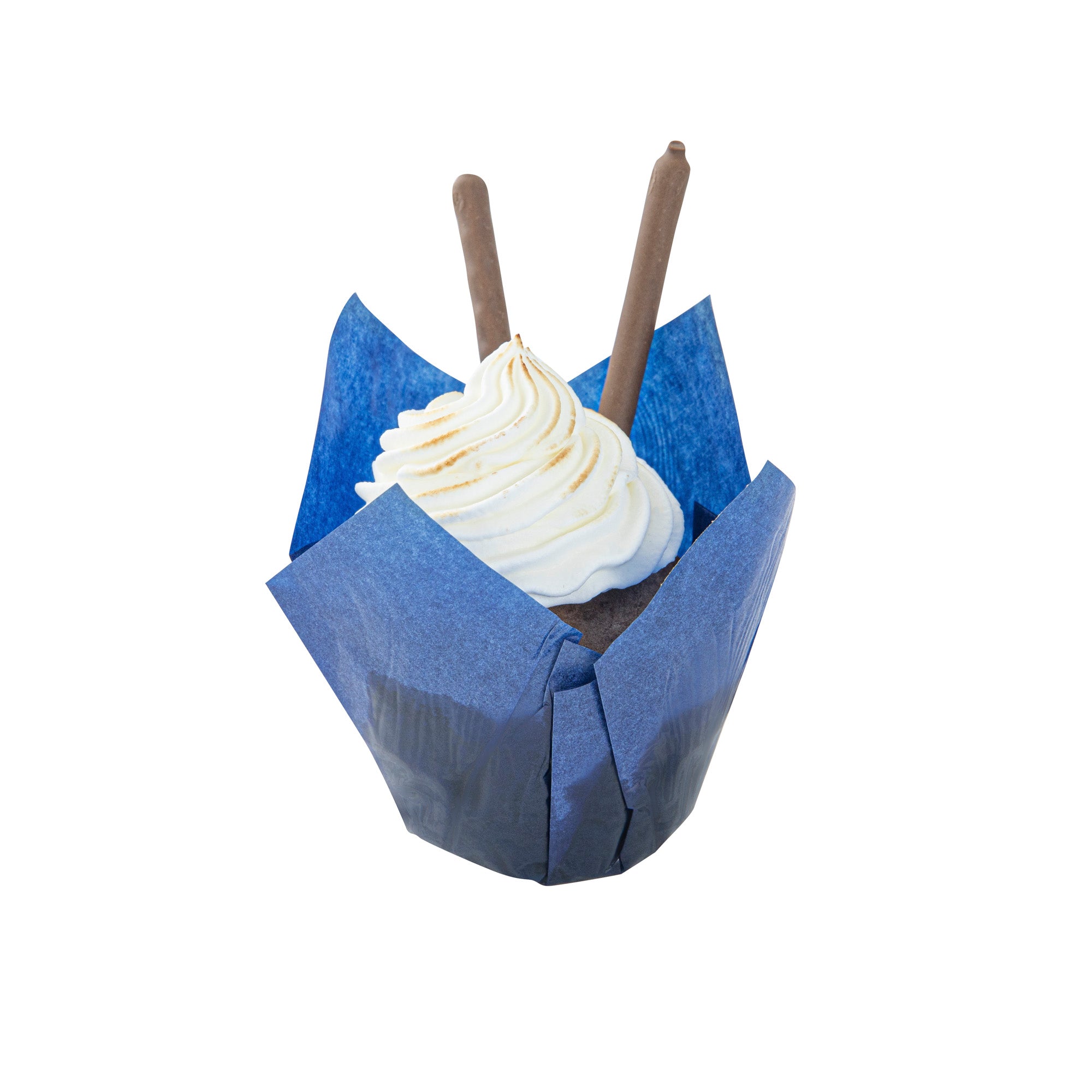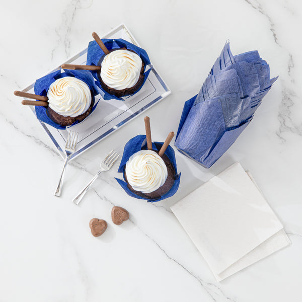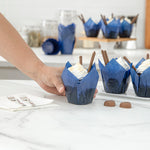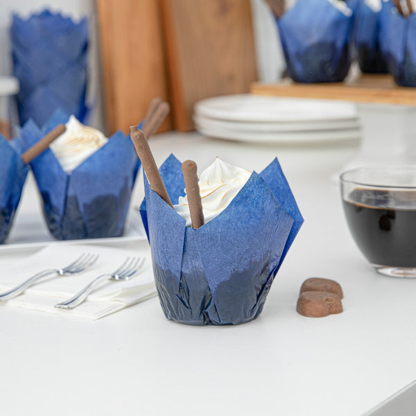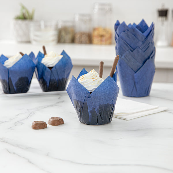 Beautify your baked goods with our Panificio 4-ounce Blue Paper Tulip Baking Cups. Crafted from premium paper, these disposable cupcake liners can withstand temperatures up to 425F to bake delicious treats. These paper baking cups have a grease-resistant lining that allows you to easily peel off the wrapper without damaging the quality of your desserts. Featuring a vibrant blue finish and delicate tulip design, these recyclable baking cups dress up any dessert presentation at a bakery, cafe, catering event, or food service establishment. Measuring 3.5 inches in diameter, these paper baking liners are ideal for serving muffins and cupcakes. Shipped in a 200 count box.