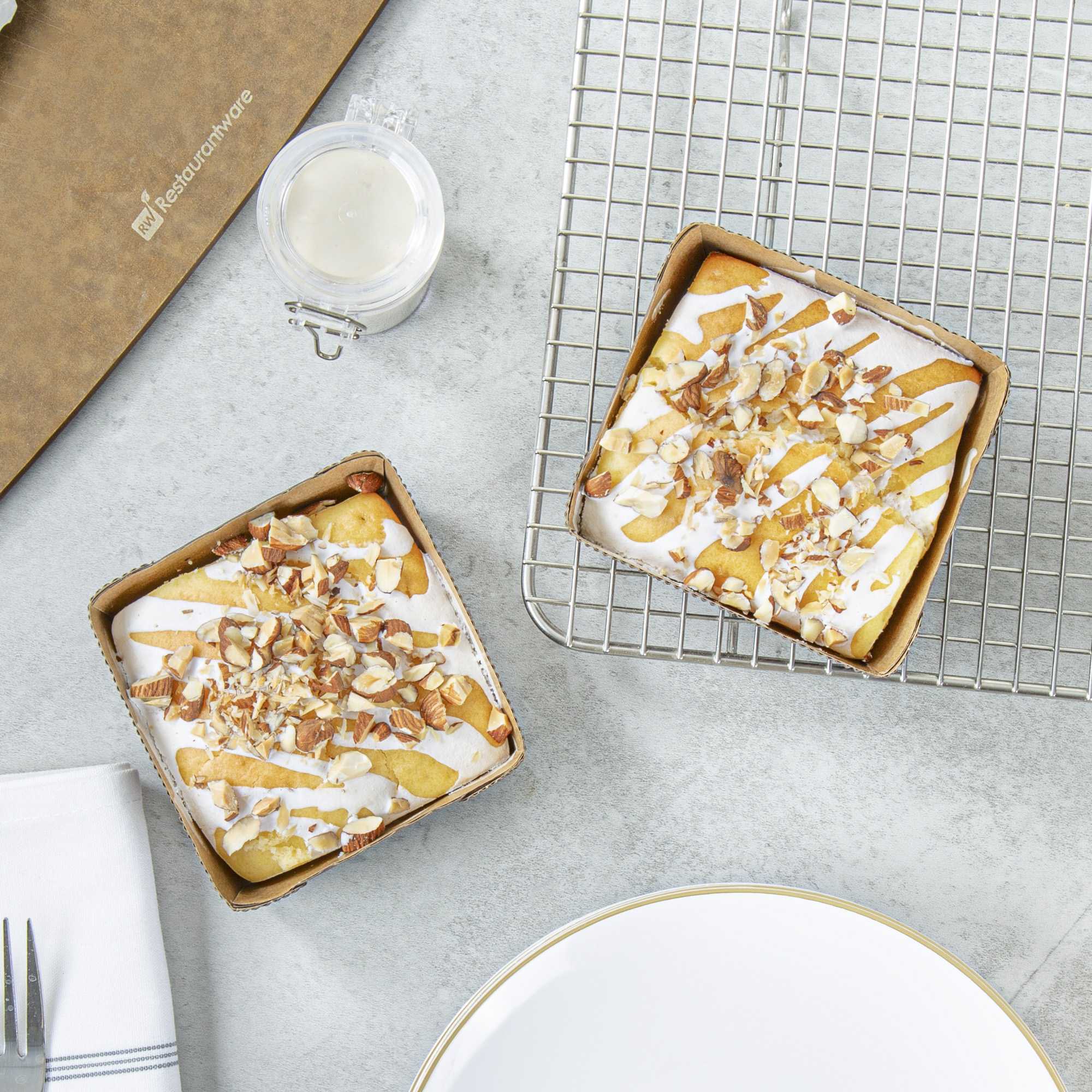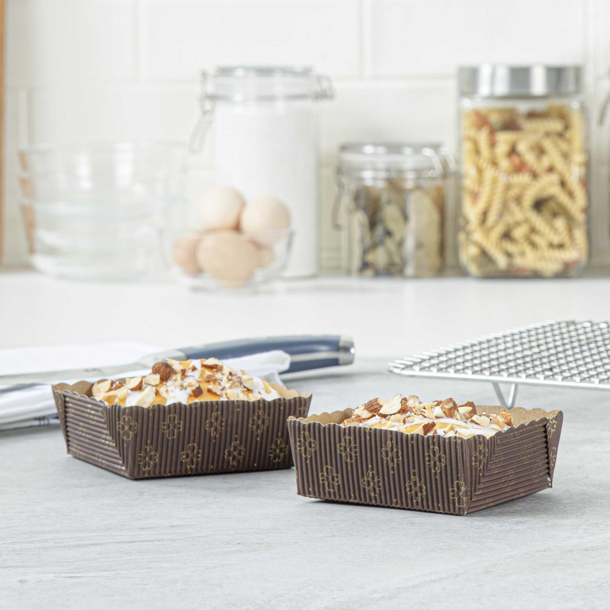 Upgrade your baking pans with our Panificio 4-ounce Kraft Paper Square Baking Cups. These baking pans have a sturdy and freestanding design that enables them to easily stand up to heavy cake batters. The grease-resistant interior lining of the disposable baking cups helps the bread to not stick to the pan. Made of corrugated kraft paper, these baking cups are conveniently oven-safe up to 460F. These paper baking cups make it easy to dispose of after baking and serving your delicious brownies. With a coffee brown color, these paper baking cups are perfect for giving your cupcakes and muffins an air of sophistication. Measuring 3 inches in length by 2.75 inches in width by 1.75 inches in height, your desserts will retain the stylish cubic shape provided by our square paper baking cups. These kraft paper baking cups can contain up to 4 ounces. Sold in a 100 count box.