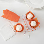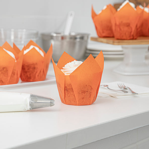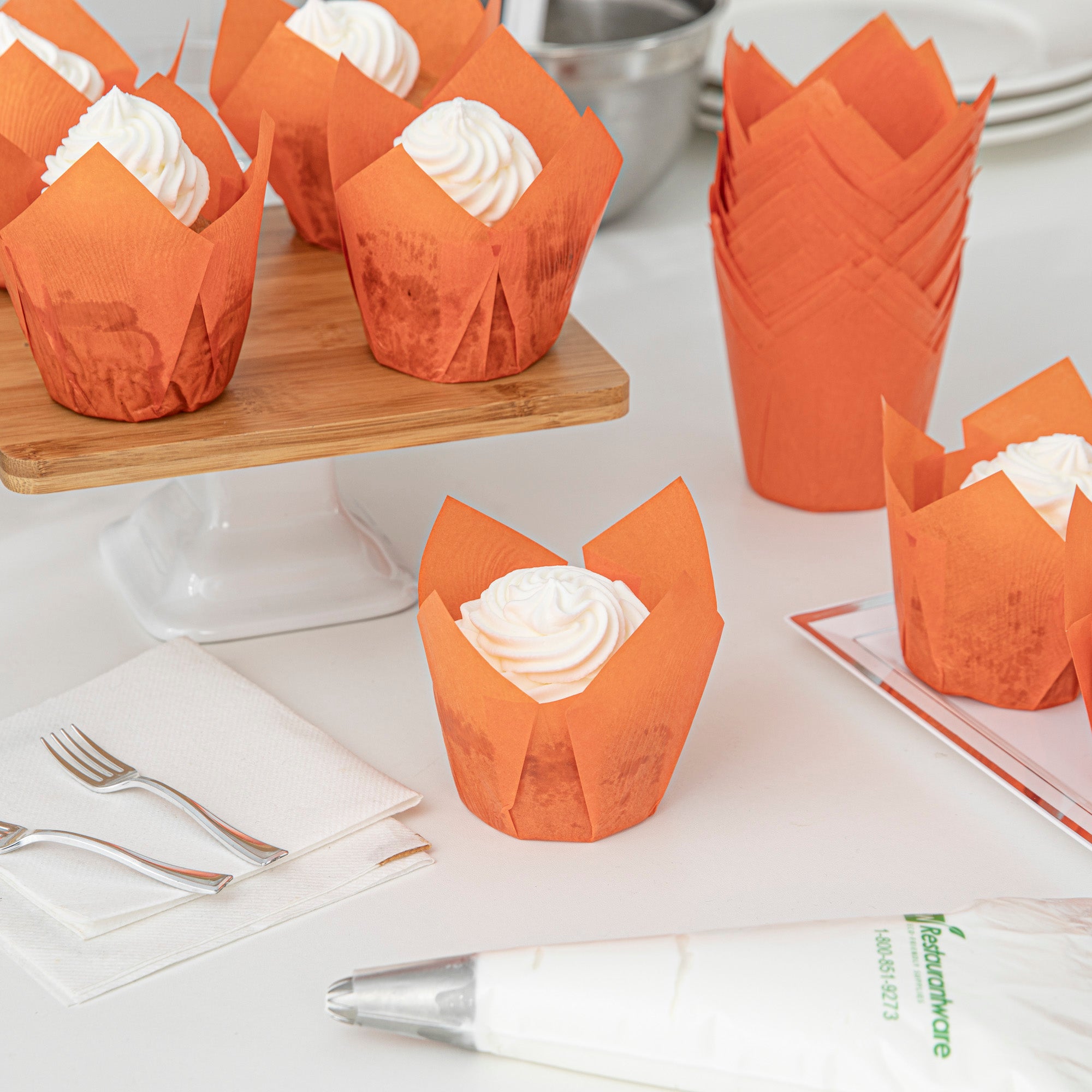 Give your treats a sweet makeover with these Panificio Orange Paper Tulip Baking Cups. Featuring a stylish four-petaled design, these tulip cupcake papers are the perfect way to prepare and present treats for all types of events. Their bright orange hue instantly attracts attention to your selection of baked goods, while their greaseproof design ensures your treats can be easily removed and enjoyed. Made from premium greaseproof paper, these orange cupcake liners are designed to reduce annoying grease stains from oily batters or buttery frostings. Each of these high-quality paper cupcake cups is conveniently oven-safe up to 425F. These eye-catching orange baking cups measure 3.5 inches in diameter and can contain up to 4 ounces. These 4-ounce paper baking cups are sold in a 200 count box.