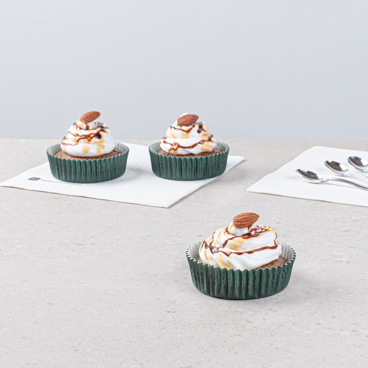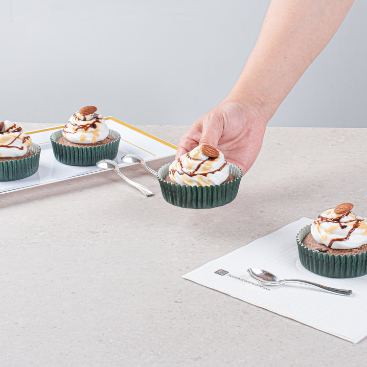 Maintain perfect shape and freshness with disposable muffin cups. The Panificio Grease-Resistant Disposable Muffin Cups feature a grease-resistant coating that ensures easy pastry release, preventing baked goods from sticking and making cleanup effortless. These cups boast a ridged design that beautifully accentuates muffins and cupcakes, enhancing their visual appeal and delighting customers with every presentation. Constructed from heavyweight paper, they withstand high oven temperatures up to 425 degrees Fahrenheit, making them the ideal ovenproof cupcake liners for your bakery or café. With a 4-ounce capacity, they provide the perfect portion size for standard muffins or cupcakes, ensuring consistent serving sizes. The forest green color adds a touch of elegance to your displays, making these greaseproof muffin liners an attractive choice for catering events and foodservice establishments. Each order includes 200 Panificio Grease-Resistant Disposable Muffin Cups.