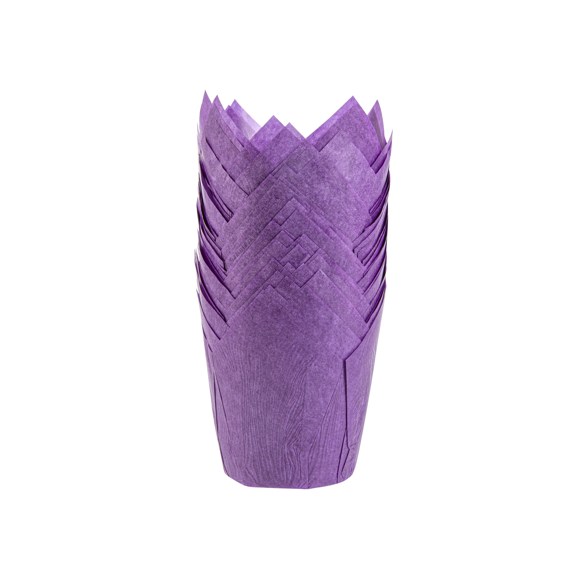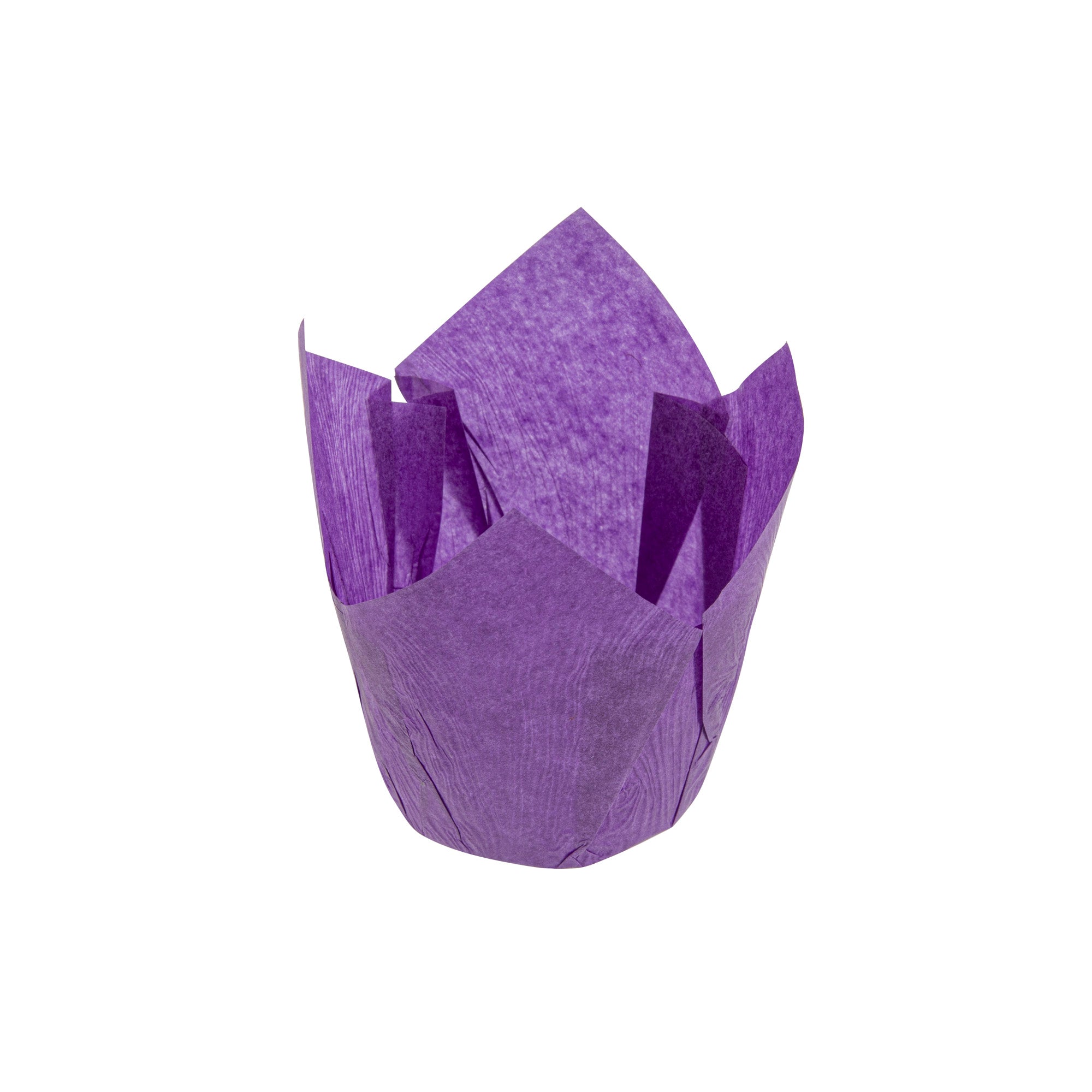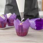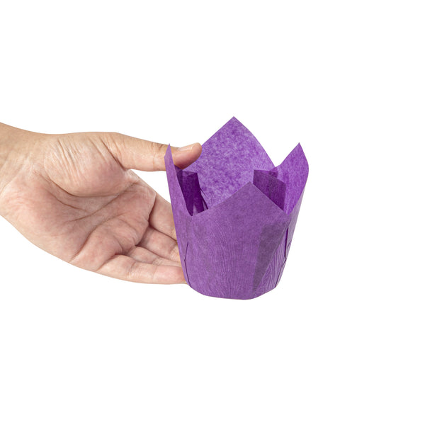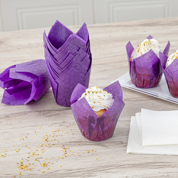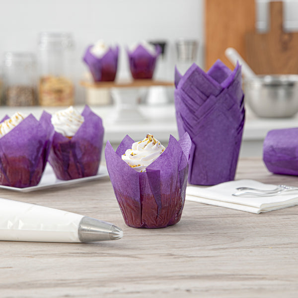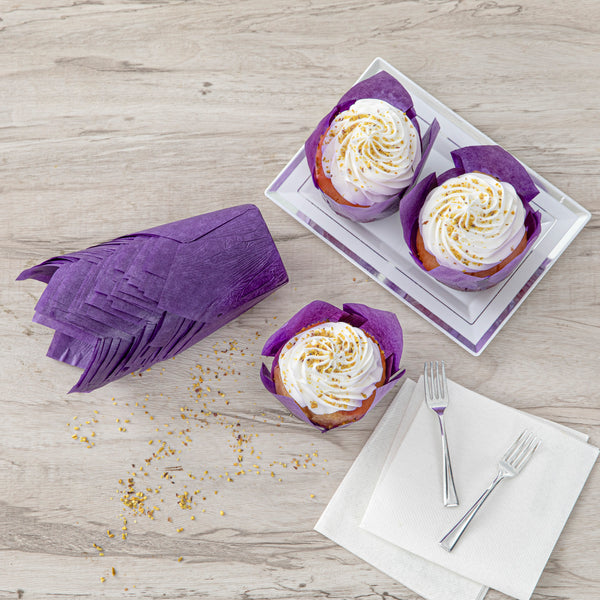 Revamp your desserts using our Panificio 4-ounce Violet Paper Tulip Baking Cups. Featuring a four-pointed petal design, these tulip baking cups are a great way to frame and showcase your personal-sized treats. These paper baking cups are conveniently freezer-safe and oven-safe up to 425F. Made from premium paper, these tulip muffin liners are designed to easily peel away and maintain their shape and look. The grease-resistant feature helps retain moisture in your recipes and prevents oily batters or buttery frostings from leaking through. Each of these cupcake wrappers features an eye-catching purple color that looks great in bakery display cases or dessert displays. Containing up to 4 ounces, these purple cupcake liners measure 3.5 inches in diameter by 3.5 inches in height. Sold in a 200 count box.