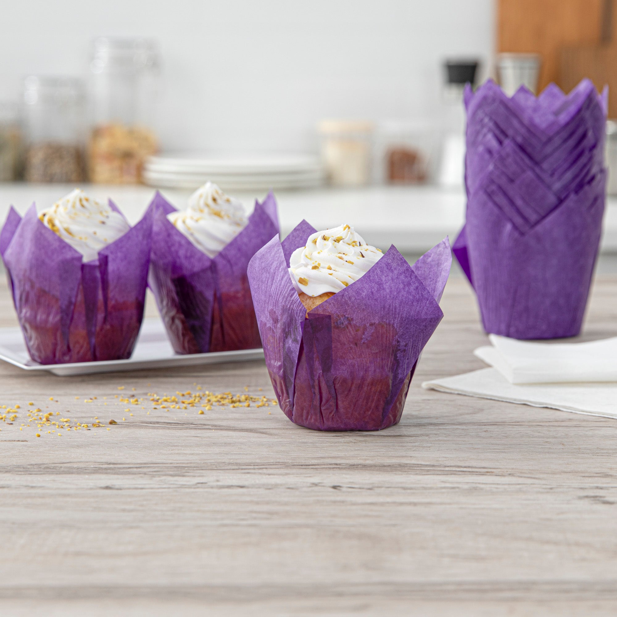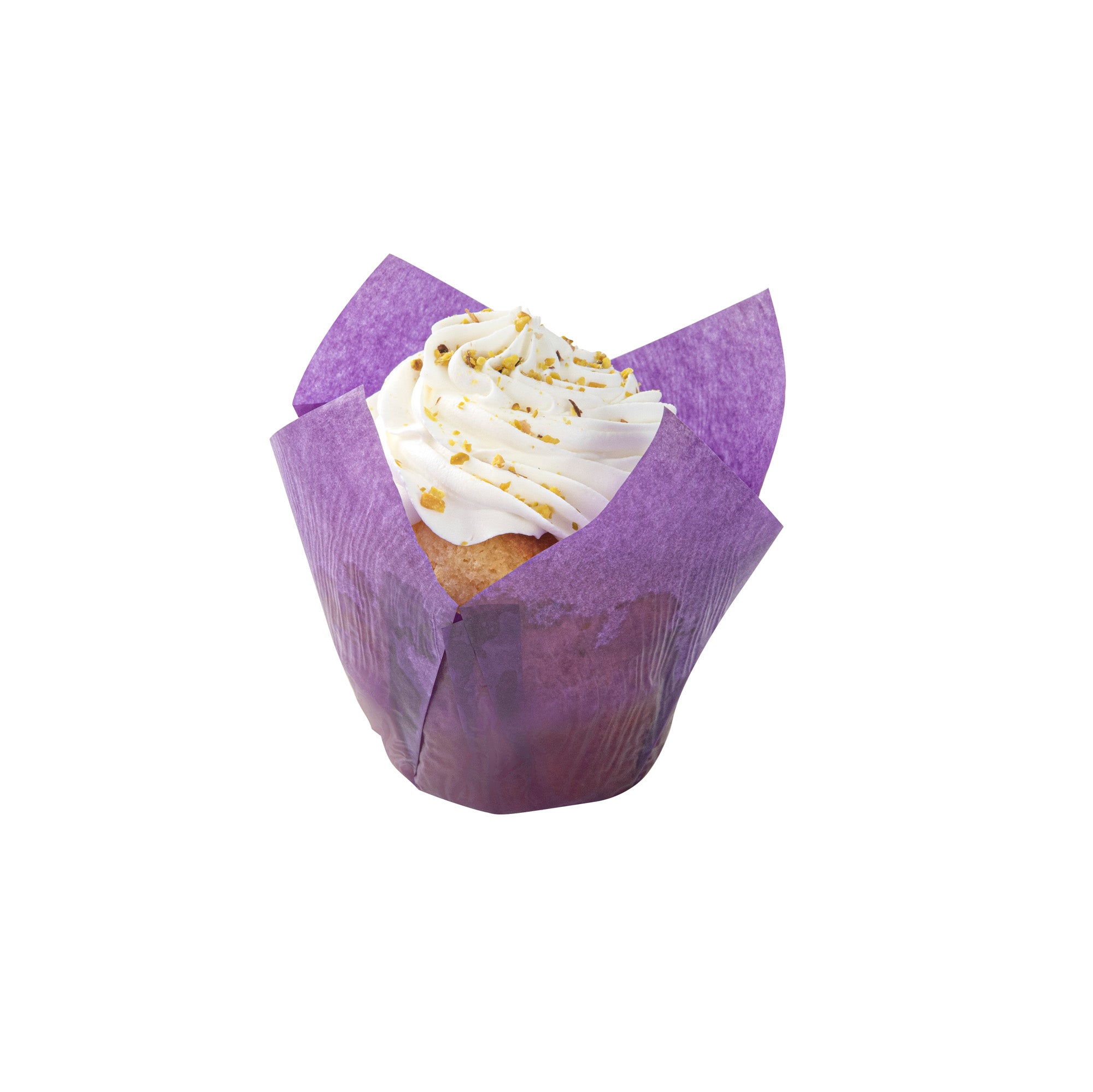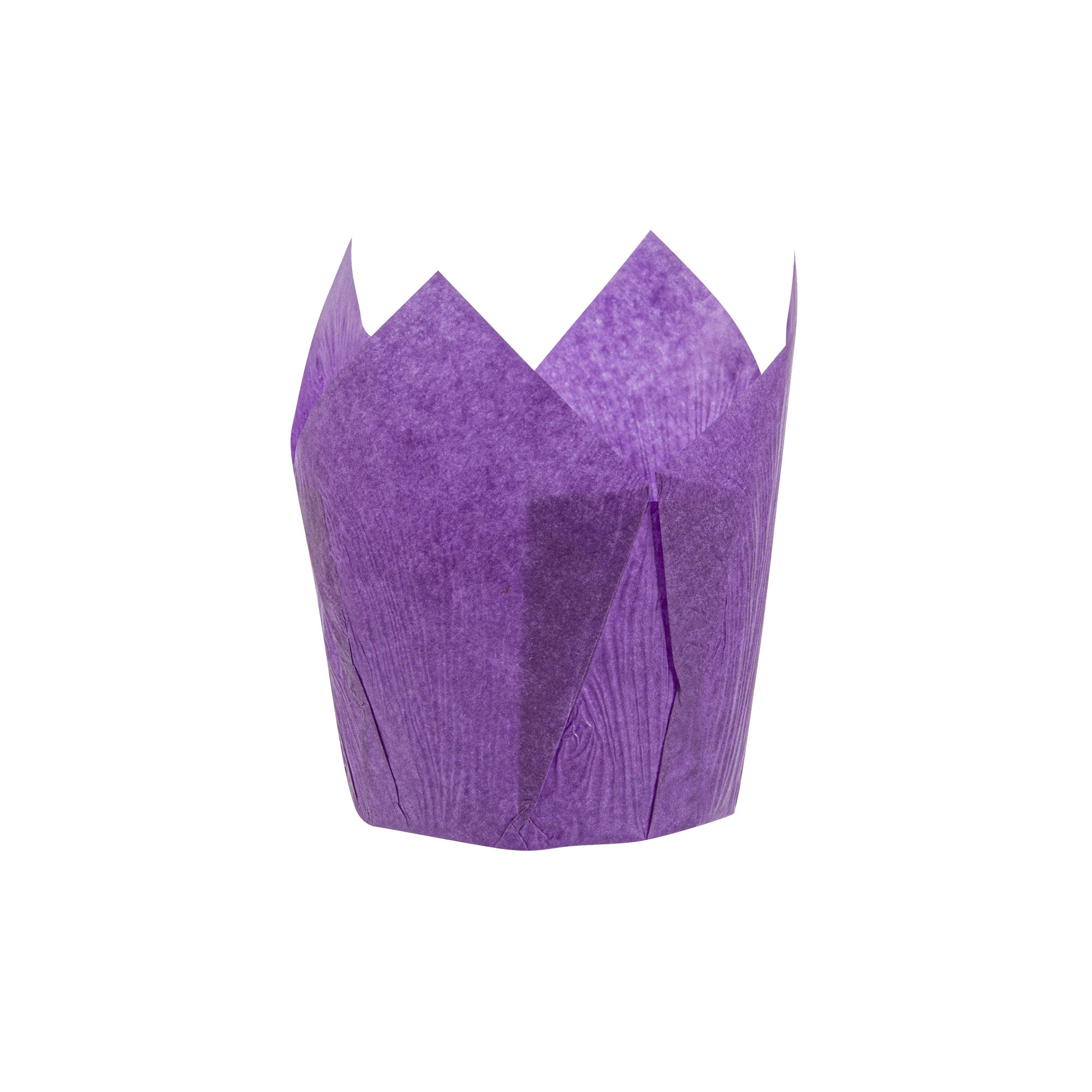 Revamp your desserts using our Panificio 4-ounce Violet Paper Tulip Baking Cups. Featuring a four-pointed petal design, these tulip baking cups are a great way to frame and showcase your personal-sized treats. These paper baking cups are conveniently freezer-safe and oven-safe up to 425F. Made from premium paper, these tulip muffin liners are designed to easily peel away and maintain their shape and look. The grease-resistant feature helps retain moisture in your recipes and prevents oily batters or buttery frostings from leaking through. Each of these cupcake wrappers features an eye-catching purple color that looks great in bakery display cases or dessert displays. Containing up to 4 ounces, these purple cupcake liners measure 3.5 inches in diameter by 3.5 inches in height. Sold in a 200 count box.