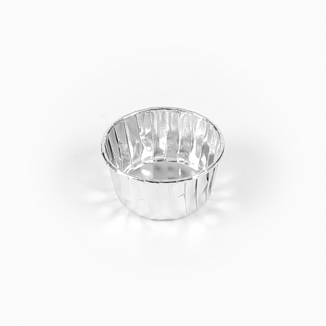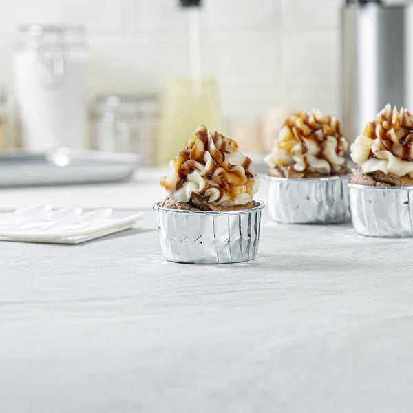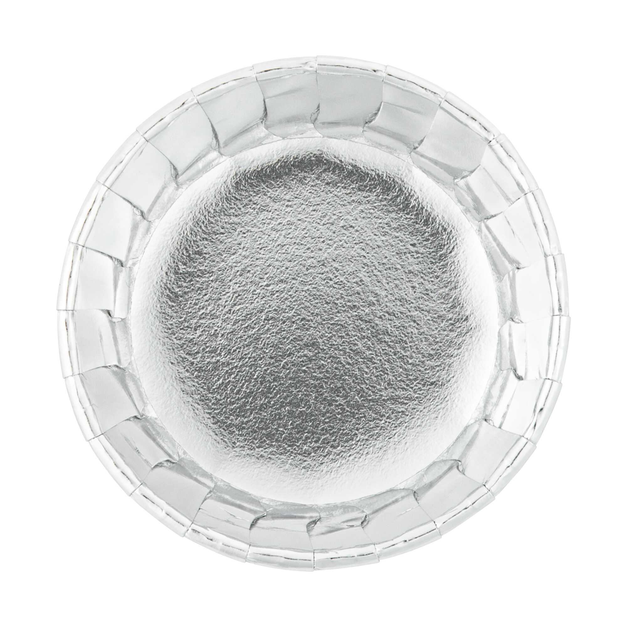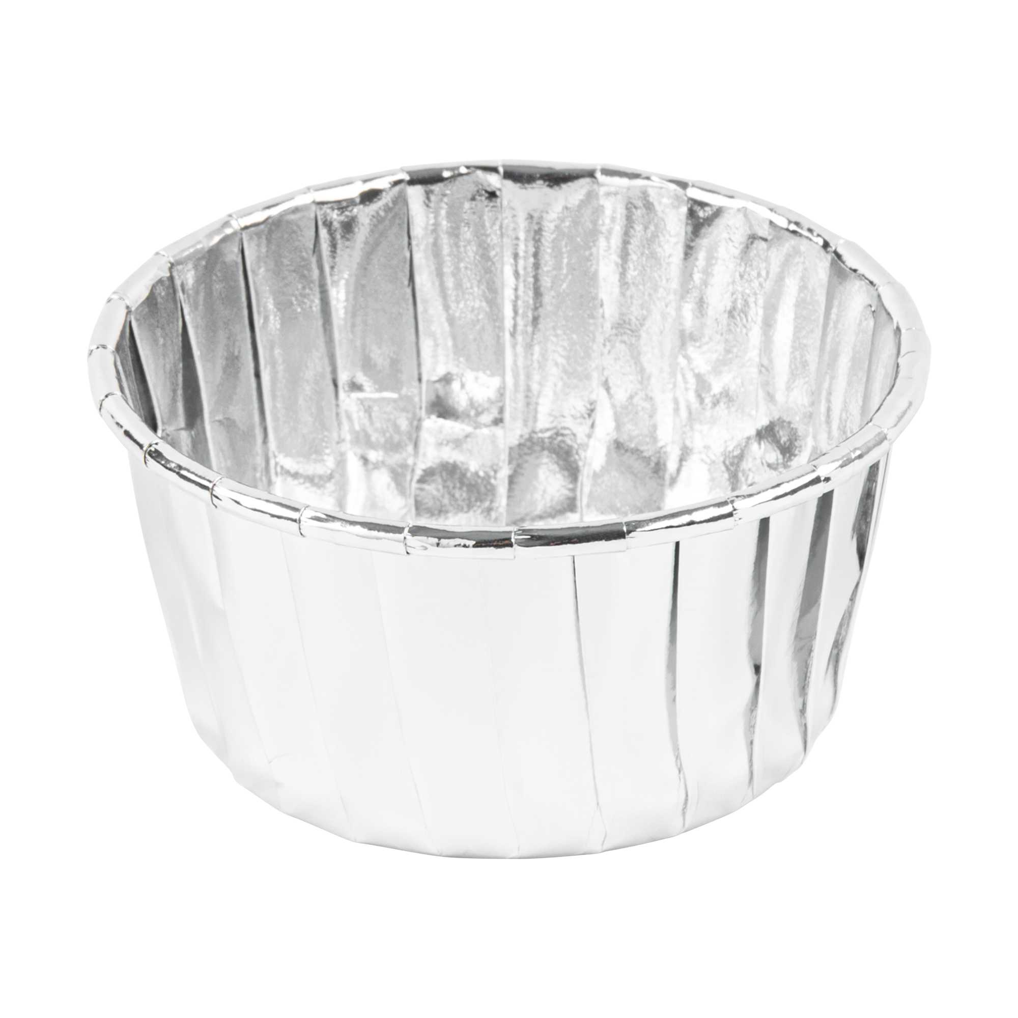 Serve miniature appetizers and bite-sized hors d'oeuvres with our Panificio 5.5-ounce Round Metallic Silver Paper Large Baking Cups. The pleated construction of these baking cups gives extra strength to the walls of these paper cupcake holders. Equipped with a reinforced rolled rim, these silver baking cups are designed to expertly hold their shape against hot or cold temperatures up to 425F. With their grease-resistant construction, these cupcake liners prevent unsightly grease splotches. The metallic-coated silver finish of these cupcake baking cups brings a touch of luxury to your baked goods and tasty treats. For easier cleaning, these baking liners are conveniently disposable. Measuring 3 inches in diameter by 1.25 inches in height, these baking liners contain up to 5.5 ounces, making them ideal for baking cupcakes, muffins, and puddings. Shipped in a 200 count box.