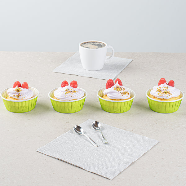 Enhance presentation and efficiency with grease-resistant baking cups. Panificio Grease-Resistant Paper Baking Cups feature a specialized coating that ensures your baked goods release effortlessly, saving time and maintaining the integrity of your creations. Constructed from heavyweight paper, these paper baking cups are designed to withstand high temperatures up to 425 degrees Fahrenheit, making them ideal for a variety of baking needs. The pleated design of these cupcake liners not only provides structural support but also beautifully accentuates your desserts in display cases, ensuring they capture the attention of customers. At 3.65 inches in length and width, and 1.57 inches in height, these green baking cups are perfect for standard-sized cupcakes and muffins, offering a professional look that complements any bakery's style. Invest in these disposable baking cups to streamline operations and elevate your food presentation. Sold in a 200 count box.