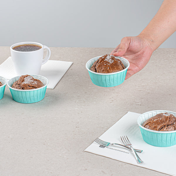 Enhance your presentation with grease-resistant cupcake liners. The Panificio Grease-Resistant Round Baking Cups feature a specialized coating that ensures easy release of your treats, preventing sticking and maintaining the integrity of your creations. Made from heavyweight paper, these round baking cups can withstand oven temperatures up to 425 degrees Fahrenheit, making them ideal for professional kitchens requiring reliable and consistent performance. With a vibrant turquoise color and a pleated design, they beautifully accentuate your baked delights, turning every dessert into a visual masterpiece. Each cup measures 3.65 inches in diameter and 1.57 inches in height, providing ample space for your cupcakes or muffins. These disposable cupcake holders are freezer-safe, allowing you to prepare and store your confections with ease. Invest in these round baking cups to streamline your baking process and deliver impressive results. Sold in a 200 count box.