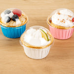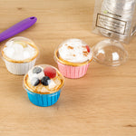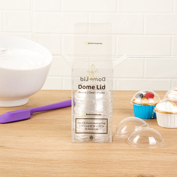 Ensure your treats stand out with elegant presentation. Panificio Dome Shape Baking Cups feature a distinctive dome design that provides extra room for toppings, keeping your creations beautifully intact and enhancing your clear dome lid displays. The clear finish of these cupcake display lids allows for quick and effortless identification of contents, making it easy to showcase your desserts with efficiency. Made from durable plastic, these round plastic lids offer reliable protection, ensuring your delectable treats remain safe during transport. Ideal for bakeries and caterers, the 2.7 inches by 2.7 inches by 1.5 inches dimensions provide a perfect fit for standard-sized cupcakes or muffins. Elevate your bakery's presentation and optimize your service with these recyclable and greaseproof baking cups. Sold in a 50 count box.