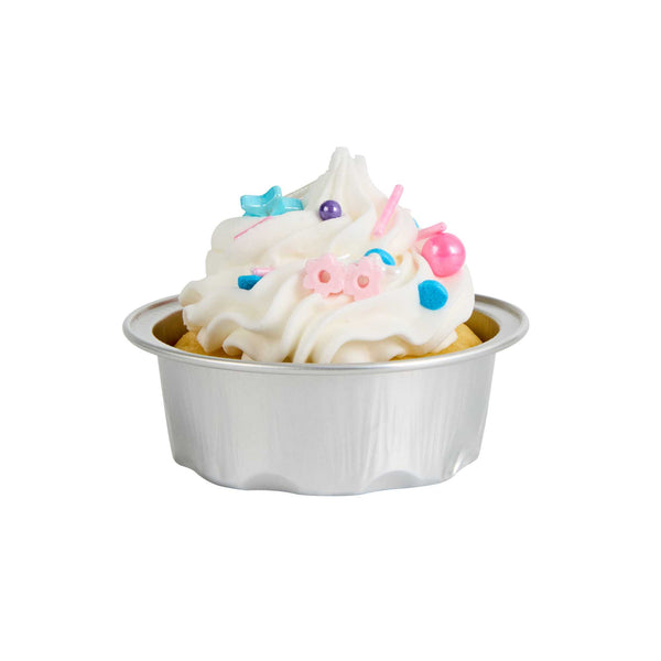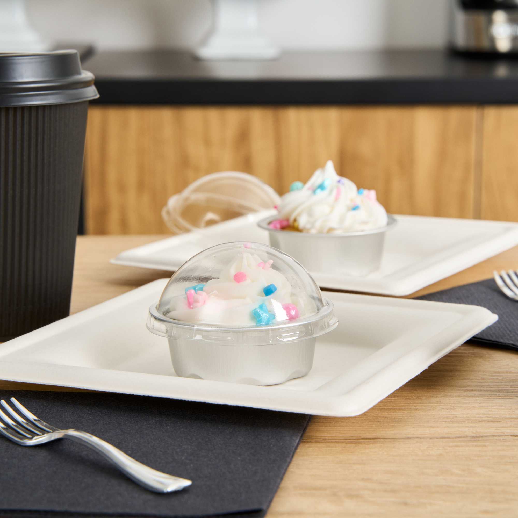 Efficiently bake and serve your desserts using our Pastry Tek 2-ounce Round Silver Aluminum Baking Cups. The dome-shaped lids included with these baking cups enable you to provide a lovely show without risking damage from the outside. Making food preparation and service quick and easy, these muffin cups are oven-safe, and freezer safe. With their disposable design, these baking cups with lids are disposable for a simplified cleaning process. Ideal for cafes or bakeries, these disposable cupcake foils make the packaging of takeaway orders a convenient process. Containing up to 2 ounces, each mini cake pan with lids measures 2.75 inches in diameter by 1 inch in height. Sold in a 100 count box.
