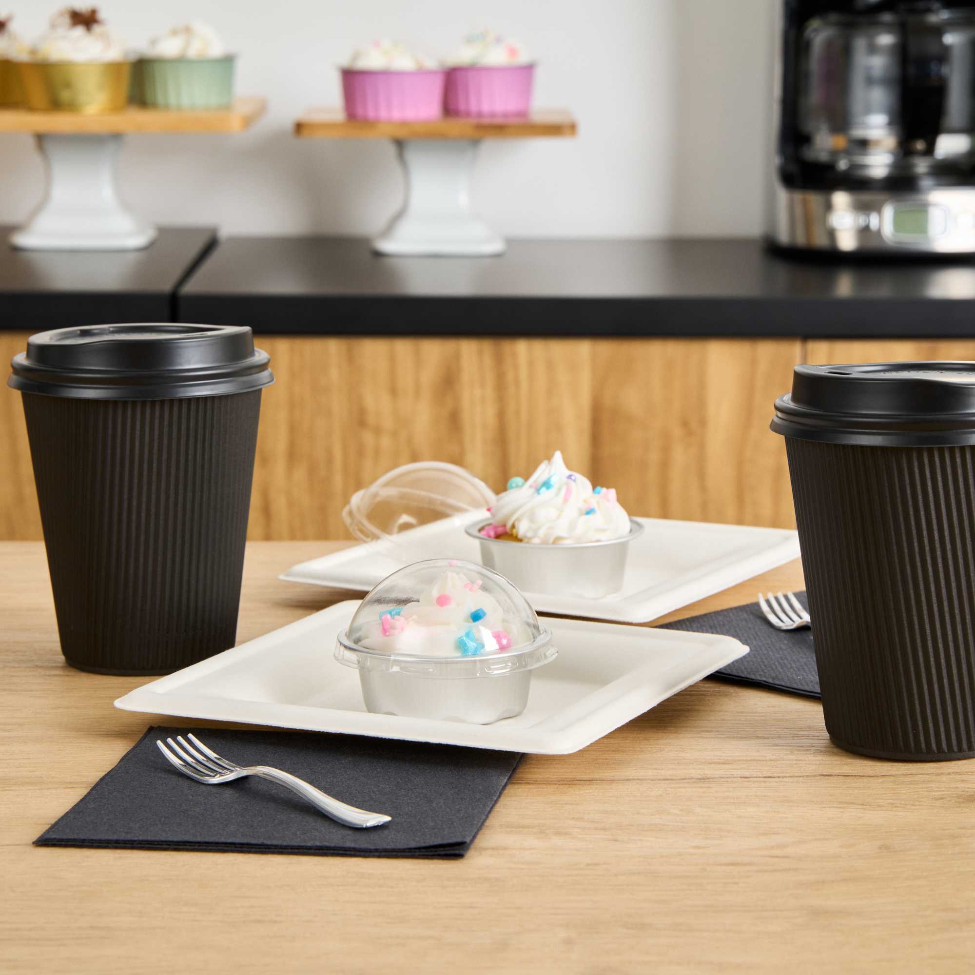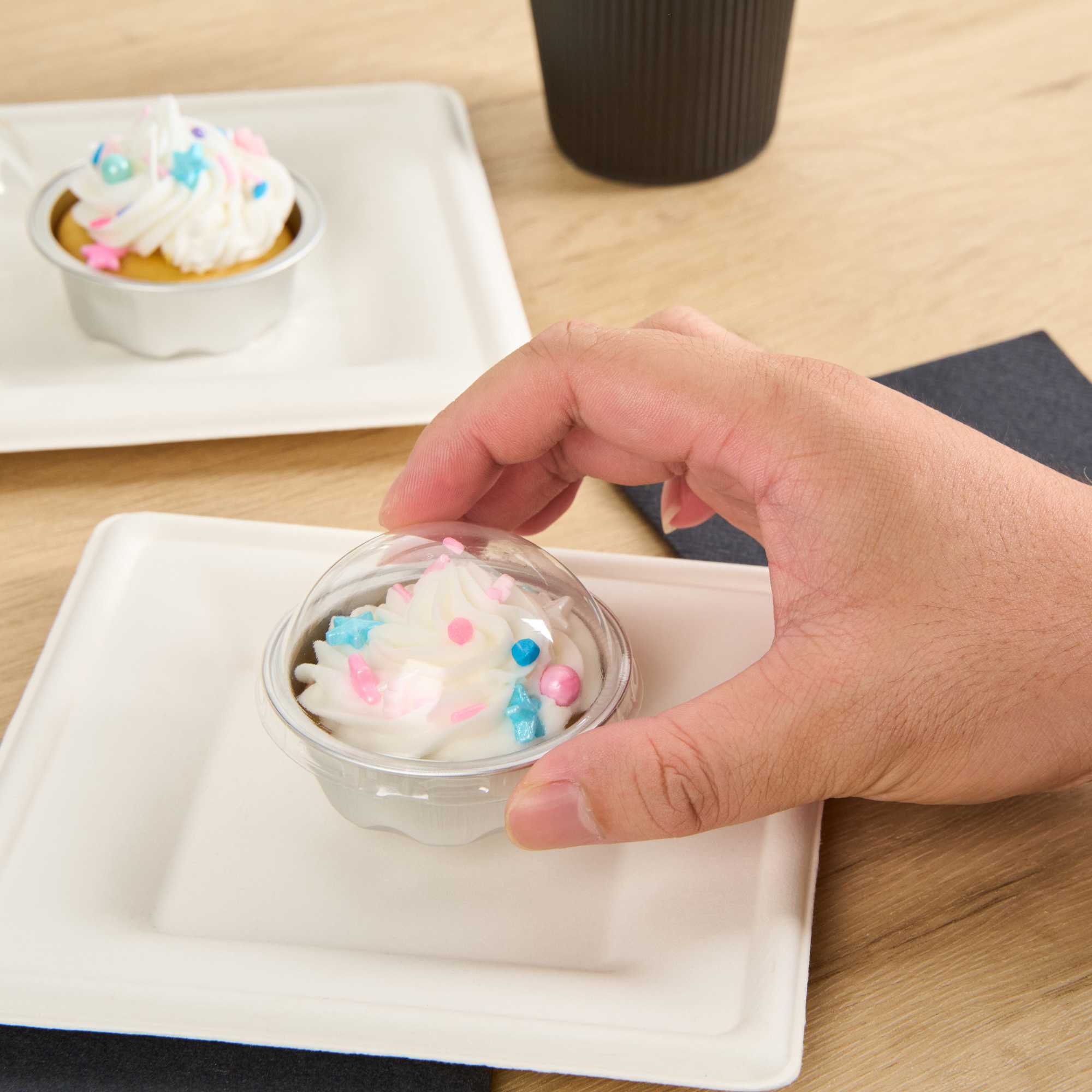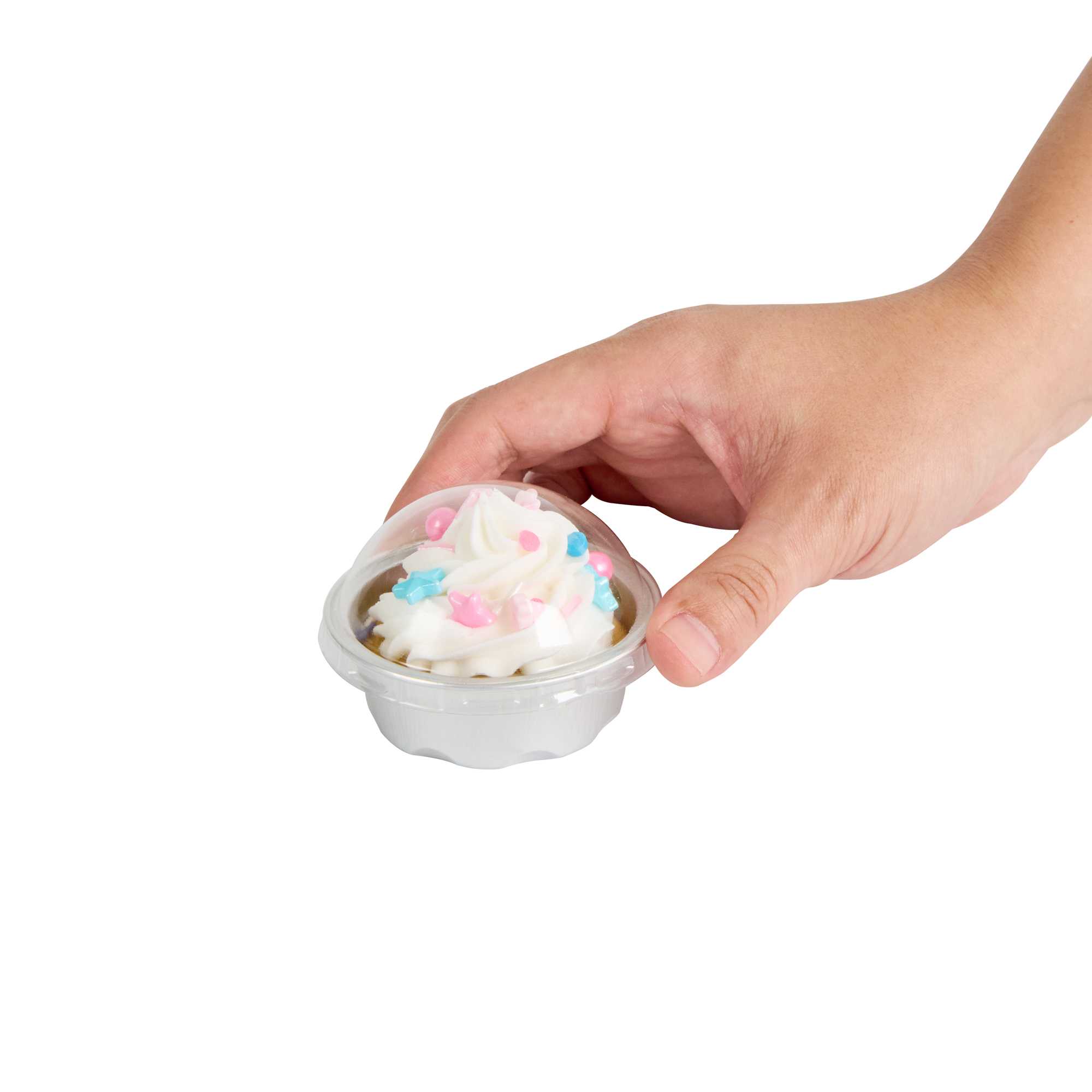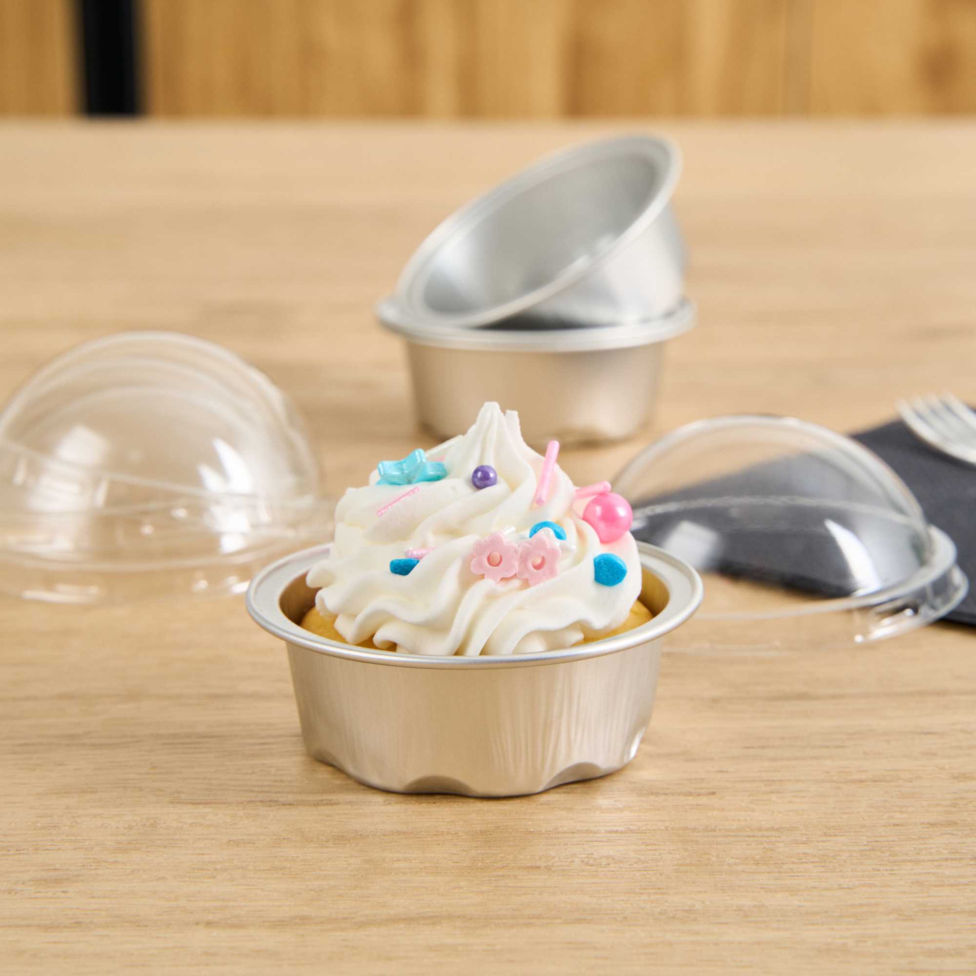 Efficiently bake and serve your desserts using our Pastry Tek 2-ounce Round Silver Aluminum Baking Cups. The dome-shaped lids included with these baking cups enable you to provide a lovely show without risking damage from the outside. Making food preparation and service quick and easy, these muffin cups are oven-safe, and freezer safe. With their disposable design, these baking cups with lids are disposable for a simplified cleaning process. Ideal for cafes or bakeries, these disposable cupcake foils make the packaging of takeaway orders a convenient process. Containing up to 2 ounces, each mini cake pan with lids measures 2.75 inches in diameter by 1 inch in height. Sold in a 100 count box.