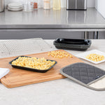 Minimize kitchen cleanup with versatile oven-to-table trays. The Pastry Tek Black Oven-Safe Paper Tray, crafted from sturdy paperboard, has an oven-safe design that seamlessly transitions from baking to serving, reducing the need for additional bakeware. This disposable baking tray features a greaseproof coating that ensures clean release of baked goods, maintaining the professional presentation of your pastries. With its freezable convenience, this tray keeps stored leftovers fresh, making it ideal for meal prep and long-term storage. Measuring 8.3 inches in length, 5.5 inches in width, and 1 inch in height, this sleek black tray adds a touch of elegance to any dish, enhancing your food presentation. Perfect for restaurants and bakeries, this oven safe paper tray supports sustainability efforts by being both disposable and recyclable. Each order includes 100 Pastry Tek Black Oven-Safe Paper Trays.