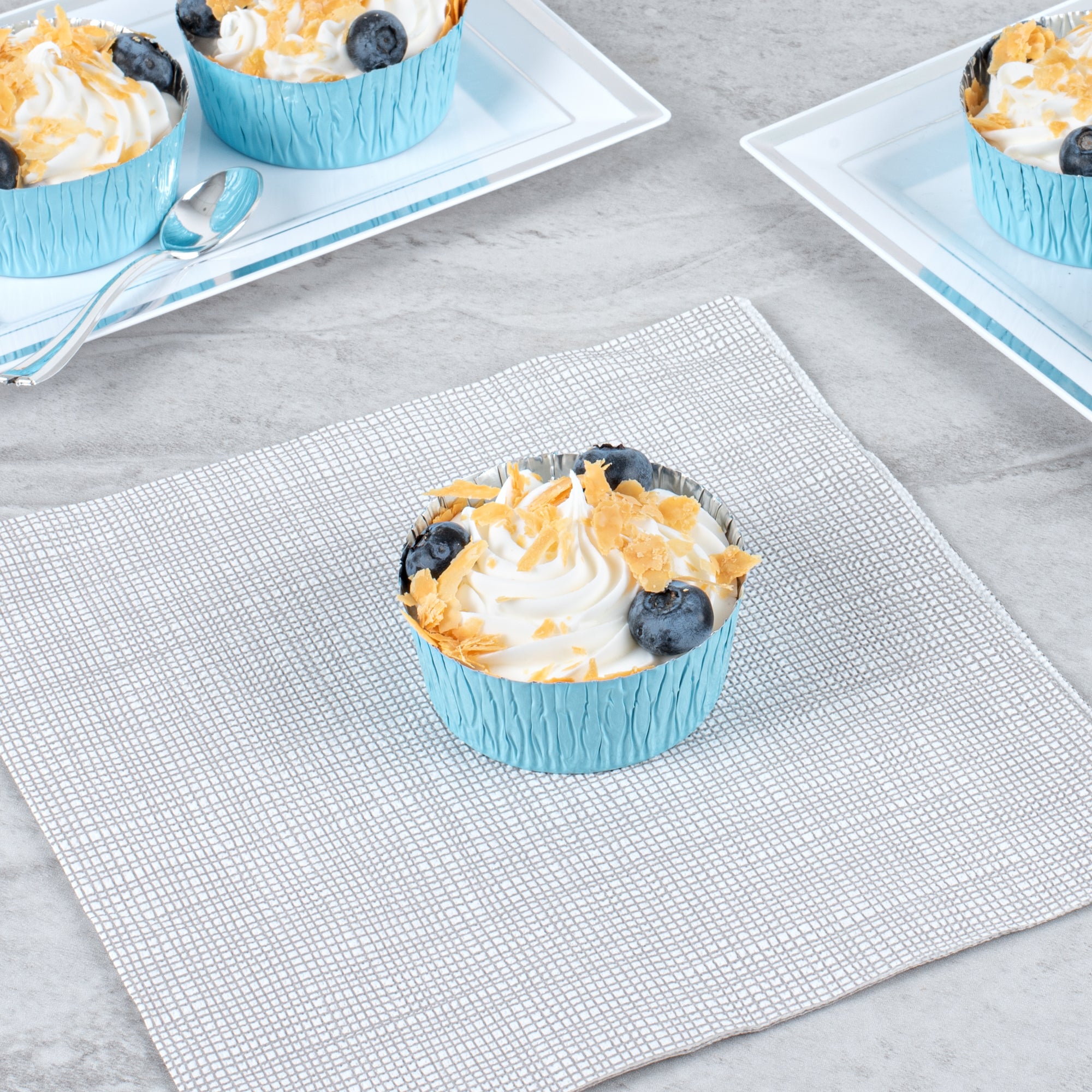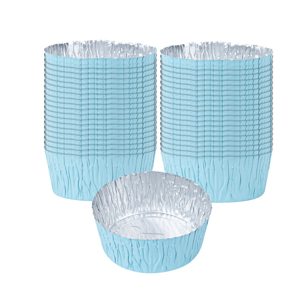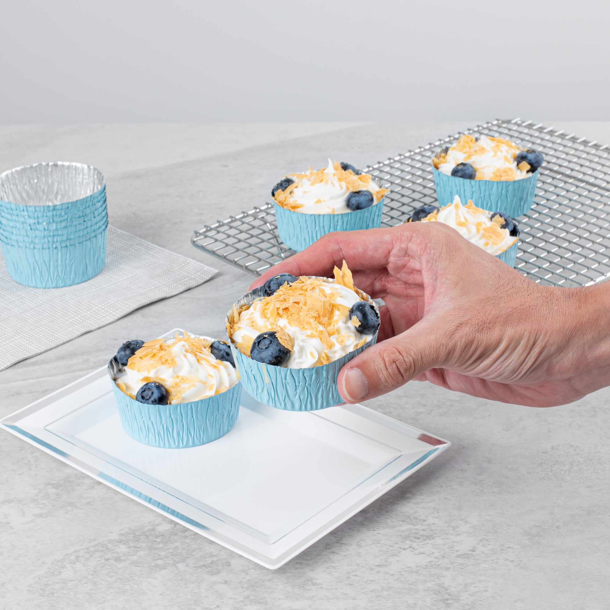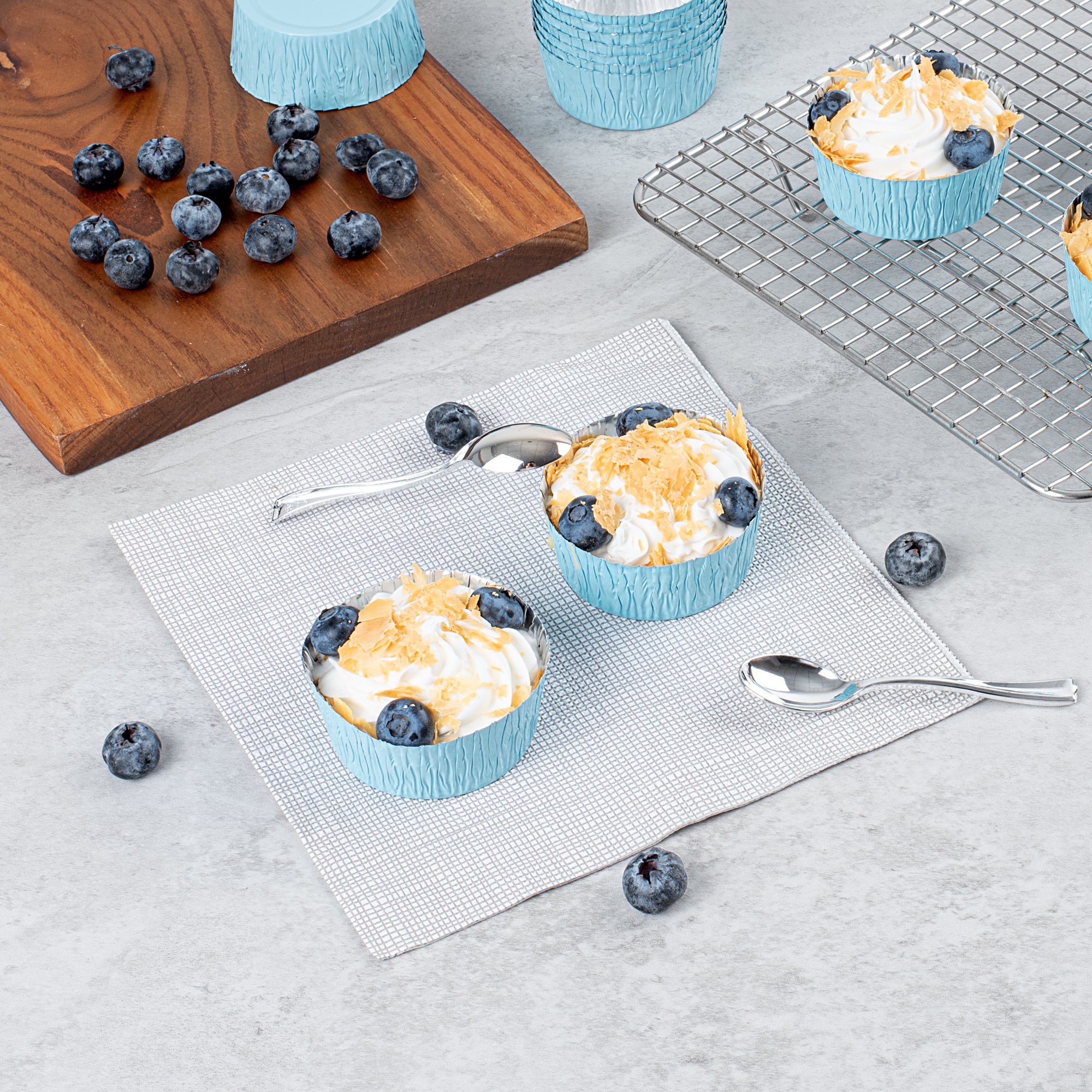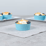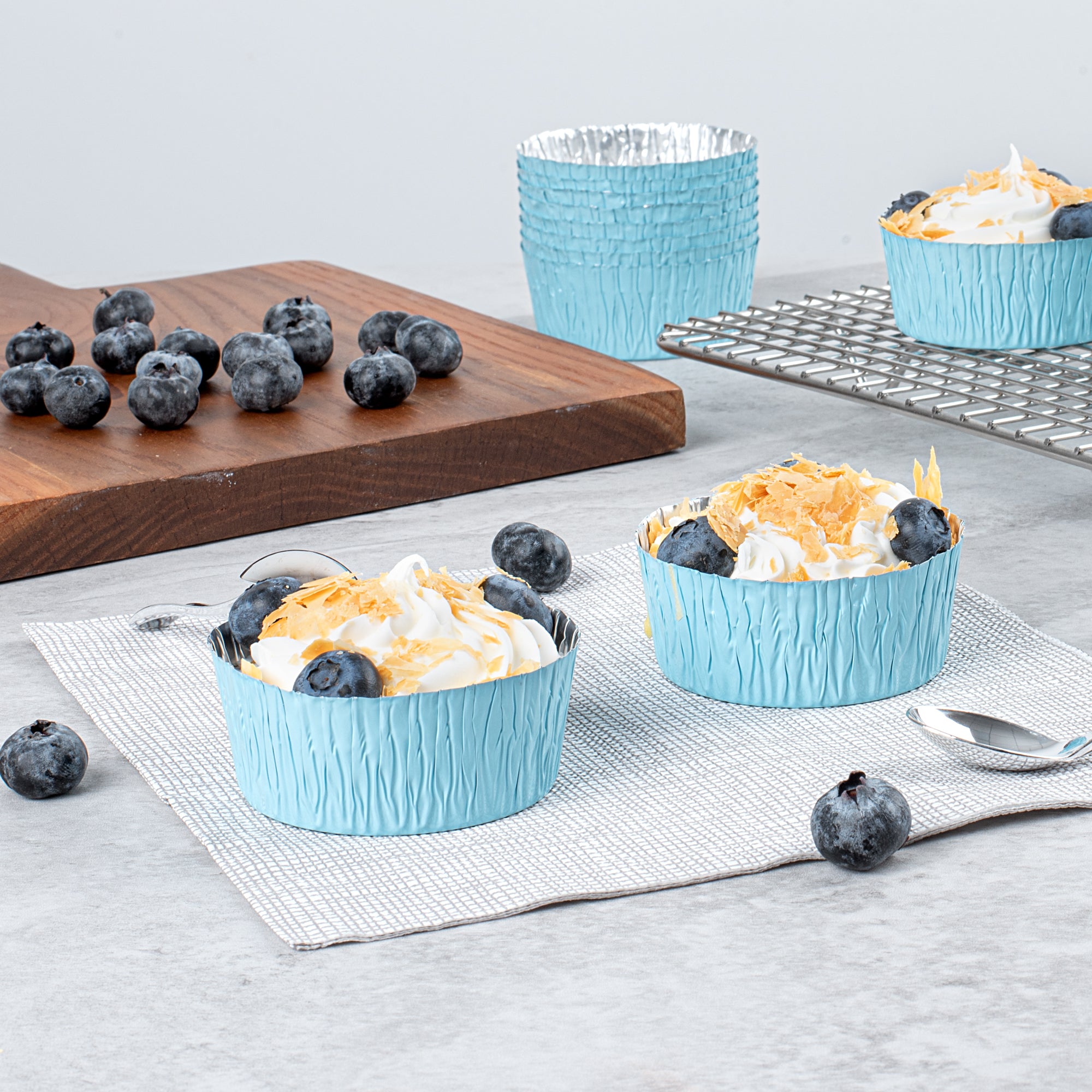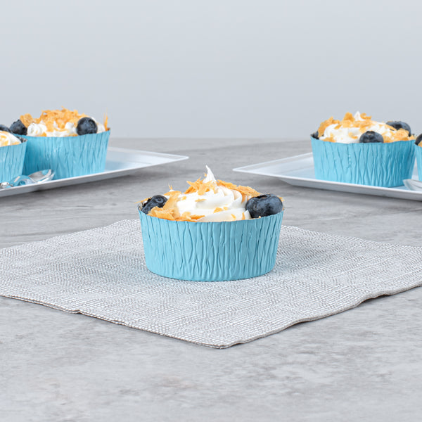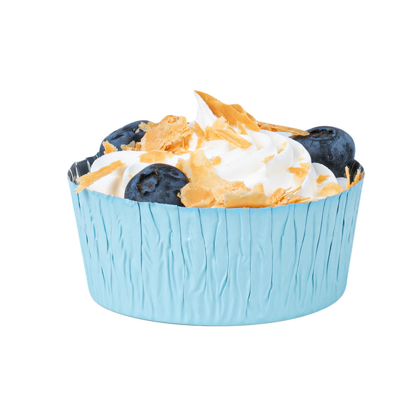 Enhance dessert presentation with our Pastry Tek 3 oz Round Blue Foil Ramekin Cups. Made from durable aluminum, these foil baking cups feature an oven-safe design that ensures consistent results for flan, custard, or creme brulee. With a glossy blue finish, these aluminum dessert cups add visual appeal to upscale plated desserts. Designed with a greaseproof interior, these ramekin cups maintain a neat, professional look from oven to table. Ideal for both hot and cold preparations, these foil cups are also freezer-friendly for make-ahead service. Their tear-resistant, recyclable build supports eco-conscious practices in high-volume kitchens. Measuring 2.36 inches in diameter by 1.14 inches in height, these disposable baking cups are a dependable option for catering, bakeries, or restaurants. Sold in a 200 count box.