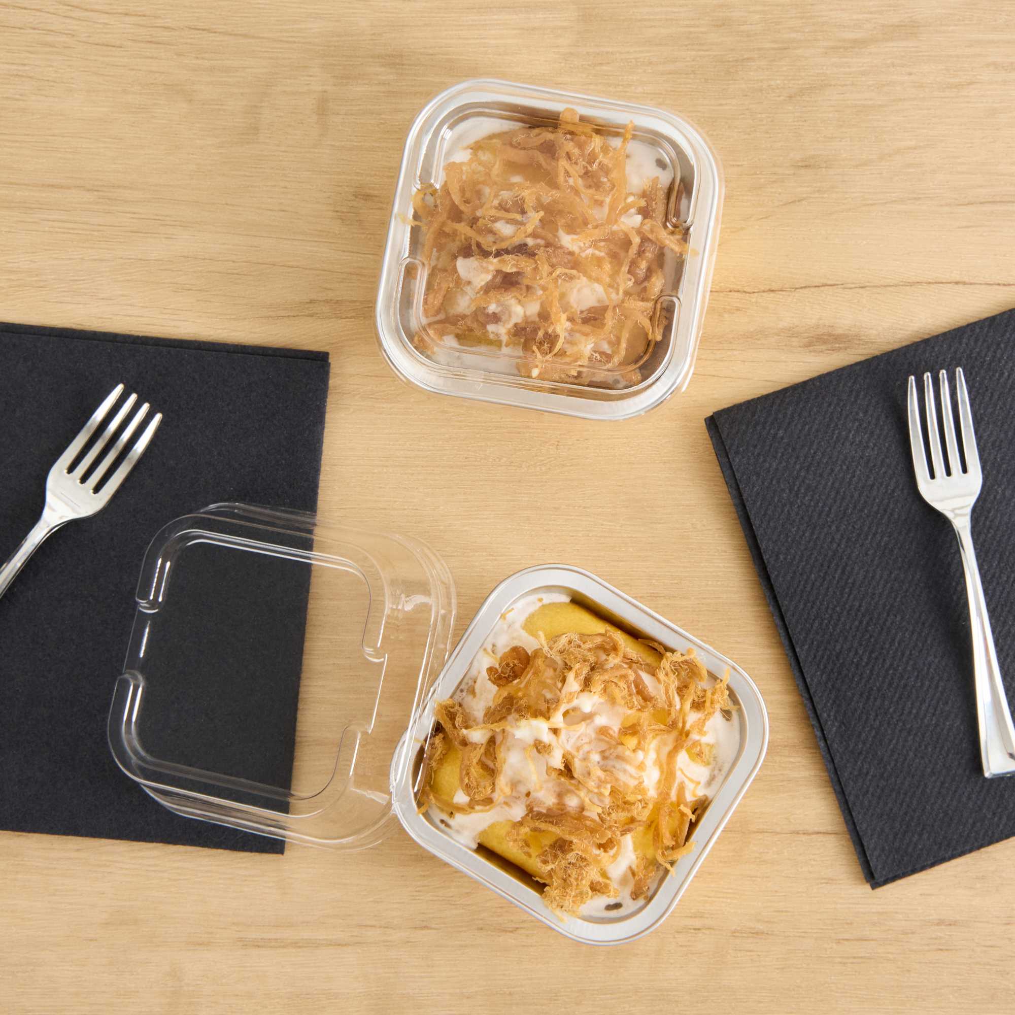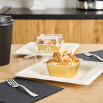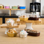 Flaunt your berrylicious muffins using our Pastry Tek 3-ounce Square Gold Aluminum Baking Cups. The aluminum construction of these baking cups enables fast heat transfer for evenly baked cakes. Plus, these gold cupcake liners are durable and do not react with your desserts, altering their taste. The clear plastic lids of these creme brulee ramekins secure your cakes during transit, avoiding any smudges or damage. With dome-shaped lids, these aluminum cups for baking allow you to decorate your cake with tall frosting. The sturdy construction of these foil baking cups enables them to withstand temperatures up to 500F, making them oven-ready and obviating the need for a baking tray. To make cold chocolate fudges, place these square baking cups in the freezer, as they can tolerate extreme temperatures. To accelerate the post-event cleanup process, simply dispose of these recyclable cupcake liners. These 3-ounce baking cups measure 3 inches in length by 3 inches in width by 1.25 inches in height and are perfect for weddings, parties, or gatherings. Shipped in a 100 count box. Lids are included.