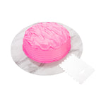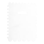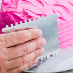 Create beautiful designs on your cakes with our Pastry Tek 4-Pattern Metal Cake Scraper and Icing Comb with Square and Scalloped Edge. Built with 4 different edges, this cake scraper tool can effortlessly produce thin stripes in the center of cakes or smooth rounded stripes along the sides of your cakes. This durable icing comb is constructed from premium metal that is naturally shatterproof and scratch-resistant to preserve its structure for long-lasting use. Equipped with a hanging hole, this cake icing scraper provides a space-saving solution for easily storing it in a convenient location. This frosting comb is great for decorating small or large cakes at your bakery, patisserie, cafe, or other foodservice establishment. Measuring 4.9 inches long by 3.8 inches wide, this metal cake scraper is shipped in a 1 count box. We recommend hand washing only to maintain its premium design.