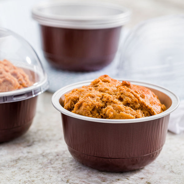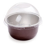 Serve baked goods in style with our Pastry Tek 5-ounce Foil Baking Cups with Lids. Constructed from high-quality aluminum, these cupcake baking cups are conveniently freezer-safe for cooling and oven-safe for easy baking without the need to transfer them to a different pan. Ideal for busy bakeries and catering companies, you can use these versatile foil cupcake cups to bake, decorate, store, and serve all types of delectable desserts. With a flat bottom, the desserts in these foil baking cups cook evenly. The coffee brown finish of these cupcake cups perfectly enhances the look of fudgy brownies and buttery cupcakes, while their clear plastic dome-shaped lid gives your customers a sneak peek inside. These cupcake foil cups are disposable, making cleanup after large events easier. Measuring 3.25 inches in diameter by 1.75 in height, these 5-ounce foil cupcake holders are disposable for easy cleaning. Sold in a 100 count box.