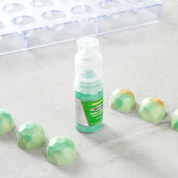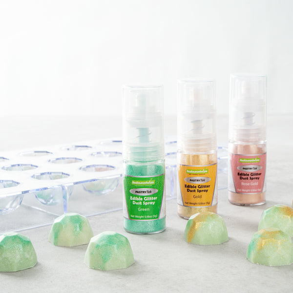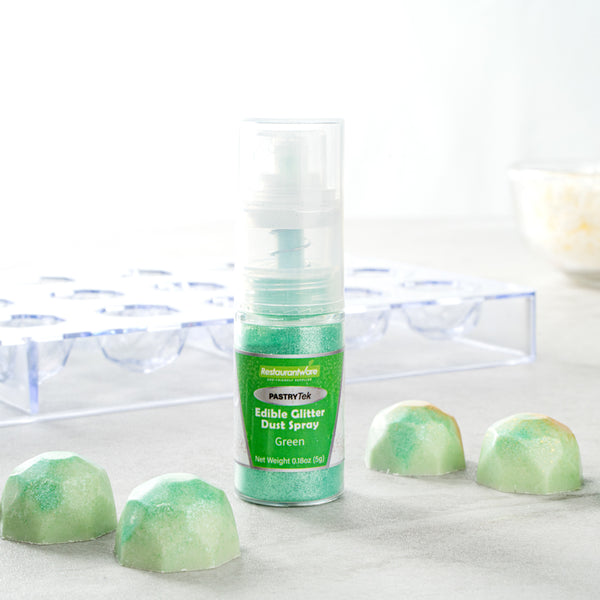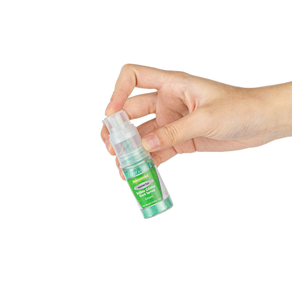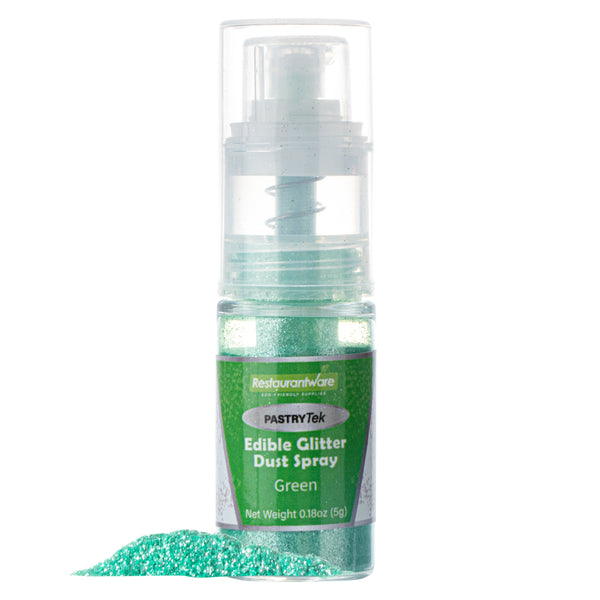 Display beautifully decorated cakes by using our Pastry Tek 5-Gram Green Edible Glitter Dust Spray. To add shine to entrees and desserts, this edible glitter is FDA-approved and food-grade. To give your beverages a magical appearance, this shimmer spray for cakes is water-soluble. Designed with a non-aerosol pump spray, this edible glitter powder releases a sizable amount of sparkles to evenly decorate cookies. To make sure customers with dietary restrictions don't miss out on your treats, this edible glitter dust is Kosher-certified and vegan. The green color of this food glitter allows you to match cocktails and appetizers with your event's theme. This green edible glitter contains 5 grams of sparkles. Sold in a 1 count box.