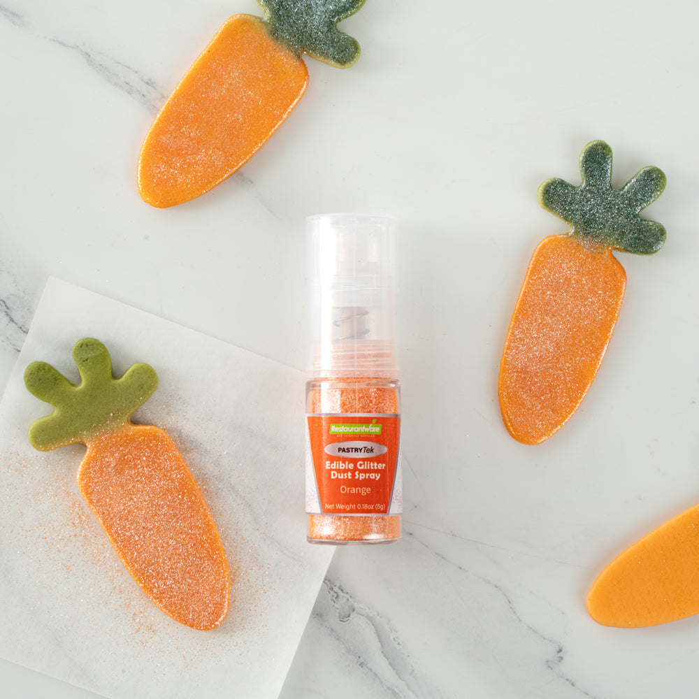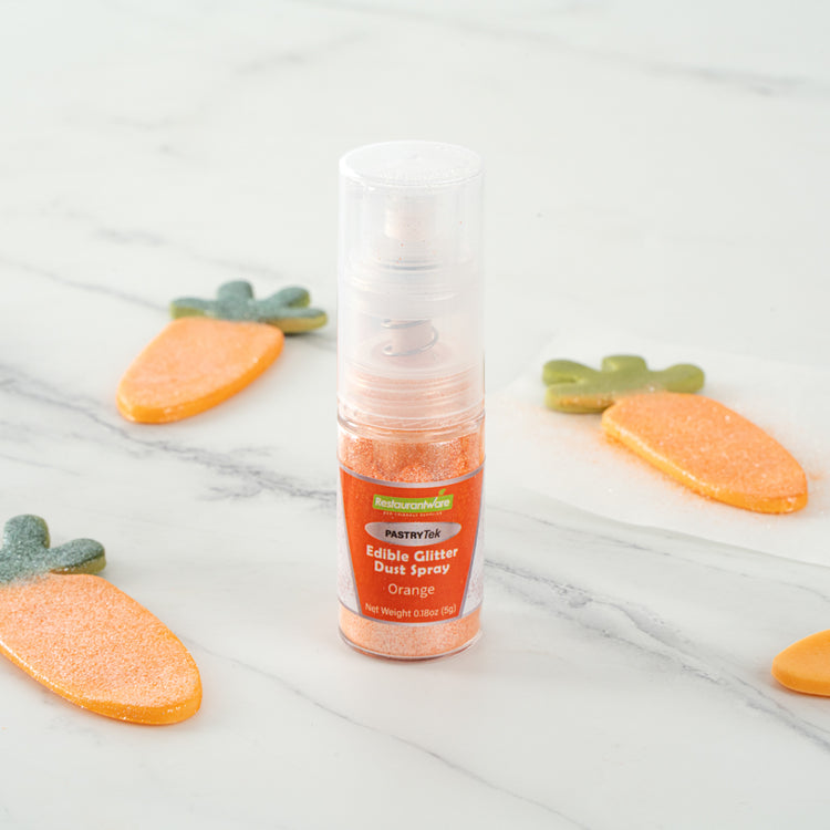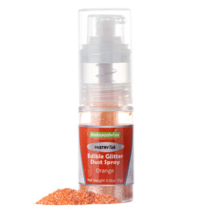 Craft unforgettable pastries and cocktails using our Pastry Tek 5-Gram Orange Edible Glitter Dust Spray. This glitter spray is conveniently edible to add to any hot or cold foods and drinks. With a water-soluble composition, this shimmer spray for cakes simply blends into all kinds of beverages. Constructed with a non-aerosol pump spray, this edible glitter for cakes is easy-to-use to dust on any cake or cocktail. To safely consume and fit customers' dietary needs, this cake glitter spray is FDA-approved, kosher-certified, and vegan. To maintain its high quality, store it in a cool, dry environment away from direct sunlight. Featuring an eye-catching orange shimmer finish, this cake glitter spray complements any special event. This edible glitter spray has a capacity of 5 grams, perfect for decorating many drinks, chocolates, or cakes. Sold in a 1 count box.
