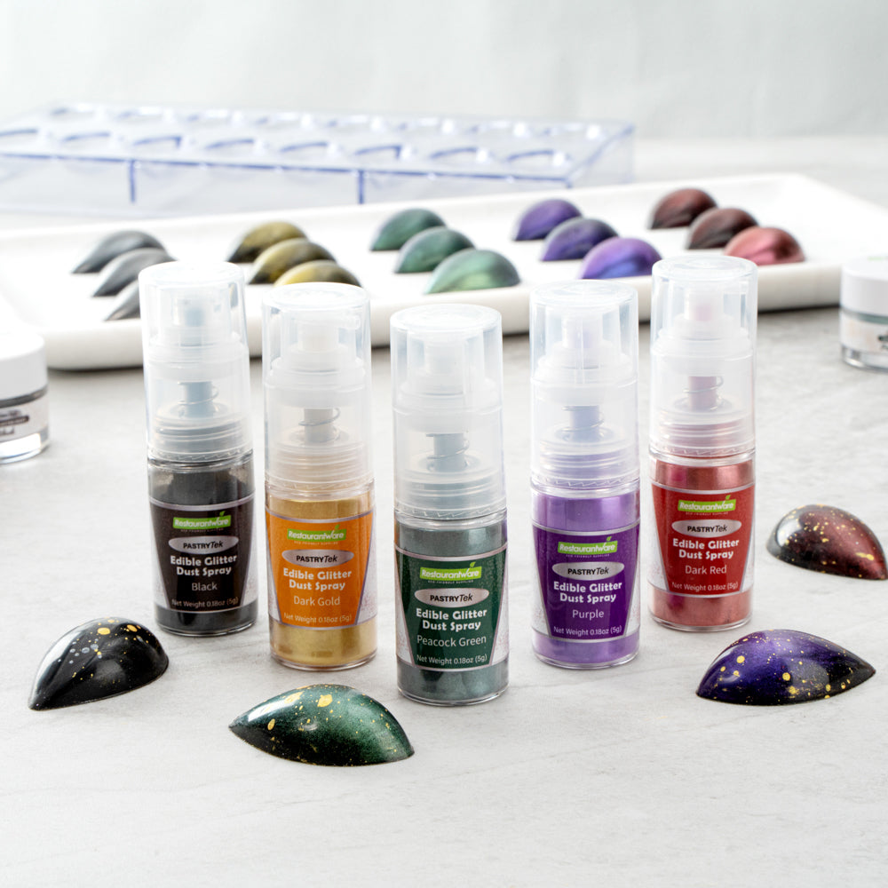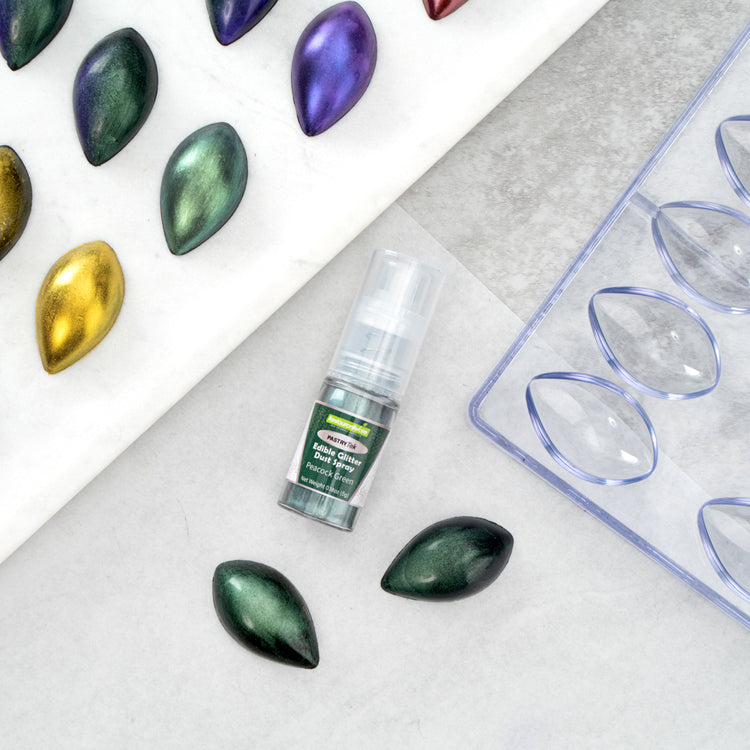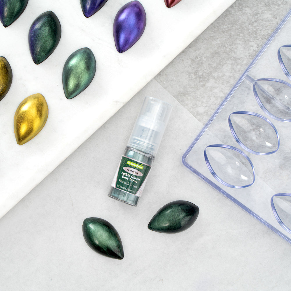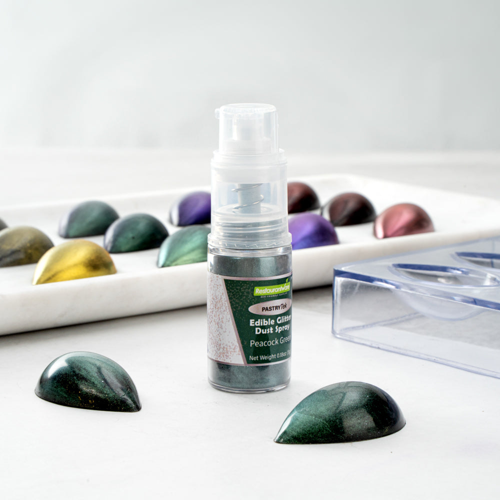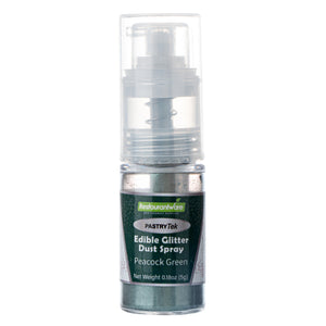 Be creative when decorating cakes, drinks, or other pastries by using our Pastry Tek 5-Gram Peacock Green Edible Glitter Dust Spray. To conveniently apply to various hot and cold pastries or beverages, this glitter spray is edible. Crafted with a non-aerosol pump, this edible glitter spray is easy-to-use to effortlessly dust on any preferred drink or sweet treat. This edible glitter spray for cakes is FDA-approved, kosher-certified, and vegan to safely consume and meet customers' food restrictions. To maintain its high quality, store it in a cool, dry environment away from direct sunlight. With a bold peacock green shimmer finish, this glitter spray is ideal to use in any nature-filled event. This edible glitter spray has a capacity of 5 grams, perfect for decorating many delicious edibles. Sold in a 1 count box.