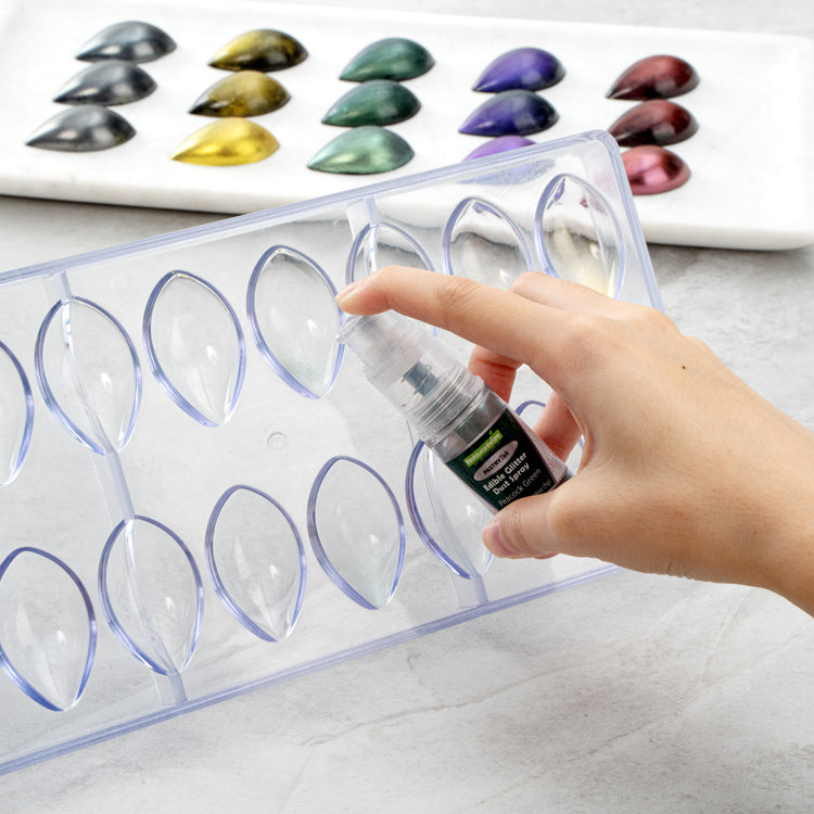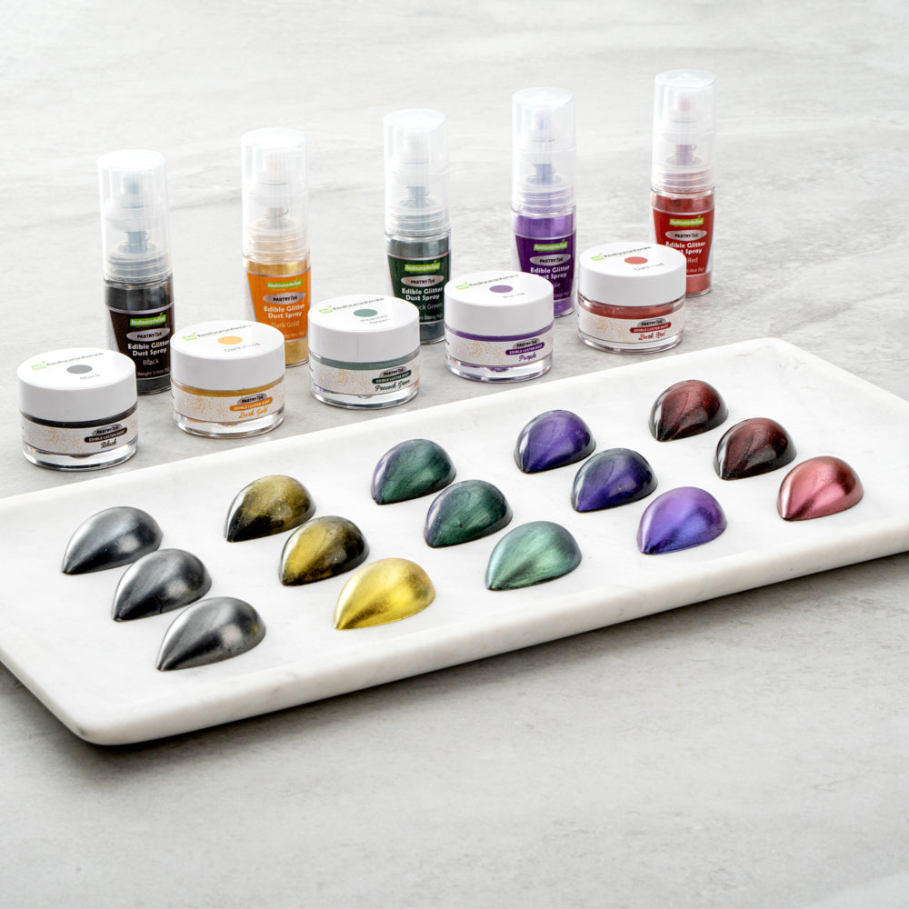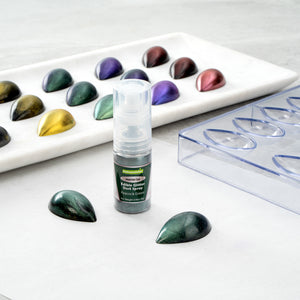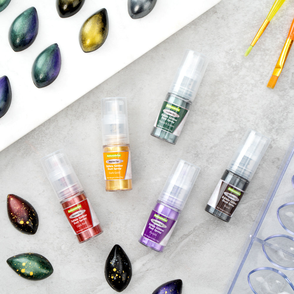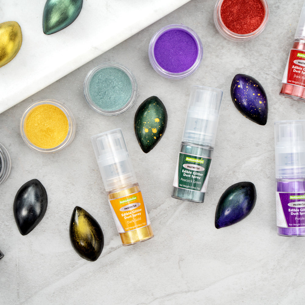 Be creative when decorating cakes, drinks, or other pastries by using our Pastry Tek 5-Gram Peacock Green Edible Glitter Dust Spray. To conveniently apply to various hot and cold pastries or beverages, this glitter spray is edible. Crafted with a non-aerosol pump, this edible glitter spray is easy-to-use to effortlessly dust on any preferred drink or sweet treat. This edible glitter spray for cakes is FDA-approved, kosher-certified, and vegan to safely consume and meet customers' food restrictions. To maintain its high quality, store it in a cool, dry environment away from direct sunlight. With a bold peacock green shimmer finish, this glitter spray is ideal to use in any nature-filled event. This edible glitter spray has a capacity of 5 grams, perfect for decorating many delicious edibles. Sold in a 1 count box.