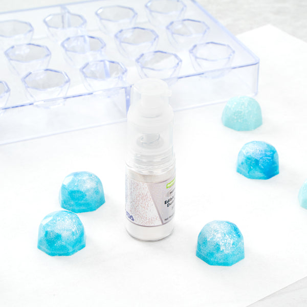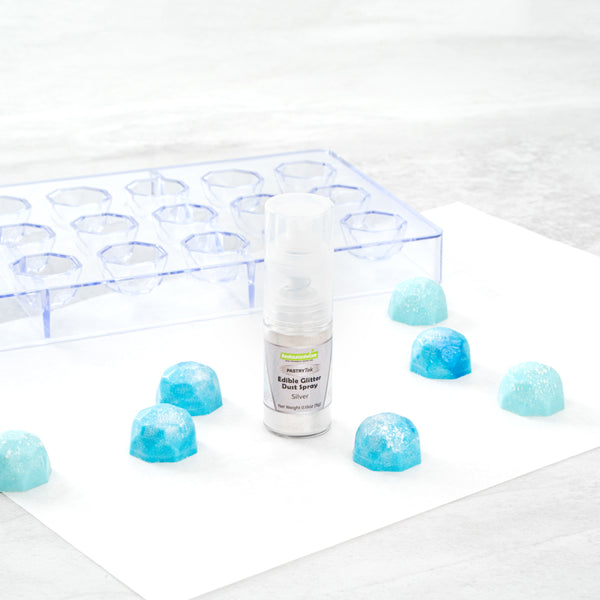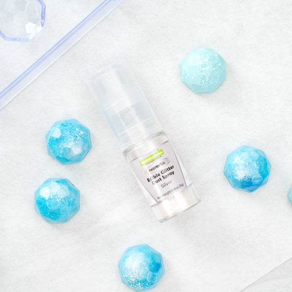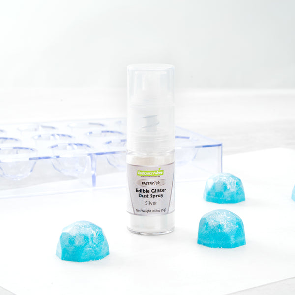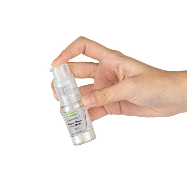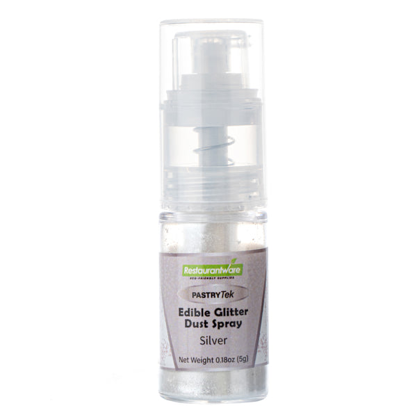 Make your pastries and cocktails pop by using our Pastry Tek 5-Gram Silver Edible Glitter Dust Spray. This glitter spray is edible to bring your food presentations to life. With a water-soluble composition, this edible glitter spray is perfect for mixing wet ingredients. Built with a non-aerosol pump, this edible glitter spray for cakes has an easy-to-use design to decorate cakes, drinks, or candies. This edible glitter spray for cakes is FDA-approved, kosher-certified, and vegan to meet customers' diet restrictions. To maintain its high quality, store it in a cool, dry environment away from direct sunlight. With an elegant silver shimmer finish, this glitter spray effortlessly suits any kind of event. This edible glitter spray has a capacity of 5 grams, ideal for all kinds of big edible projects. Sold in a 1 count box.