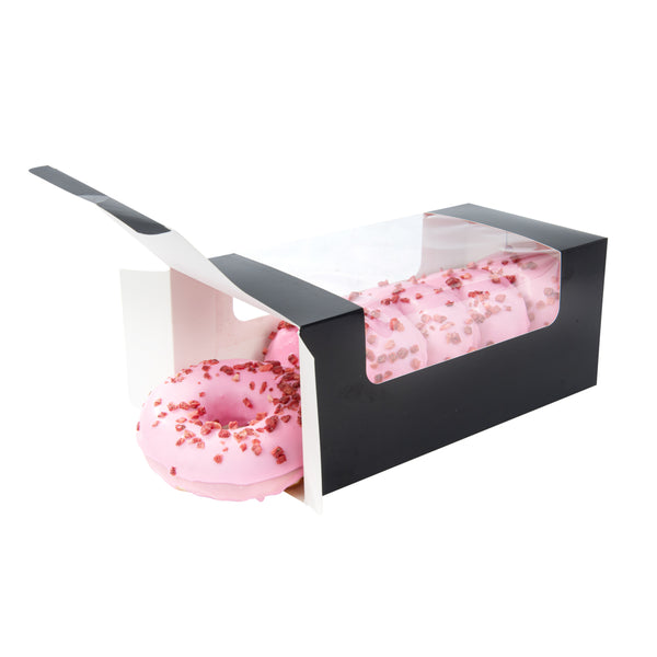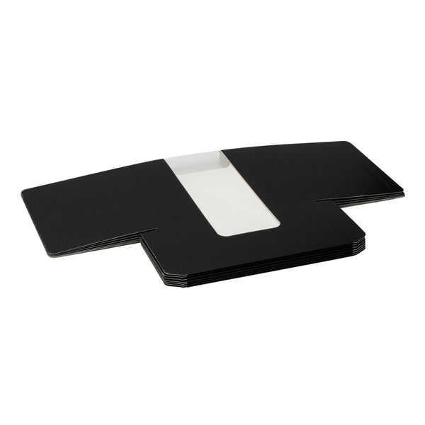 Elegantly showcase sweets using our Pastry Tek Black Paper Pastry / Cake Boxes. Crafted with a clear window, these bakery boxes offer optimal visibility to efficiently display and identify desserts. To prevent oils from seeping through, these cookie boxes with windows are grease-resistant. These paper cake boxes are recyclable for a simple way to reduce unnecessary waste in your establishment. With a black finish, these cake boxes provide a refined look while highlighting the packaged baked goods. These cupcake boxes are shipped flat for space-saving storage in your cafe or bakery and are easy to assemble. The black cake boxes measure 9.75 inches in length by 4.75 inches in width by 4 inches in height. Sold in a 100 count box.