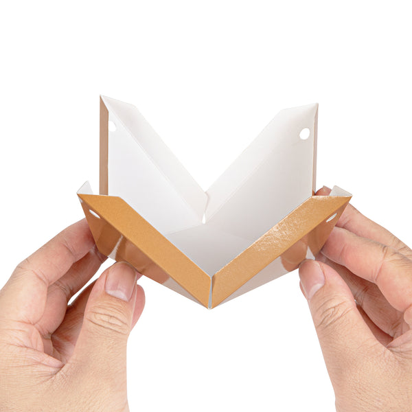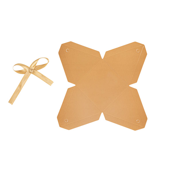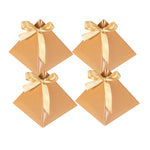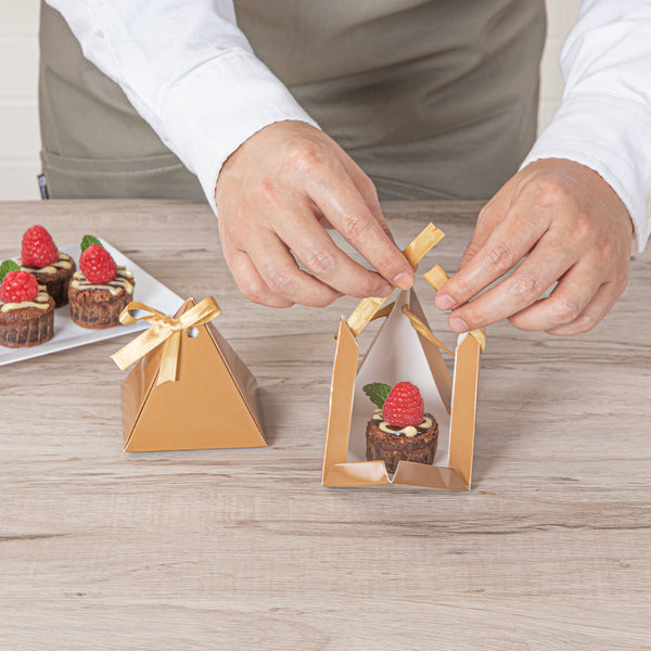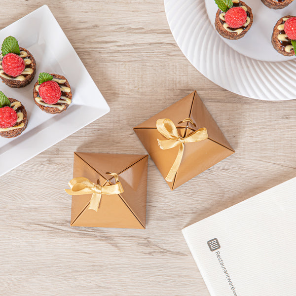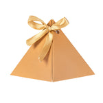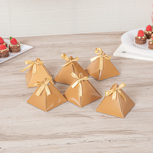 Hand out elegant party favors with our Pastry Tek Brown Pyramid Paper Candy and Gift Boxes. These one-of-a-kind party favor containers have a stylish pyramid design that adds a chic touch to the packaging. The chocolate brown finish on these biodegradable pyramid favor boxes complements your rich chocolate truffles, candies, and gifts. Featuring a bronze satin ribbon, the sides of these pyramid gift boxes are easily tied or unraveled to reveal your gourmet treats. Designed from premium paper, these recyclable brown party favor boxes are durable to hold bite-sized treats. After large events, these favor boxes are conveniently disposable. These candy favor boxes are shipped flat to save you space. These favor containers measure 3 inches long by 3 inches wide and 3 inches tall. Ships in a 100 count box. This item will only degrade outside of the traditional solid waste stream.