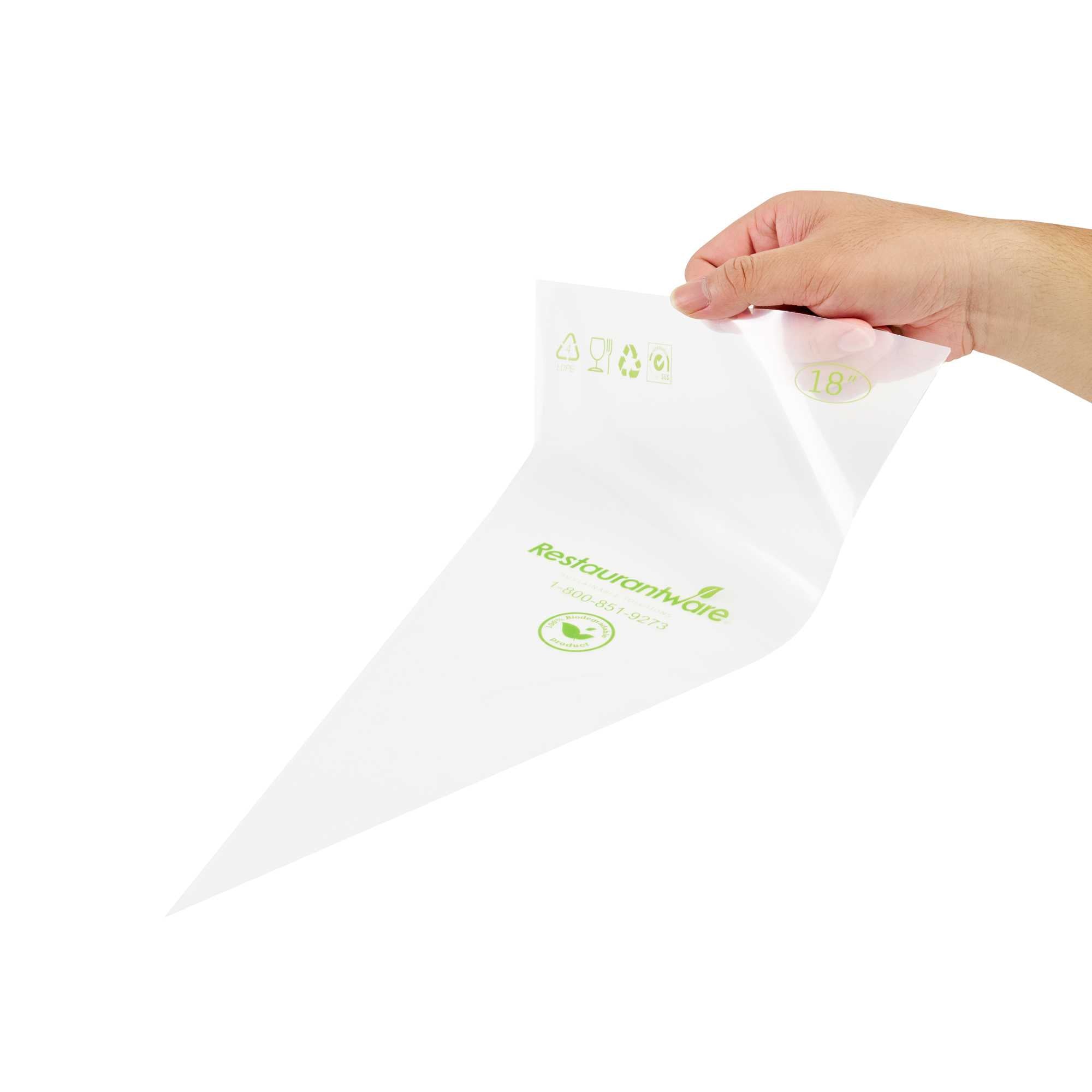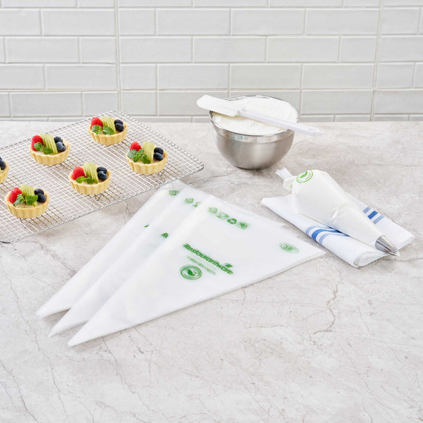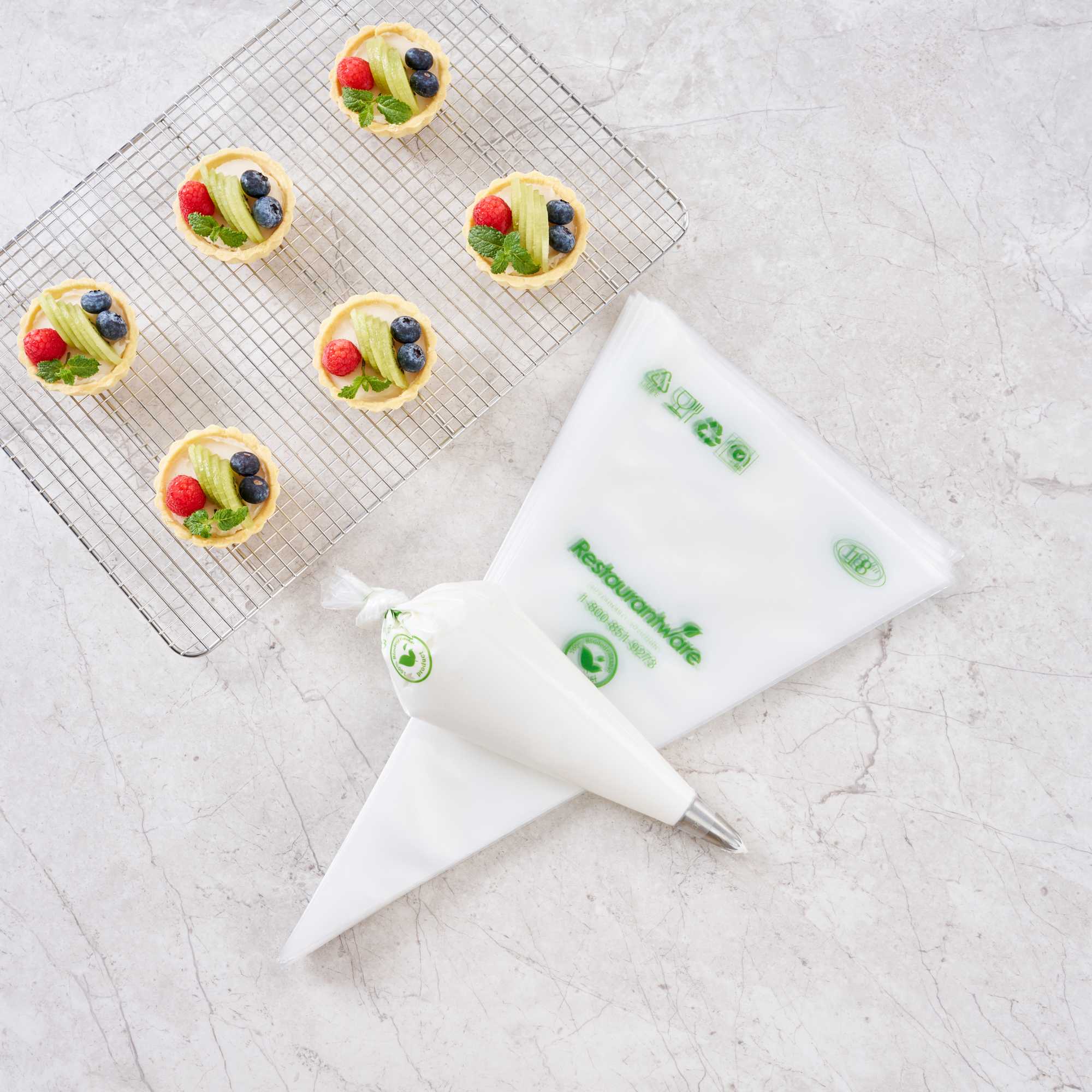 Pipe sweet swirls and dynamic ruffles in an eco-friendly way with our Pastry Tek Clear Plastic Pastry Piping Bags. Featuring a biodegradable construction, these disposable pastry bags are great eco-friendly options for any bakery, cafe, or cake shop. With a durable design, you can rely on these plastic piping bags to keep their shape and avoid tears when cutting the tip to any size. These disposable frosting bags offer a clear view for when you have to refill sweet icings. The slip-resistant design of these cake decorating bags provides a better grip to decorate treats easily. These icing bags measure 18 inches long by 8.75 inches wide. Shipped in a 100 count box. This item will only degrade outside of the traditional solid waste stream.