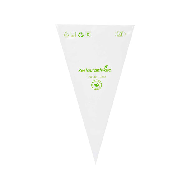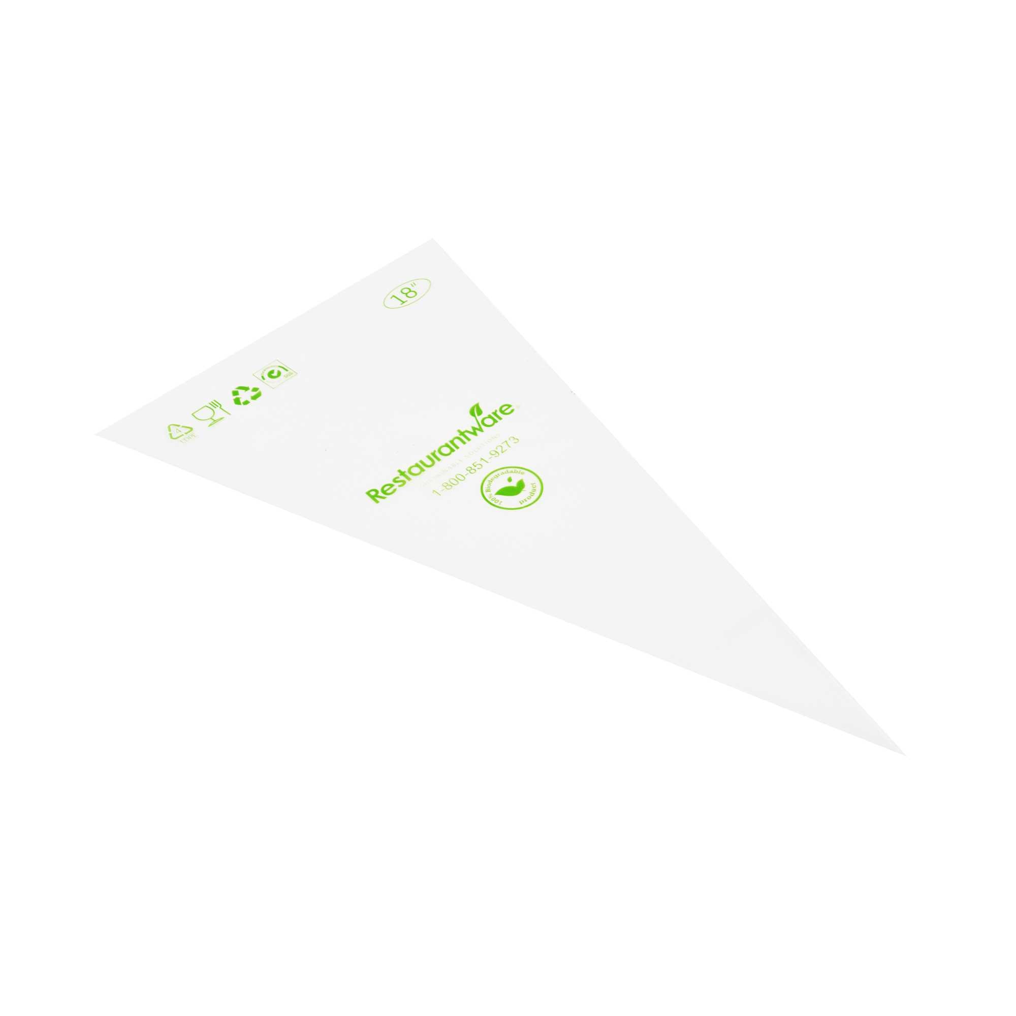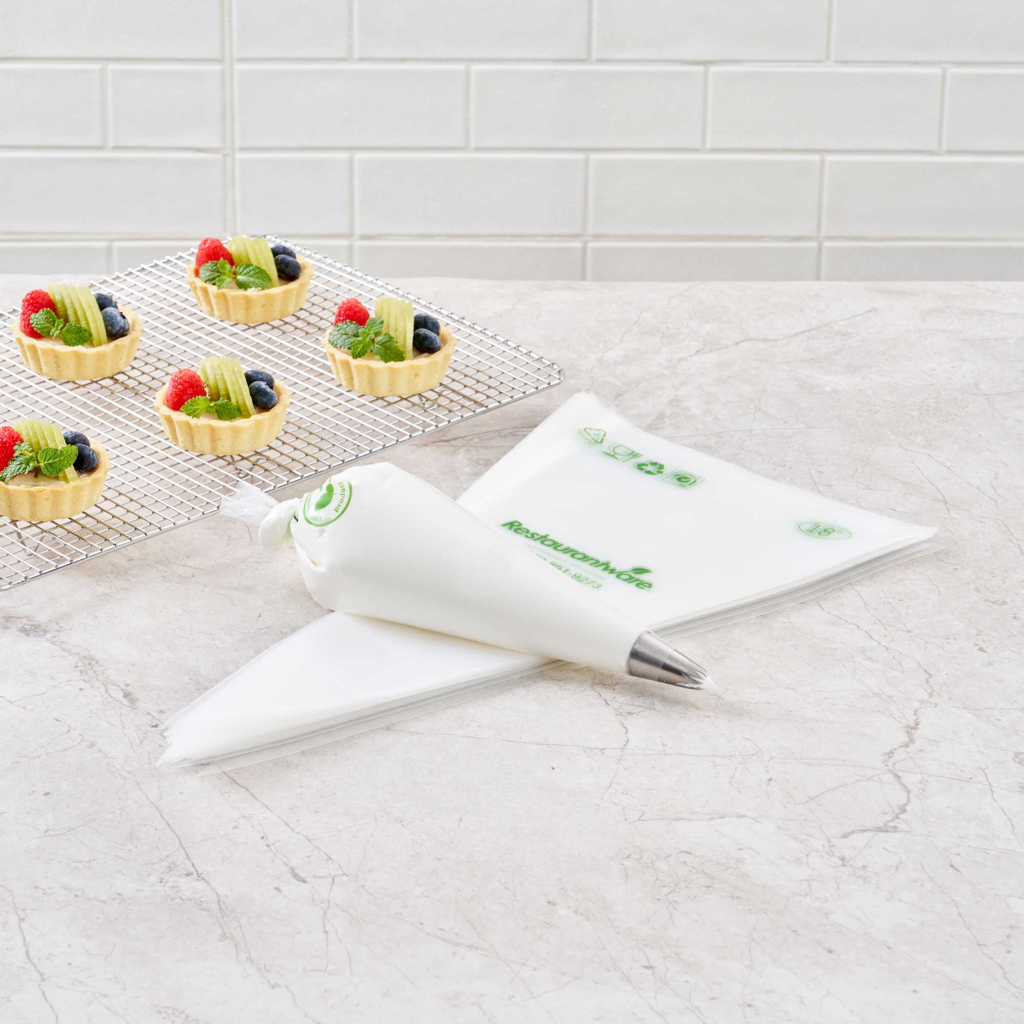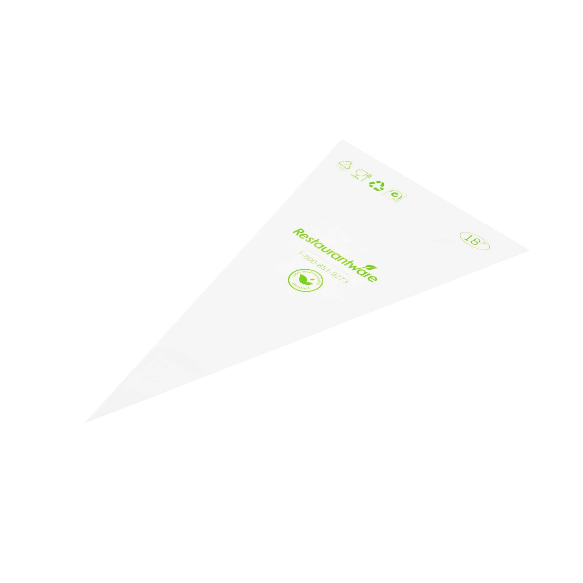 Pipe sweet swirls and dynamic ruffles in an eco-friendly way with our Pastry Tek Clear Plastic Pastry Piping Bags. Featuring a biodegradable construction, these disposable pastry bags are great eco-friendly options for any bakery, cafe, or cake shop. With a durable design, you can rely on these plastic piping bags to keep their shape and avoid tears when cutting the tip to any size. These disposable frosting bags offer a clear view for when you have to refill sweet icings. The slip-resistant design of these cake decorating bags provides a better grip to decorate treats easily. These icing bags measure 18 inches long by 8.75 inches wide. Shipped in a 100 count box. This item will only degrade outside of the traditional solid waste stream.