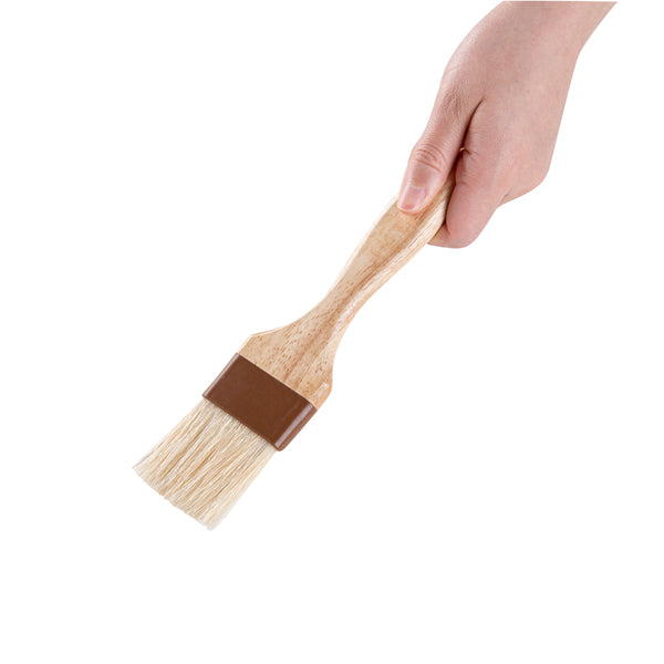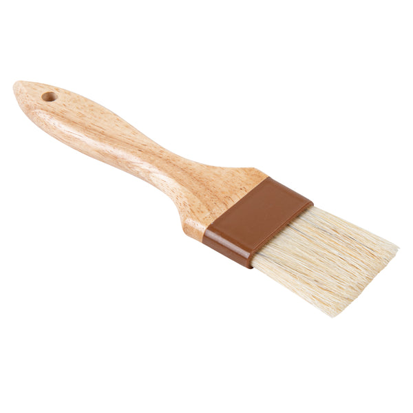 Coat your pastries with melted butter by using our Pastry Tek Natural Wood 2" Wide Pastry / Basting Brush. The boar bristles of this wooden pastry brush have high absorbency and retain the marinade or sauces, allowing you to coat pastries in a controlled manner. This wide pastry brush is not overly dense to avoid the tearing or streaking of pastry dough. Withstanding heat, this baking brush can be used to butter grilled foods without burning your fingers. Designed to suit all your basting and baking needs, these bristles can conveniently baste your meat or apply egg wash over dough, or seal pastries. This boar bristle pastry brush has a plastic ferrule that won't rust, holding the bristles together to avoid shedding. Made from rubber wood, the lacquered handle of this pastry basting brush is sturdy and has a non-slip surface for a comfortable maneuver. The built-in hanging hole of this wooden basting brush facilitates easy access and saves space in your kitchen. Measuring 8.75 inches in length by 2 inches in width by 2 inches in height, this pastry brush is a multipurpose tool in any commercial kitchen. Shipped in a 1 count box.