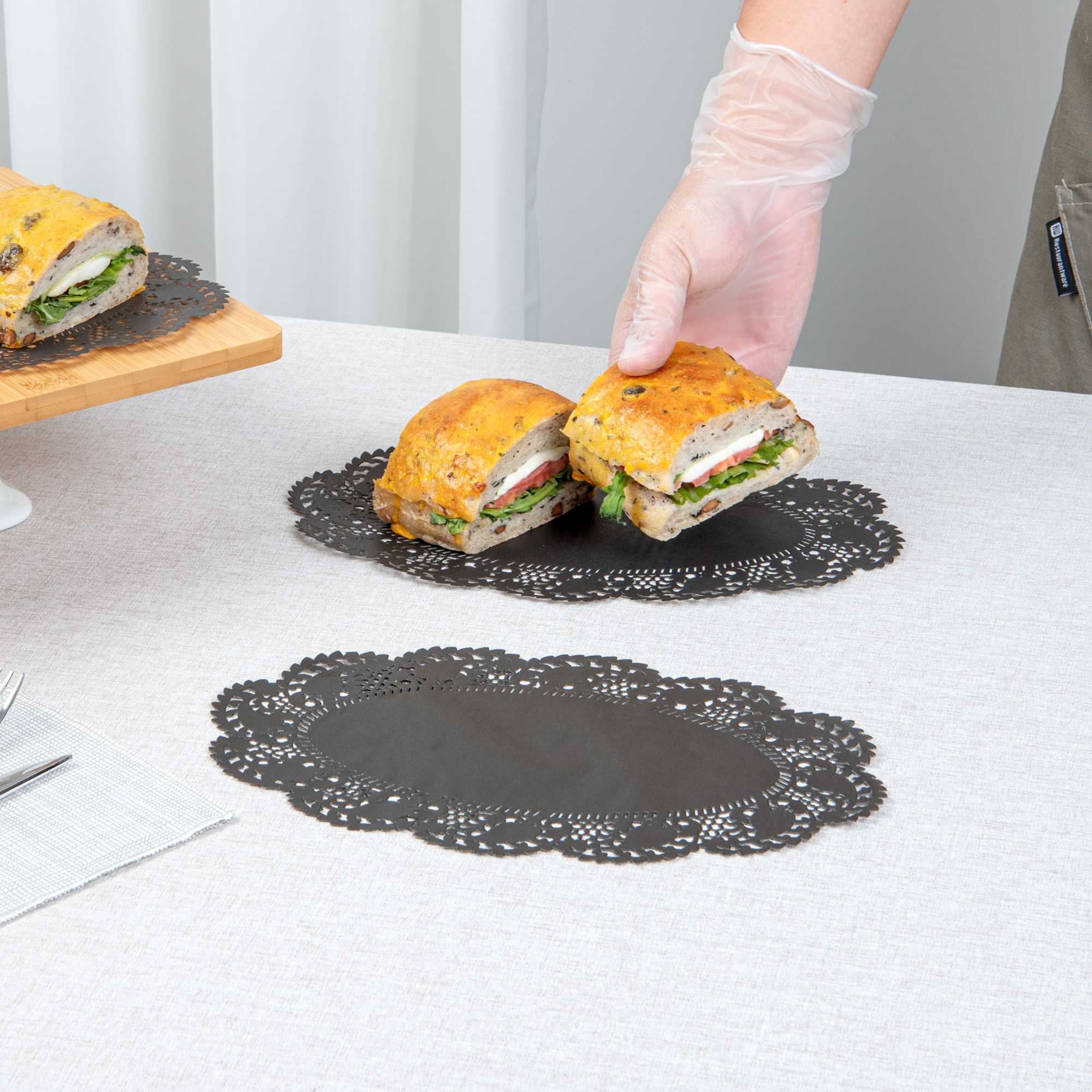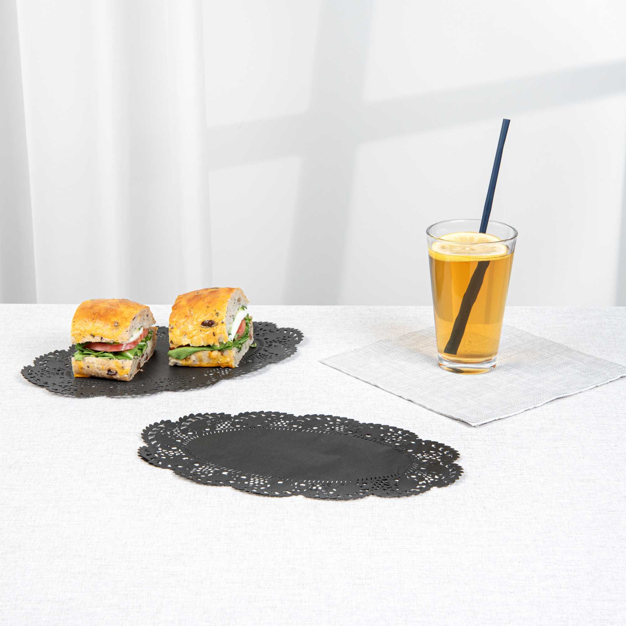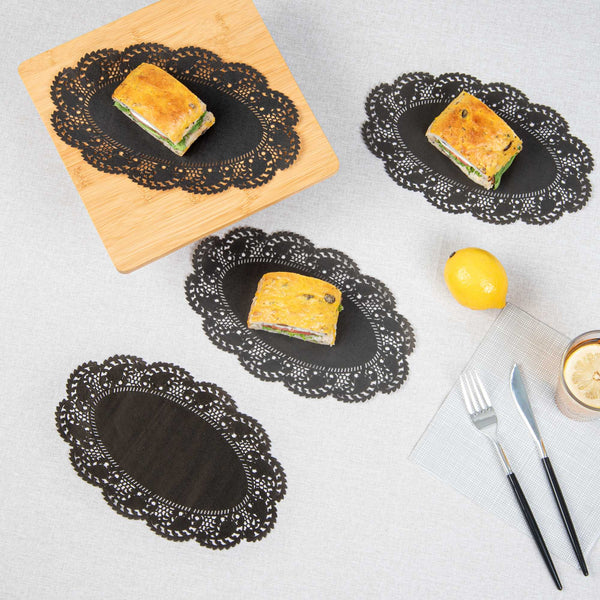 Elevate your dessert displays with our Pastry Tek Oval Black Paper Doilies. Crafted from high-quality paper, these table doilies provide durability while showcasing desserts at bakeries or catered luncheons without tearing or losing their structural integrity. Featuring intricate lace-like details, these lace doilies enhance the visual appeal of food presentations while serving as functional barriers, protecting surfaces, and absorbing moisture. The black colored paper doilies' finish is versatile, enabling them to complement a wide range of table settings and themes, making them ideal for various events and occasions. Perfect for busy restaurants and food establishments, these disposable paper doilies eradicate the hassle of post-event cleanup, offering a convenient and time-saving solution. Use these small doilies under cupcakes, petit fours, macarons, and other small treats to add an elegant touch. Measuring 10.5 inches in length by 6.5 inches in width, these oval doilies are the perfect size for a variety of applications. Sold in a 4,000 count box.