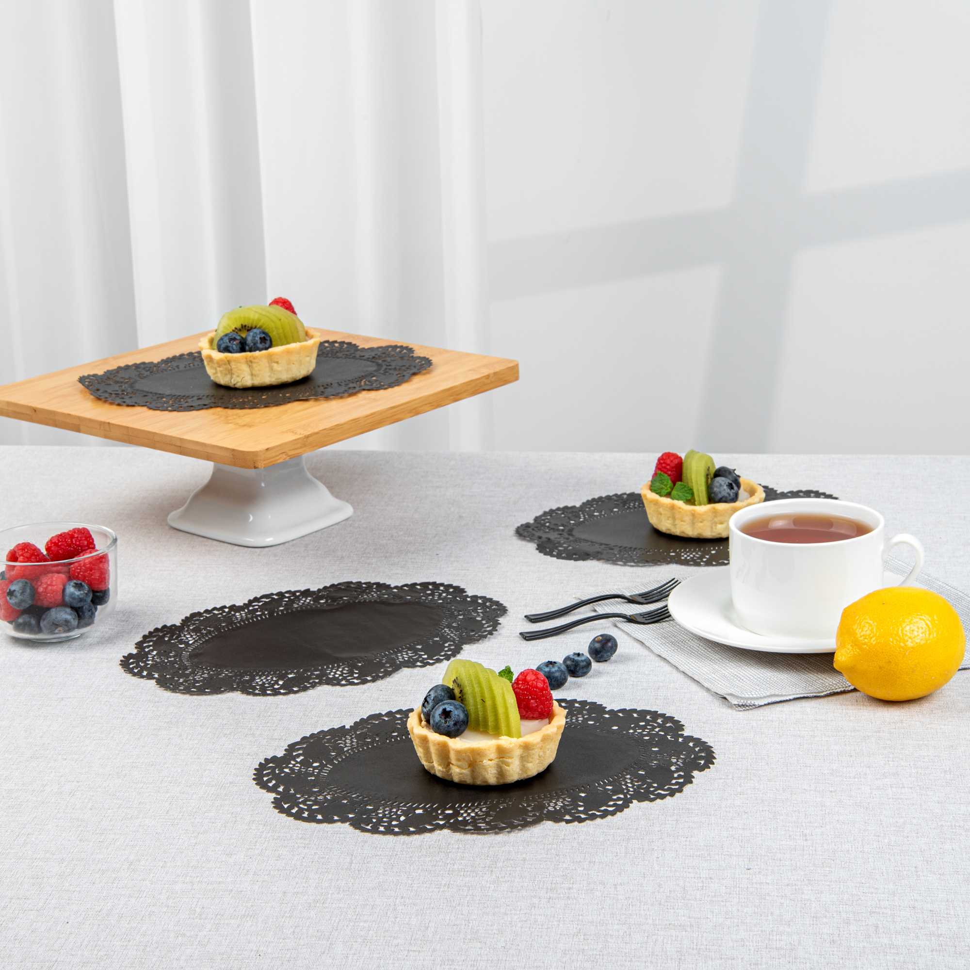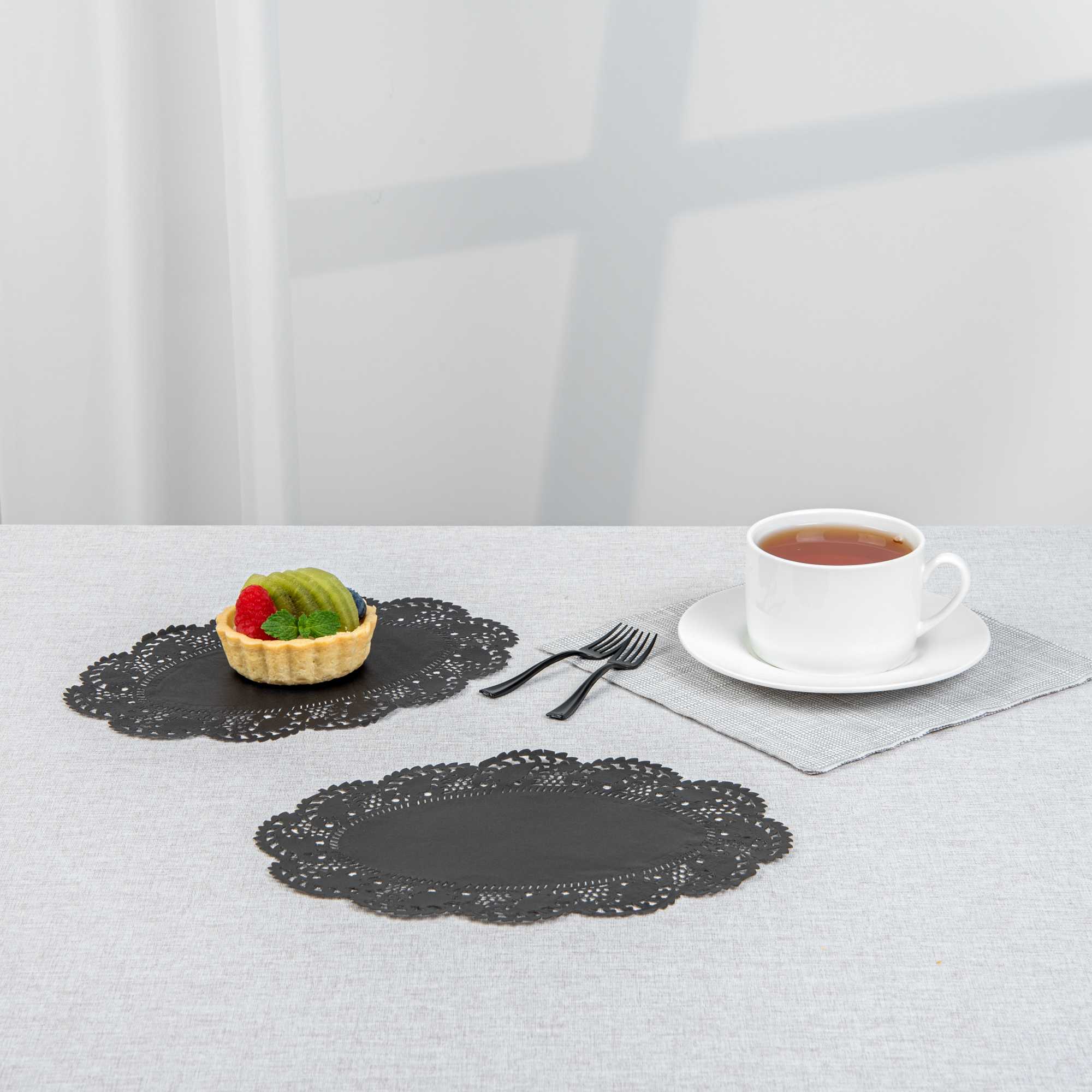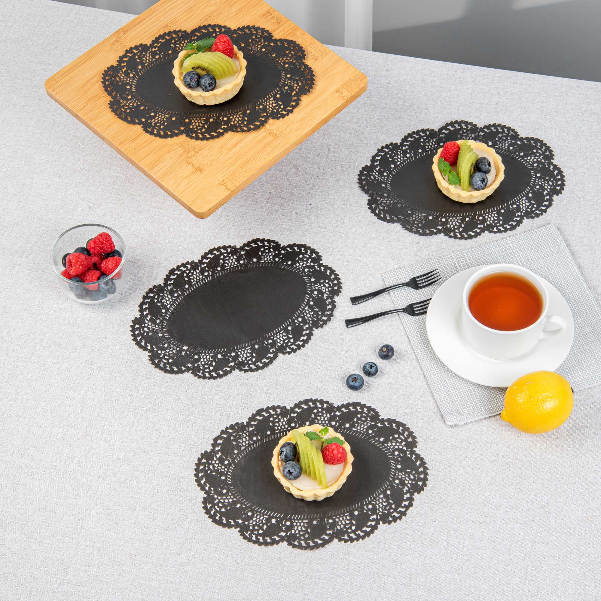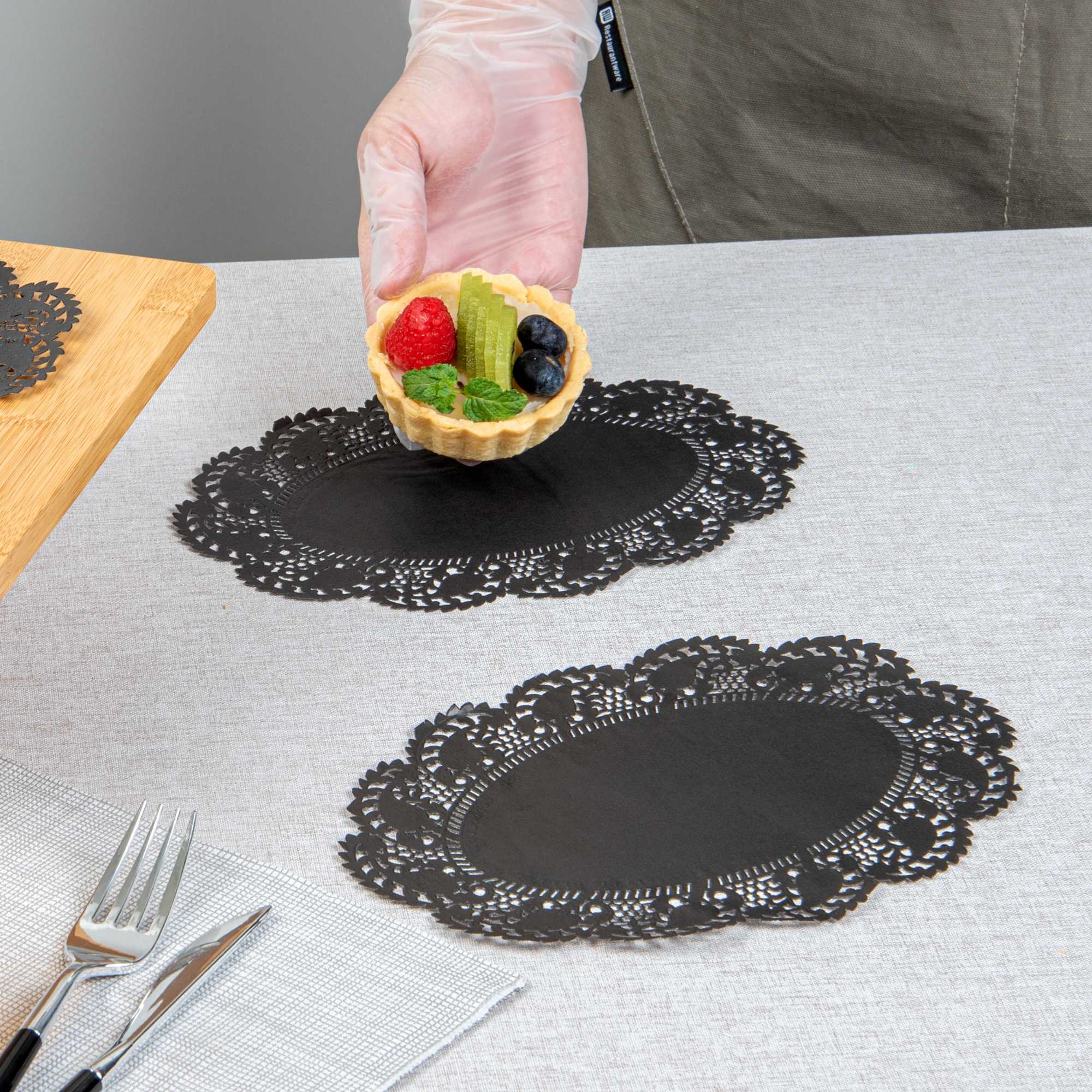 Elevate your dessert displays with our Pastry Tek Oval Black Paper Doilies, designed to add an elegant touch to any presentation. Crafted from high-quality paper, these lace doilies offer exceptional durability, ensuring that desserts at bakeries or catered luncheons remain beautifully presented without tearing. Featuring intricate lace-like details, these table doilies not only increase the visual appeal of food presentations but also serve as functional barriers that protect surfaces and absorb moisture. The versatile black colored paper doilies seamlessly complement a wide range of table settings and themes, making them ideal for various events and occasions. Disposable by design, these small doilies eradicate the hassle of post-event cleanup, providing a convenient and time-saving solution for busy hosts and food establishments. Perfect for placing under cupcakes, petit fours, macarons, and other small treats, these lace doilies enhance both functionality and aesthetics. Measuring 9 inches in length by 6.5 inches in width, these oval doilies are the perfect size for a variety of desserts. Sold in a 4,000 count box.