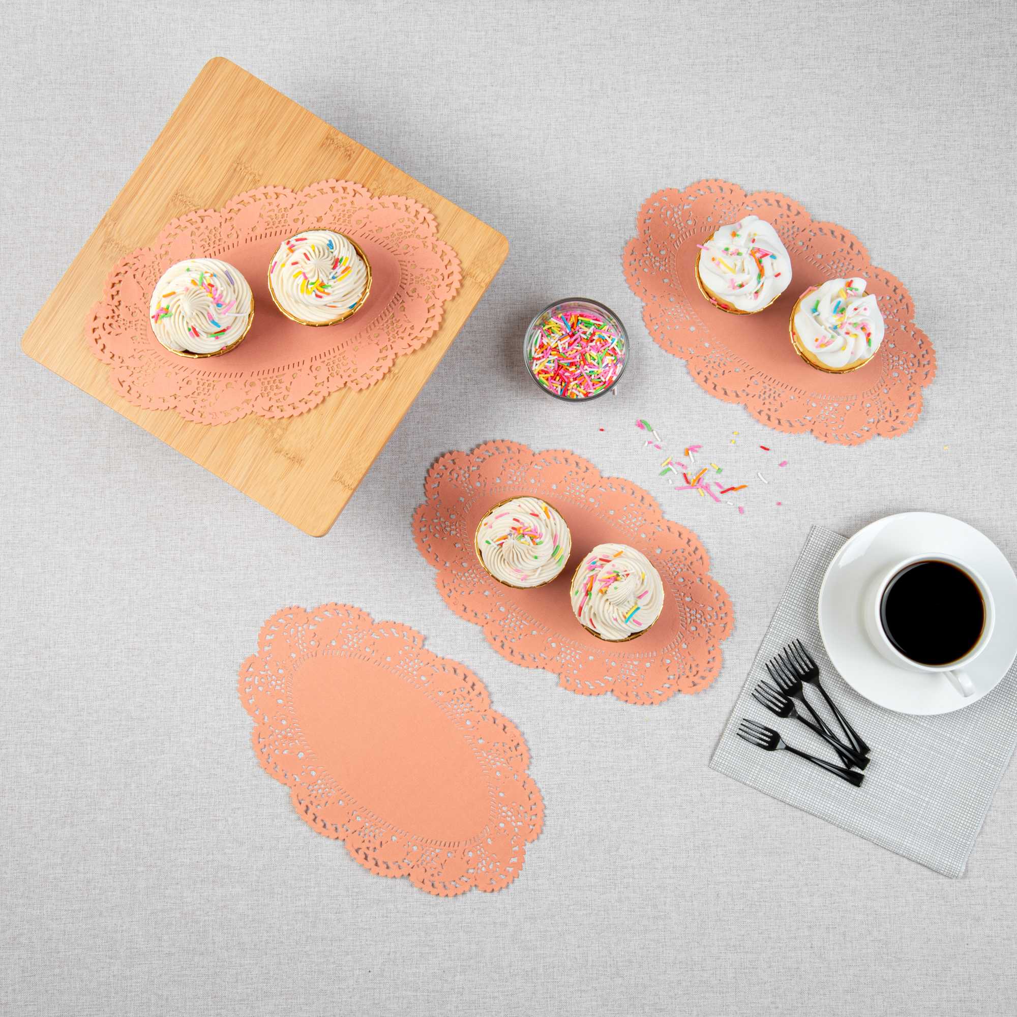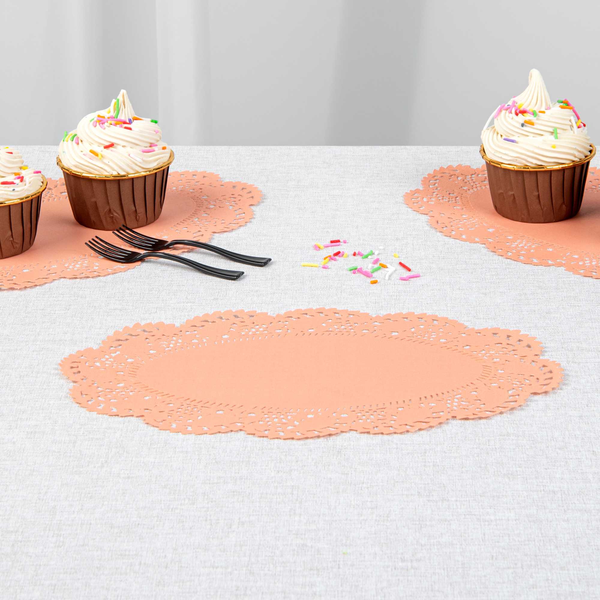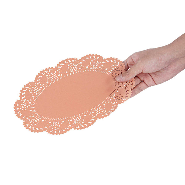 Enhance your dessert presentations with our Pastry Tek Oval Coral Paper Doilies, designed to add an elegant touch to any display. Crafted from high-quality paper, these lace doilies provide durability while showcasing desserts at bakeries without tearing or losing structural integrity. The intricate lace-like details of these table doilies increase the visual appeal of food presentations while serving as functional barriers, protecting surfaces, and absorbing moisture. Featuring a versatile colored finish, these coral colored paper doilies effortlessly complement a wide range of table settings and themes, making them perfect for various events and occasions. These disposable small doilies eradicate the hassle of post-event cleanup, offering a convenient and time-saving solution for busy cafes and food establishments. Ideal for use under cupcakes, petit fours, macarons, and other small treats, these paper doilies measure 10.5 inches in length by 6.5 inches in width. Sold in a 100 count box.