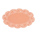 Enhance your dessert presentations with our Pastry Tek Oval Coral Paper Doilies, designed to add an elegant touch to any display. Crafted from high-quality paper, these lace doilies provide durability while showcasing desserts at bakeries without tearing or losing structural integrity. The intricate lace-like details of these table doilies increase the visual appeal of food presentations while serving as functional barriers, protecting surfaces, and absorbing moisture. Featuring a versatile colored finish, these coral colored paper doilies effortlessly complement a wide range of table settings and themes, making them perfect for various events and occasions. These disposable small doilies eradicate the hassle of post-event cleanup, offering a convenient and time-saving solution for busy cafes and food establishments. Ideal for use under cupcakes, petit fours, macarons, and other small treats, these paper doilies measure 10.5 inches in length by 6.5 inches in width. Sold in a 4,000 count box.
