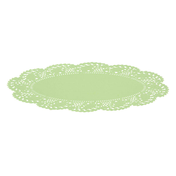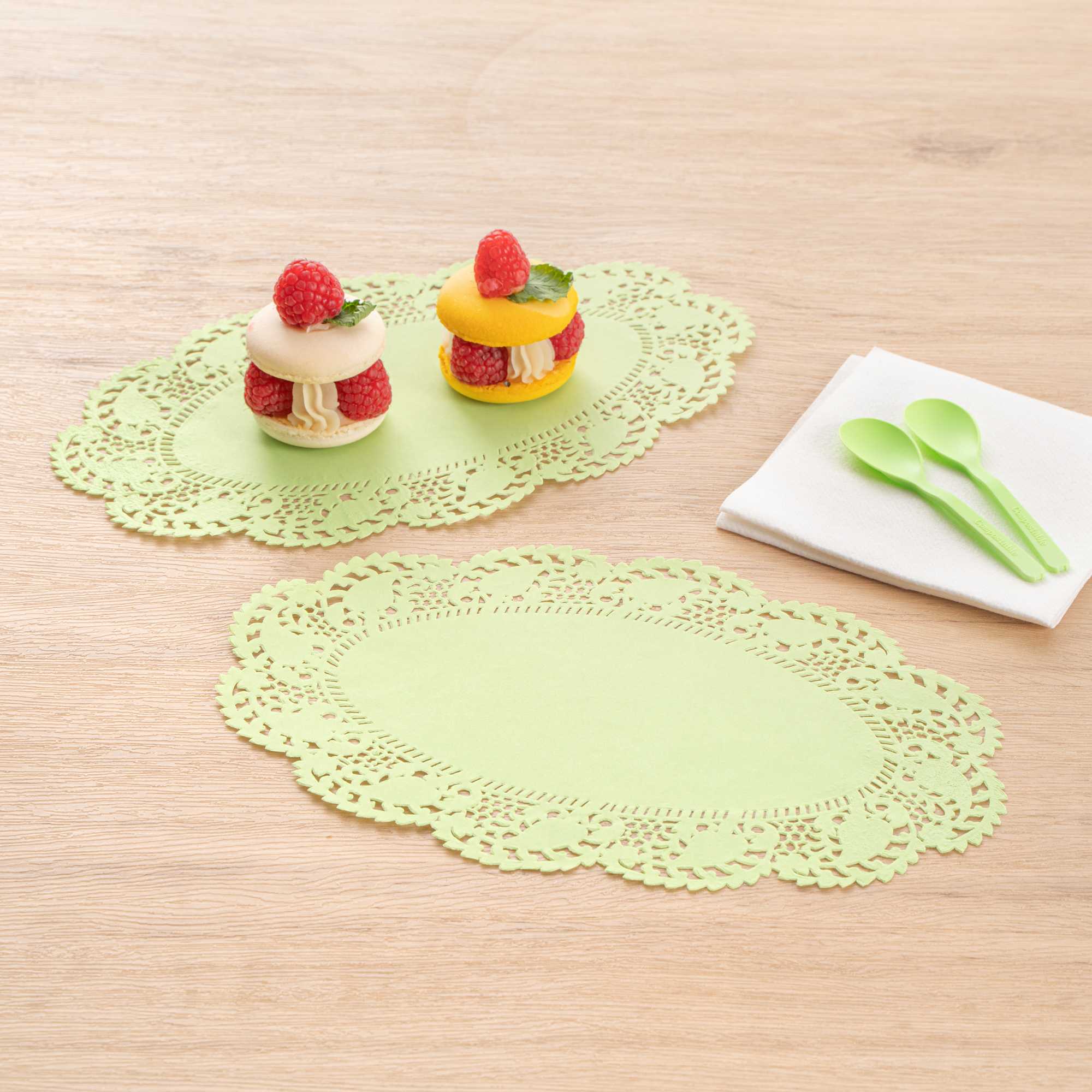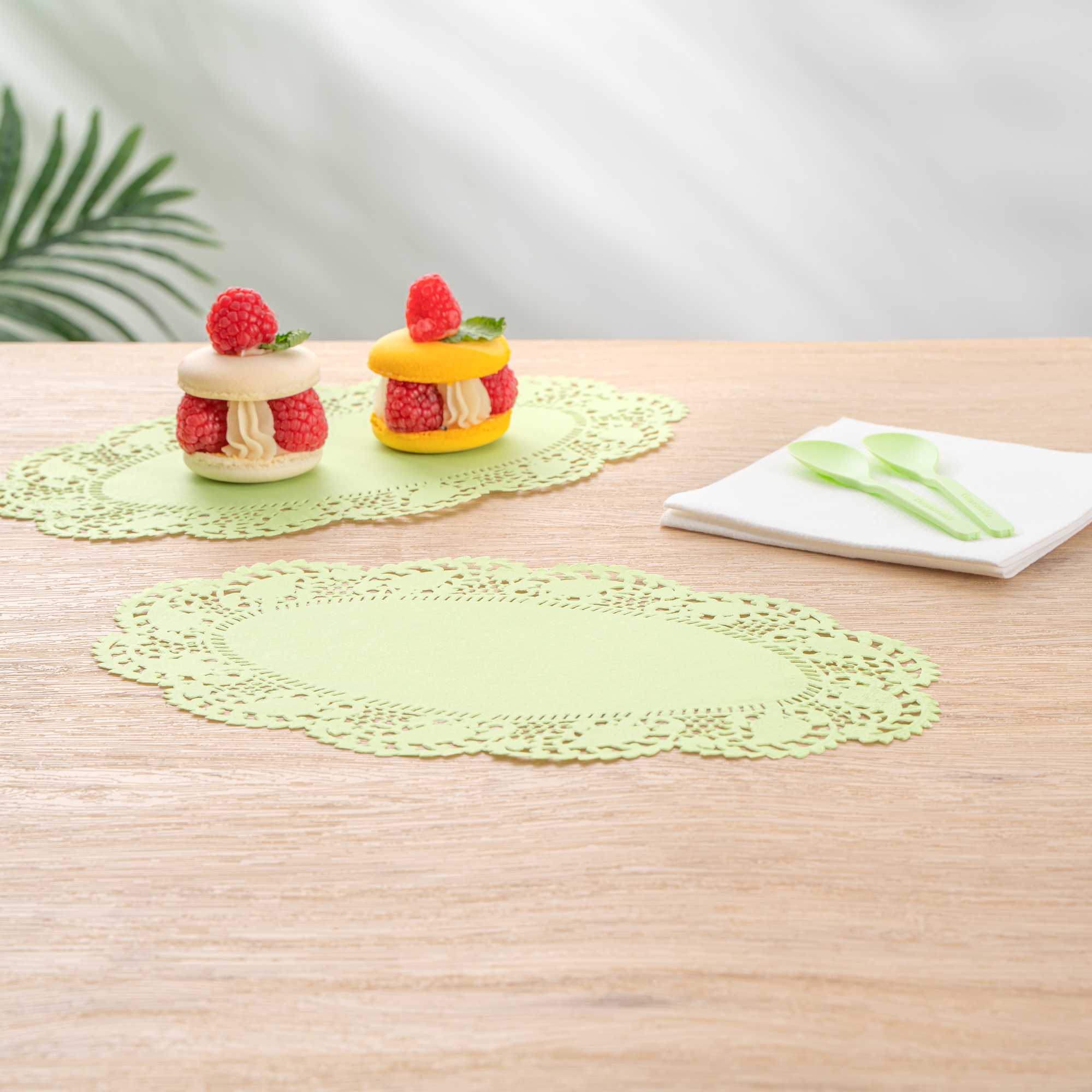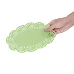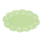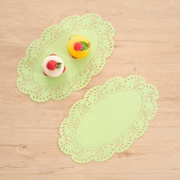 Enhance your dessert displays with our Pastry Tek Oval Green Paper Doilies, perfect for adding an elegant touch to any food presentation. Crafted from high-quality paper, these lace doilies provide durability while showcasing desserts at bakeries or catered luncheons without tearing or losing their structural integrity. With intricate lace-like details, these table doilies increase the visual appeal of food presentations while serving as functional barriers, protecting surfaces and absorbing moisture. The versatile green colored finish of these paper doilies complements a wide range of table settings and themes, making them ideal for various events and occasions. Designed for convenience, these disposable doilies eradicate the hassle of post-event cleanup, offering a time-saving solution for busy events and food establishments. These small doilies are perfect for use under cupcakes, petit fours, macarons, and other small treats. Measuring 10.5 inches in length by 6.5 inches in width, these lace doilies provide ample space for displaying a variety of desserts. Sold in a 4,000 count box.
