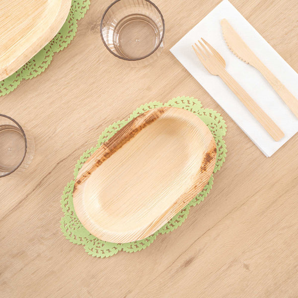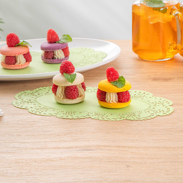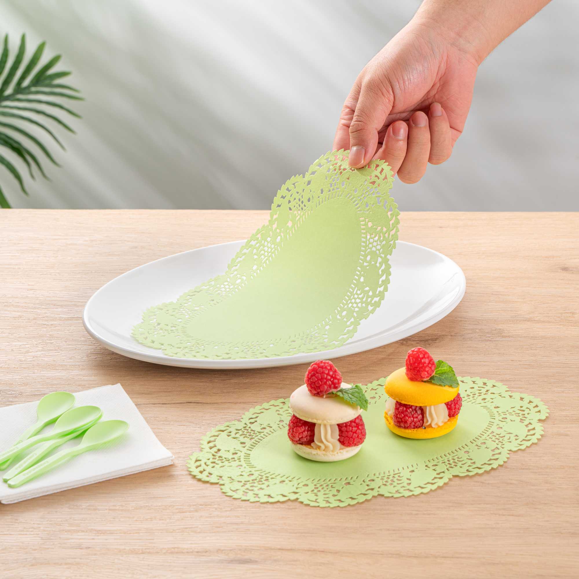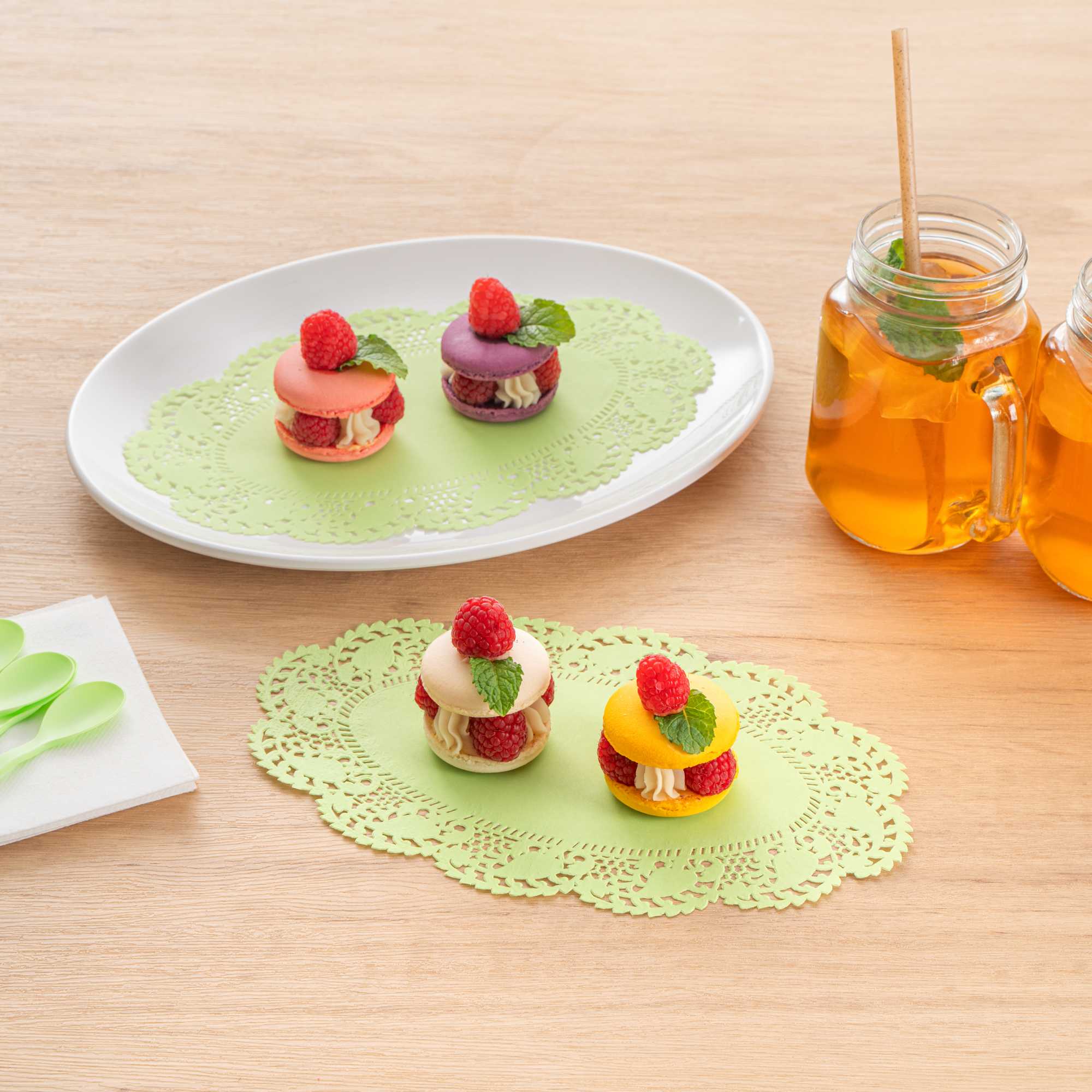 Enhance your dessert displays with our Pastry Tek Oval Green Paper Doilies, perfect for adding an elegant touch to any food presentation. Crafted from high-quality paper, these lace doilies provide durability while showcasing desserts at bakeries or catered luncheons without tearing or losing their structural integrity. With intricate lace-like details, these table doilies increase the visual appeal of food presentations while serving as functional barriers, protecting surfaces and absorbing moisture. The versatile green colored finish of these paper doilies complements a wide range of table settings and themes, making them ideal for various events and occasions. Designed for convenience, these disposable doilies eradicate the hassle of post-event cleanup, offering a time-saving solution for busy events and food establishments. These small doilies are perfect for use under cupcakes, petit fours, macarons, and other small treats. Measuring 10.5 inches in length by 6.5 inches in width, these lace doilies provide ample space for displaying a variety of desserts. Sold in a 4,000 count box.