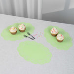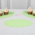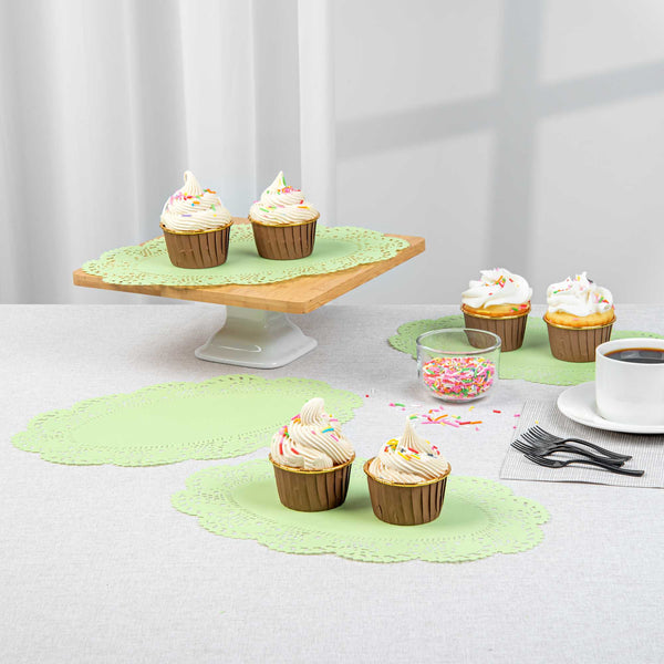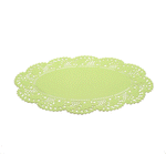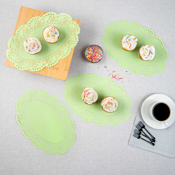 Enhance your dessert displays with our Pastry Tek Oval Green Paper Doilies, adding an elegant touch to any presentation. Crafted from high-quality paper, these lace doilies provide durability, ensuring your desserts remain beautifully displayed without tearing or losing their structural integrity. Featuring intricate lace-like details, these table doilies enhance the visual appeal of food presentations while serving as functional barriers that protect surfaces and absorb moisture. The versatile green finish of these paper doilies allows them to complement a wide range of table settings and themes, making them ideal for various events and occasions. Designed for convenience, these disposable doilies eradicate the hassle of post-event cleanup, offering a time-saving solution for busy cafes and food establishments. Perfect for use under cupcakes, petit fours, macarons, and other small treats, these small doilies are essential for any food display. Measuring 12.5 inches in length by 8.5 inches in width, these lace doilies are perfectly sized for versatile use. Sold in a 100 count box.