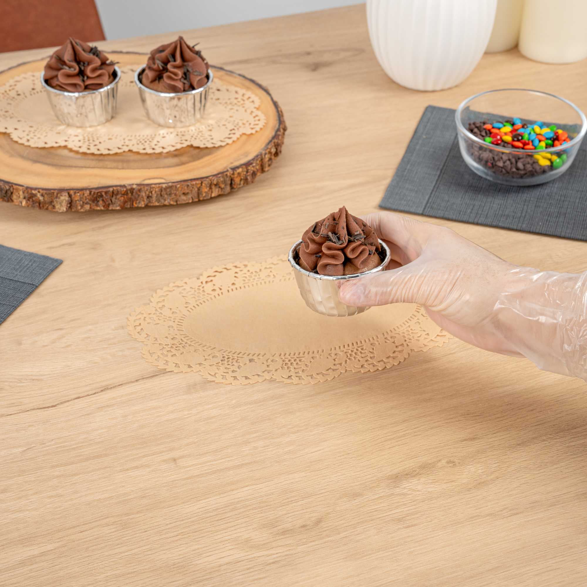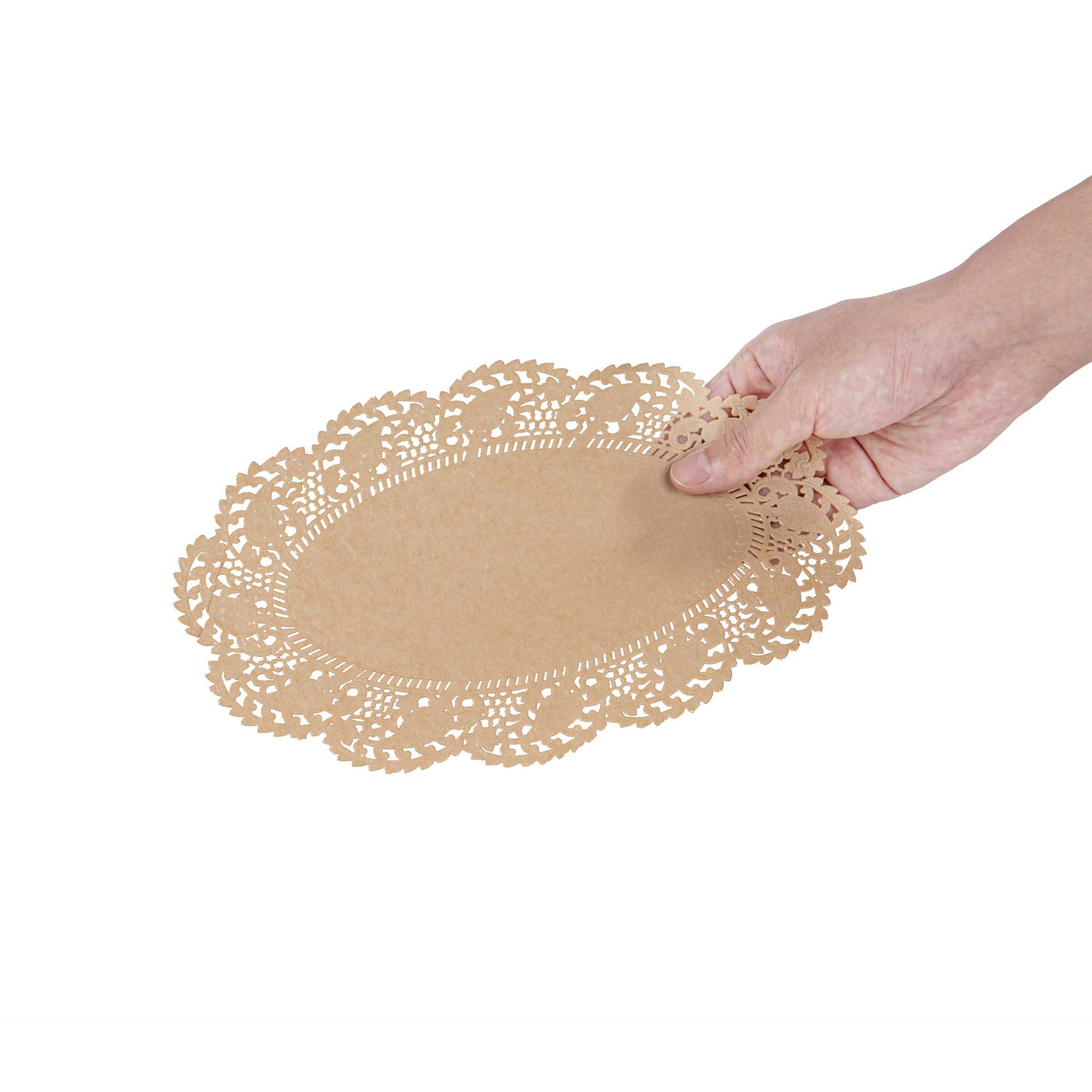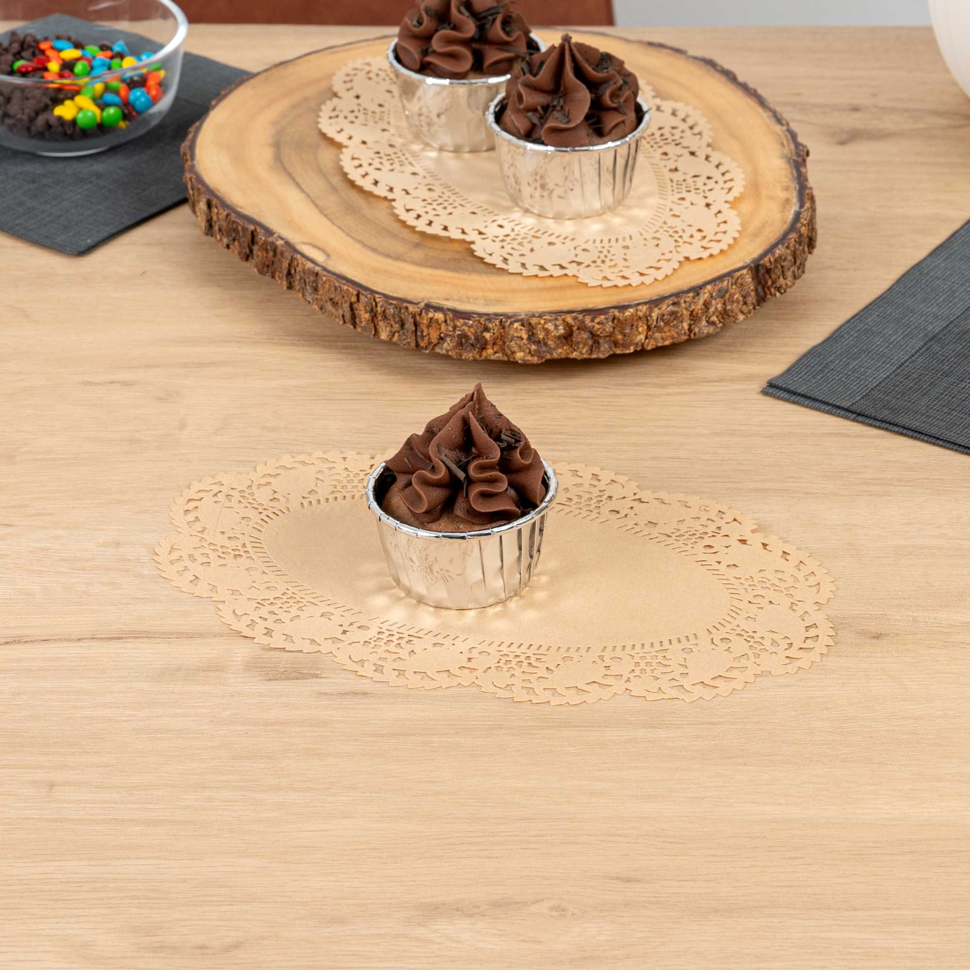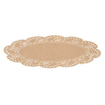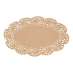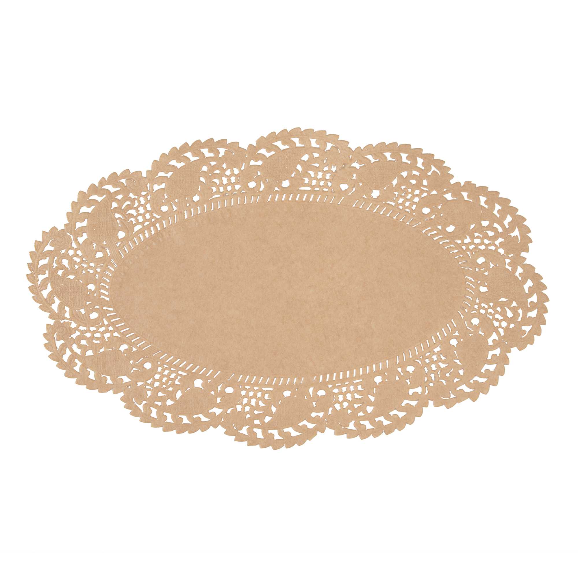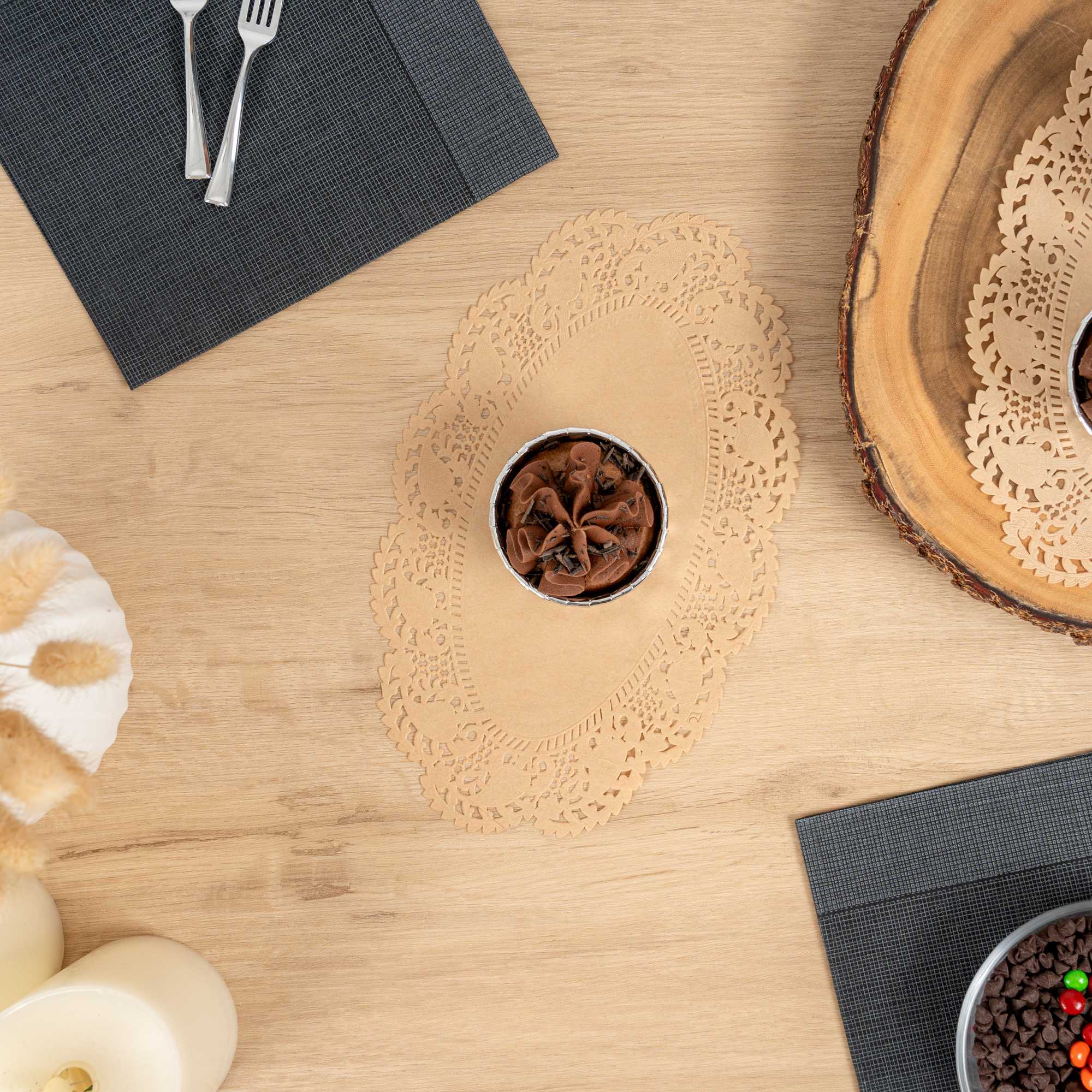 Elevate your dessert displays with our Pastry Tek Oval Kraft Paper Doilies. These high-quality paper doilies add an elegant touch to any table setting, making them perfect for showcasing desserts at bakeries or catered luncheons. Crafted with durability in mind, these lace doilies maintain their structural integrity without tearing, ensuring your presentations remain pristine. Designed with intricate lace-like details, these table doilies enhance the visual appeal of food presentations while serving as functional barriers that protect surfaces and absorb moisture. The kraft finish of these paper doilies allows them to beautifully complement a wide range of themes and table settings, making them an ideal choice for various events and occasions. Disposable by design, these small doilies eradicate the hassle of post-event cleanup, offering a convenient and time-saving solution for busy cafes and food establishments. Measuring 10.5 inches in length by 6.5 inches in width, these lace doilies are perfect for use under cupcakes, petit fours, macarons, and other small treats. Sold in a 100 count box.