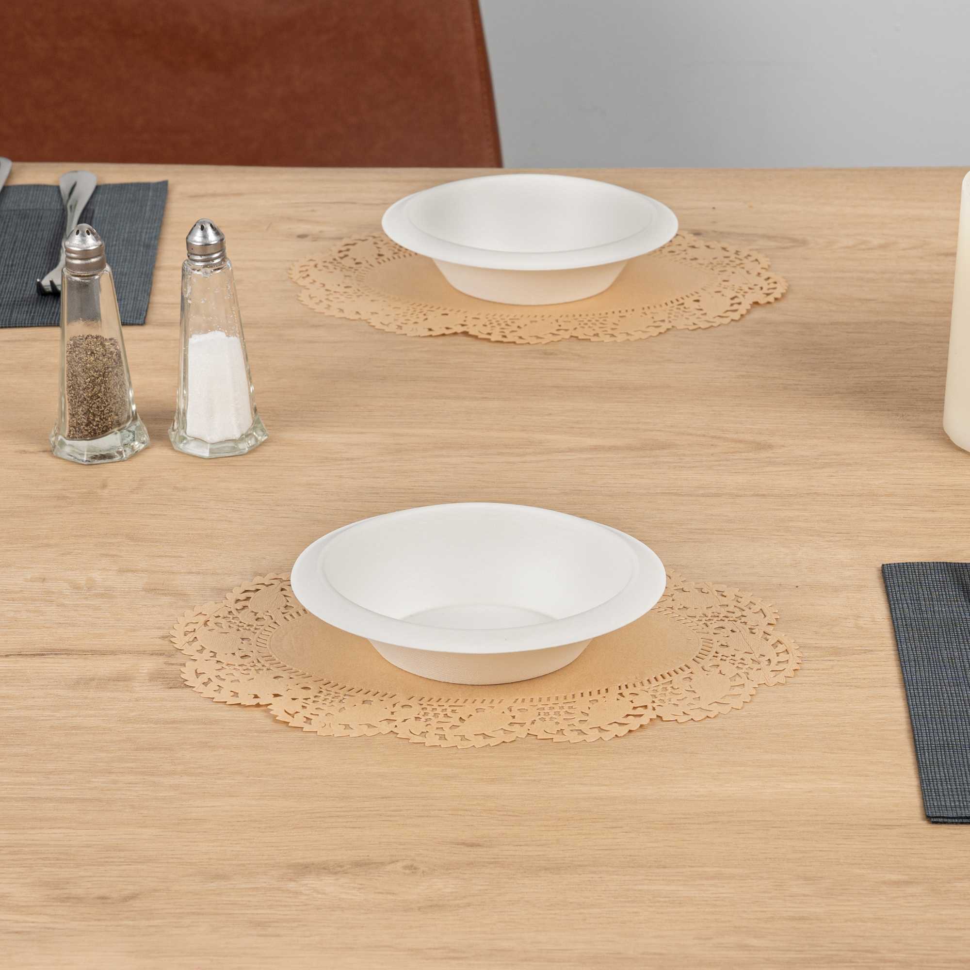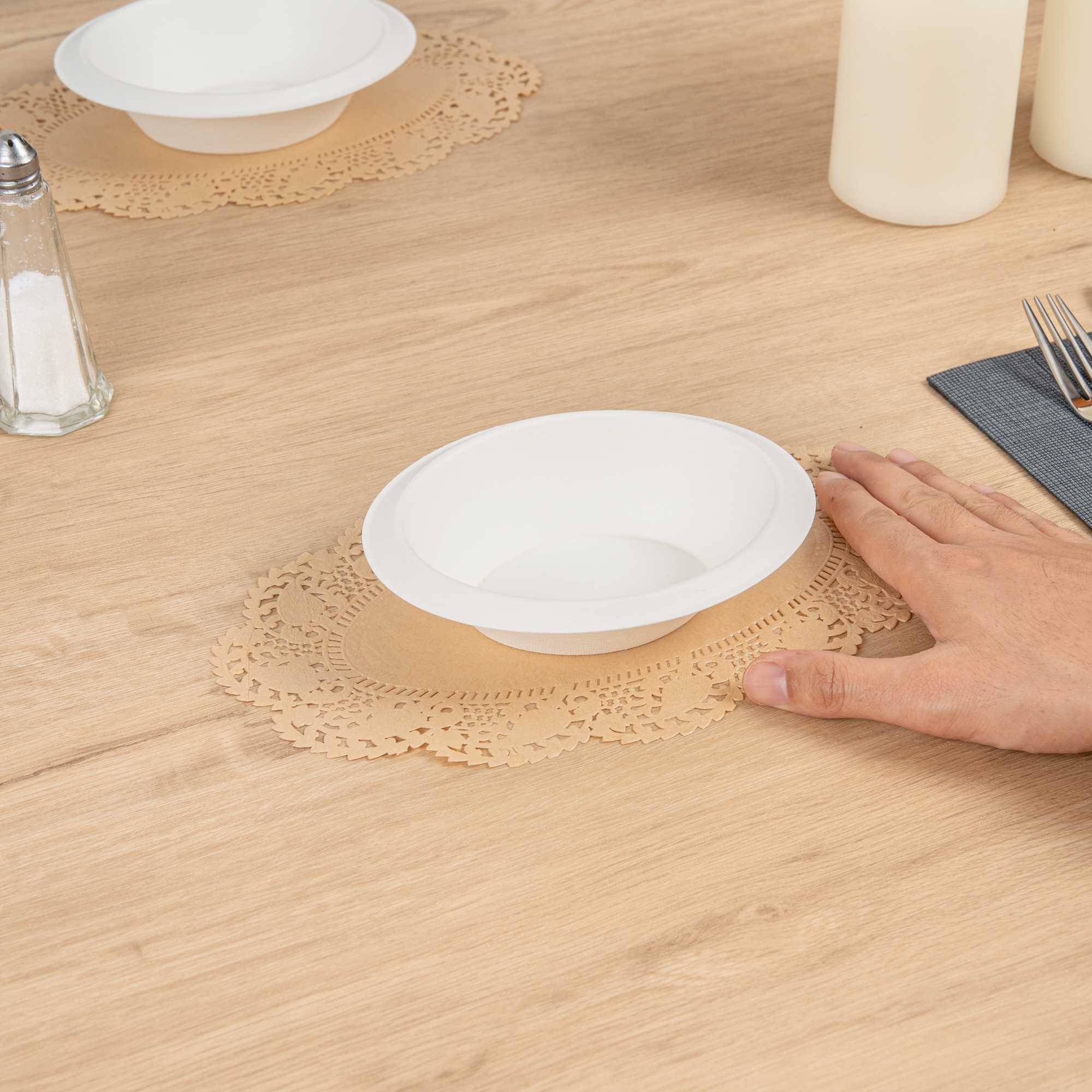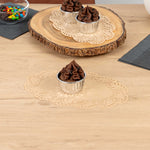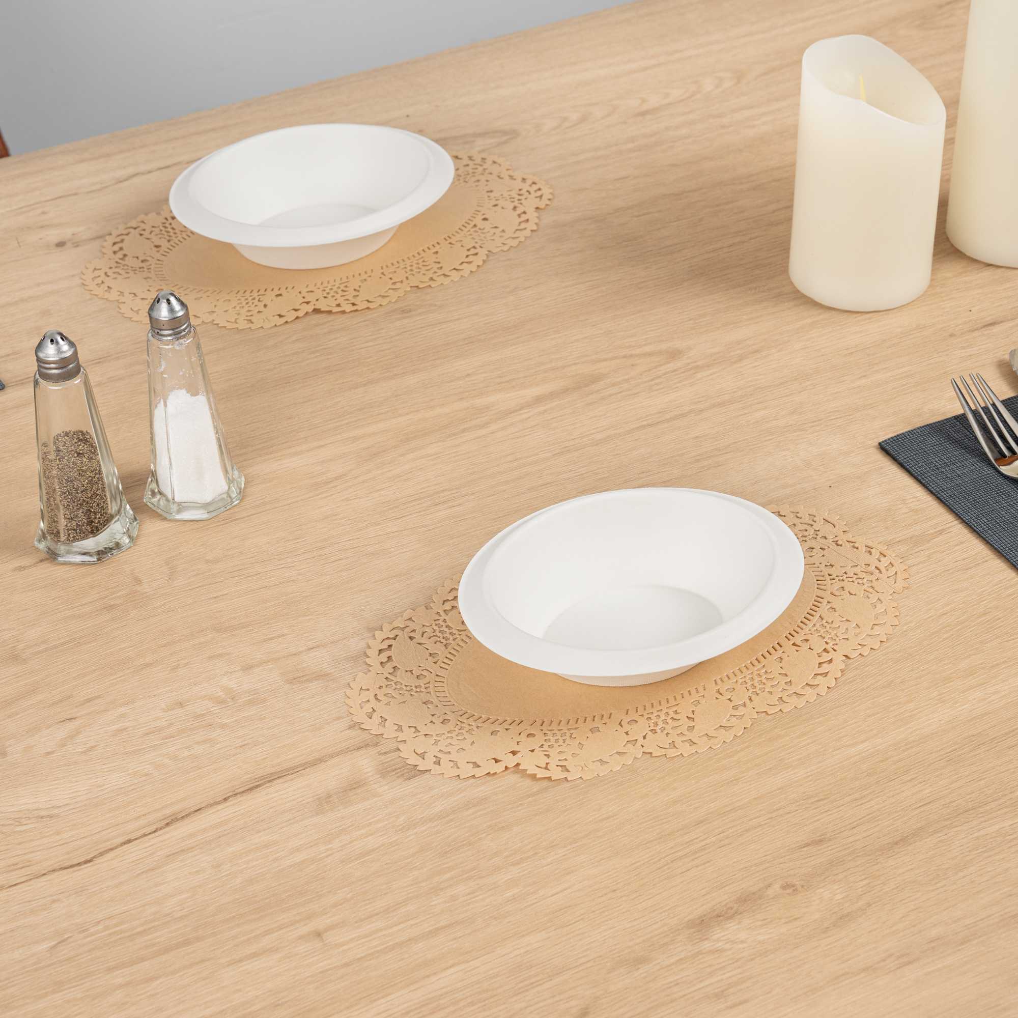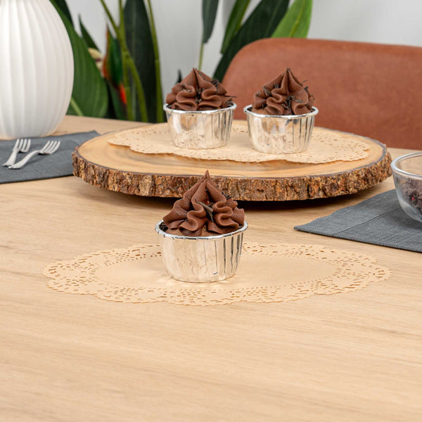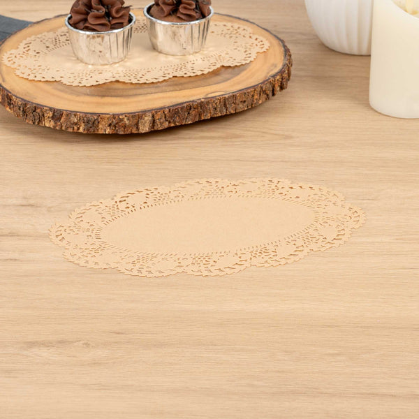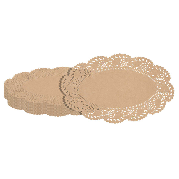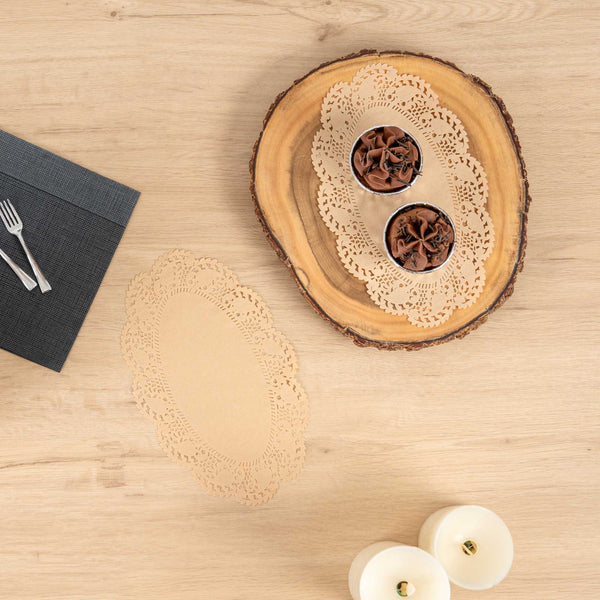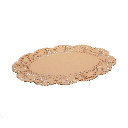 Elevate your dessert displays with our Pastry Tek Oval Kraft Paper Doilies. These high-quality paper doilies add an elegant touch to any table setting, making them perfect for showcasing desserts at bakeries or catered luncheons. Crafted with durability in mind, these lace doilies maintain their structural integrity without tearing, ensuring your presentations remain pristine. Designed with intricate lace-like details, these table doilies enhance the visual appeal of food presentations while serving as functional barriers that protect surfaces and absorb moisture. The kraft finish of these paper doilies allows them to beautifully complement a wide range of themes and table settings, making them an ideal choice for various events and occasions. Disposable by design, these small doilies eradicate the hassle of post-event cleanup, offering a convenient and time-saving solution for busy cafes and food establishments. Measuring 10.5 inches in length by 6.5 inches in width, these lace doilies are perfect for use under cupcakes, petit fours, macarons, and other small treats. Sold in a 100 count box.
