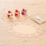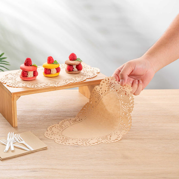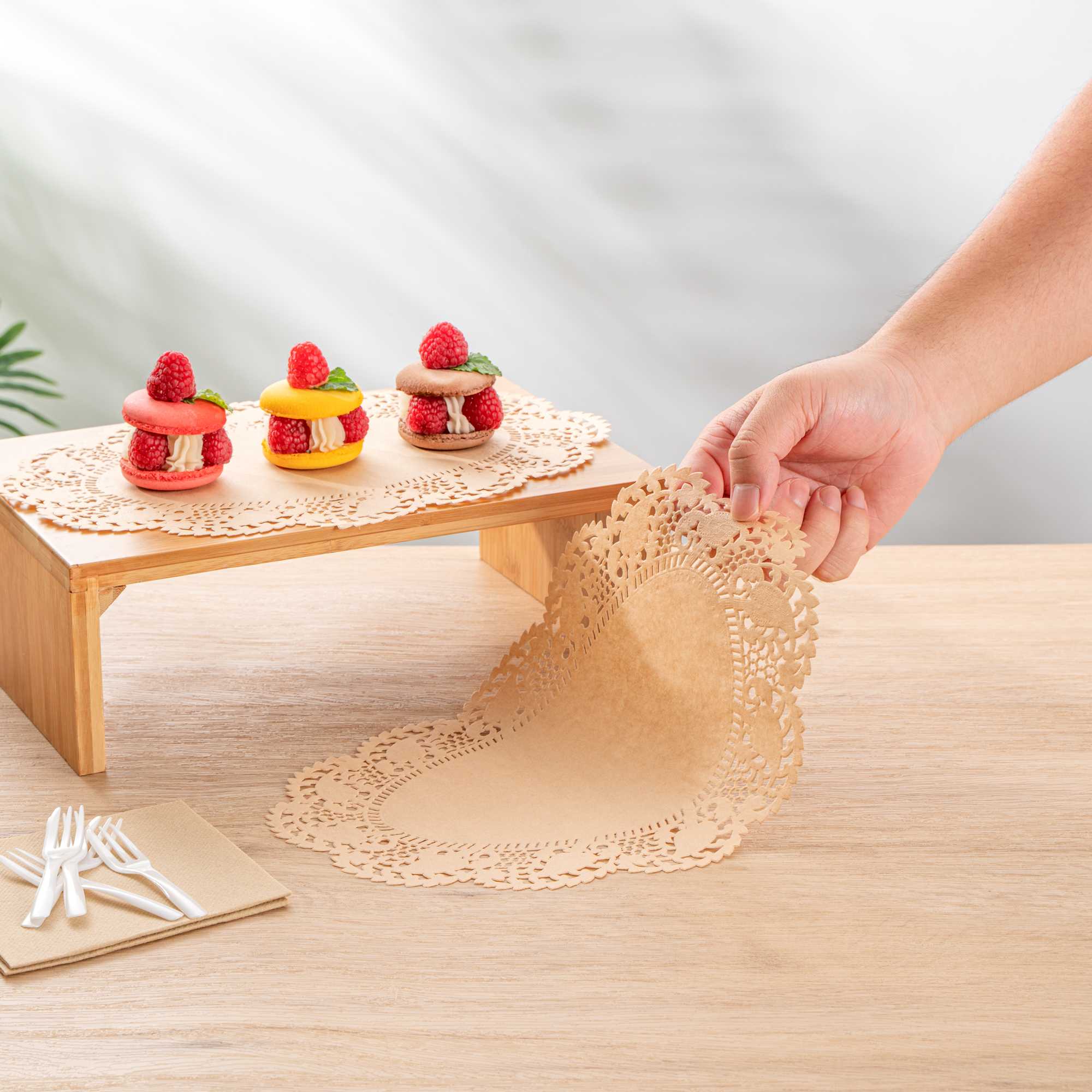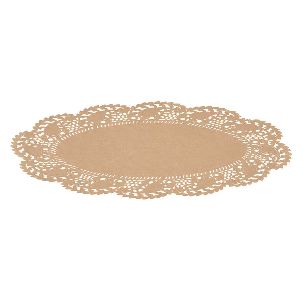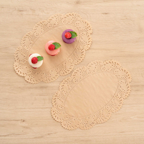 Elevate your dessert presentations with our Pastry Tek Oval Kraft Paper Doilies, perfect for adding an elegant touch to any display. Crafted from high-quality paper, these lace doilies provide exceptional durability, ensuring your desserts stay beautifully presented without tearing. These table doilies feature intricate lace-like details that not only enhance the visual appeal of food displays but also serve as functional barriers, protecting surfaces and absorbing moisture. The kraft finish of these paper doilies allows them to complement a wide range of table settings and themes, making them ideal for various events and occasions. Designed to be disposable, these small doilies eradicate the hassle of post-event cleanup, providing a convenient and time-saving solution for busy cafes and food establishments. Perfect for use under cupcakes, petit fours, macarons, and other small treats, these paper doilies measure 12.5 inches in length by 8.5 inches in width. Sold in a 100 count box.