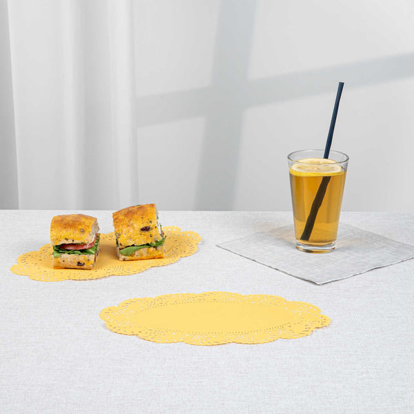 Elevate your dessert displays with our Pastry Tek Oval Orange Paper Doilies. Crafted from high-quality paper, these table doilies provide durability while showcasing desserts at bakeries or catered luncheons without tearing or losing their structural integrity. Lace-like details on these paper doilies increase the visual appeal of food presentations, serving as functional barriers that protect surfaces and absorb moisture. The orange colored finish of these lace doilies is versatile, allowing them to complement a wide range of table settings and themes, making them an ideal choice for various events and occasions. These small doilies are disposable to eradicate the hassle of post-event cleanup, offering a convenient and time-saving solution for busy hosts and food establishments. Measuring 10.5 inches in length by 6.5 inches in width, these colored paper doilies are perfect for use under cupcakes, petit fours, macarons, and other small treats. Sold in a 100 count box.