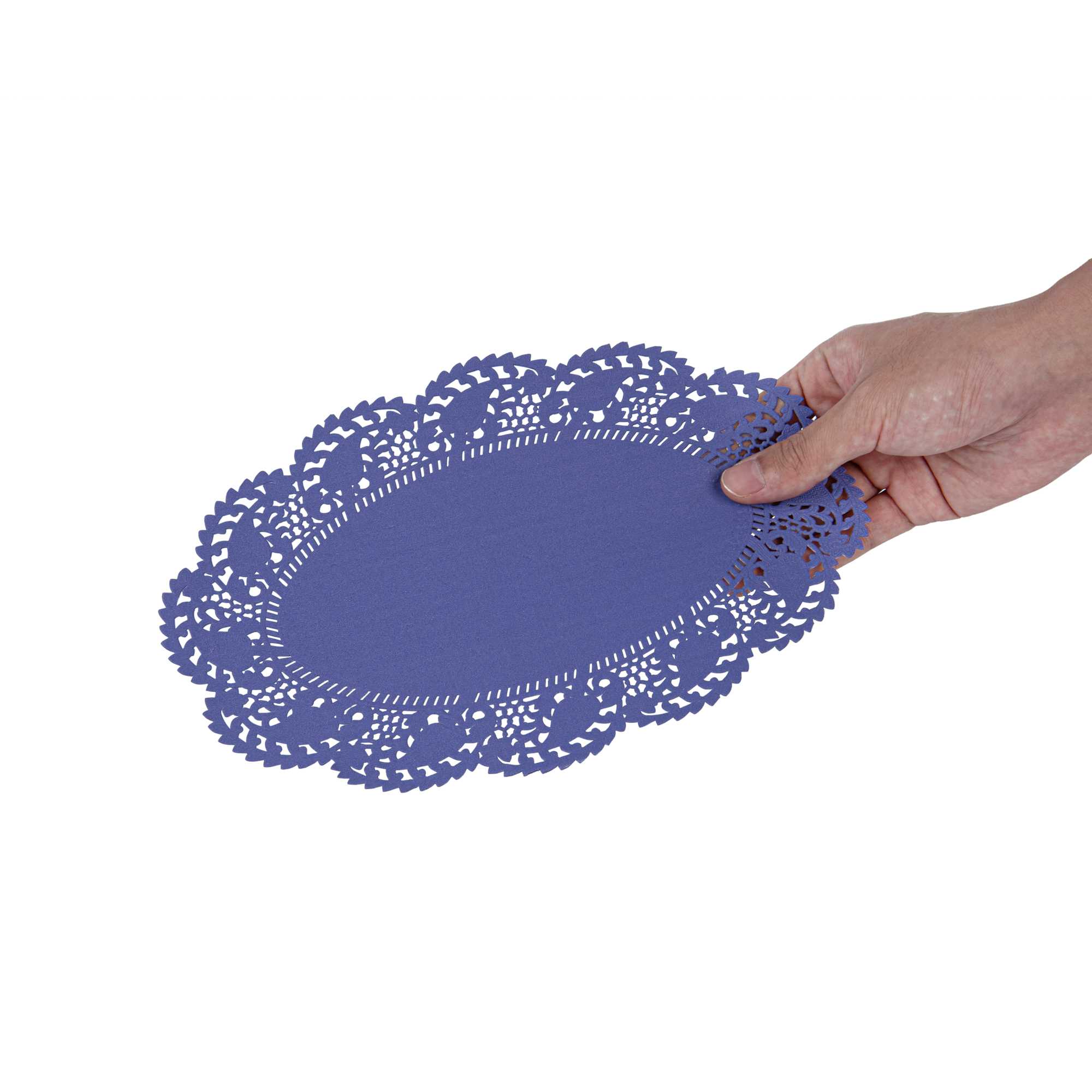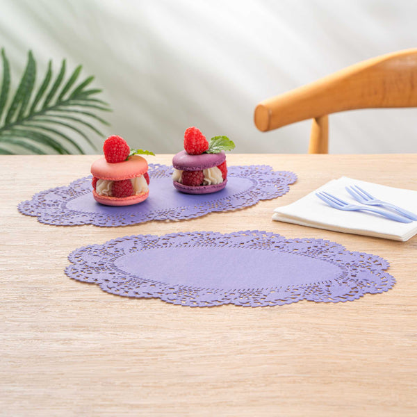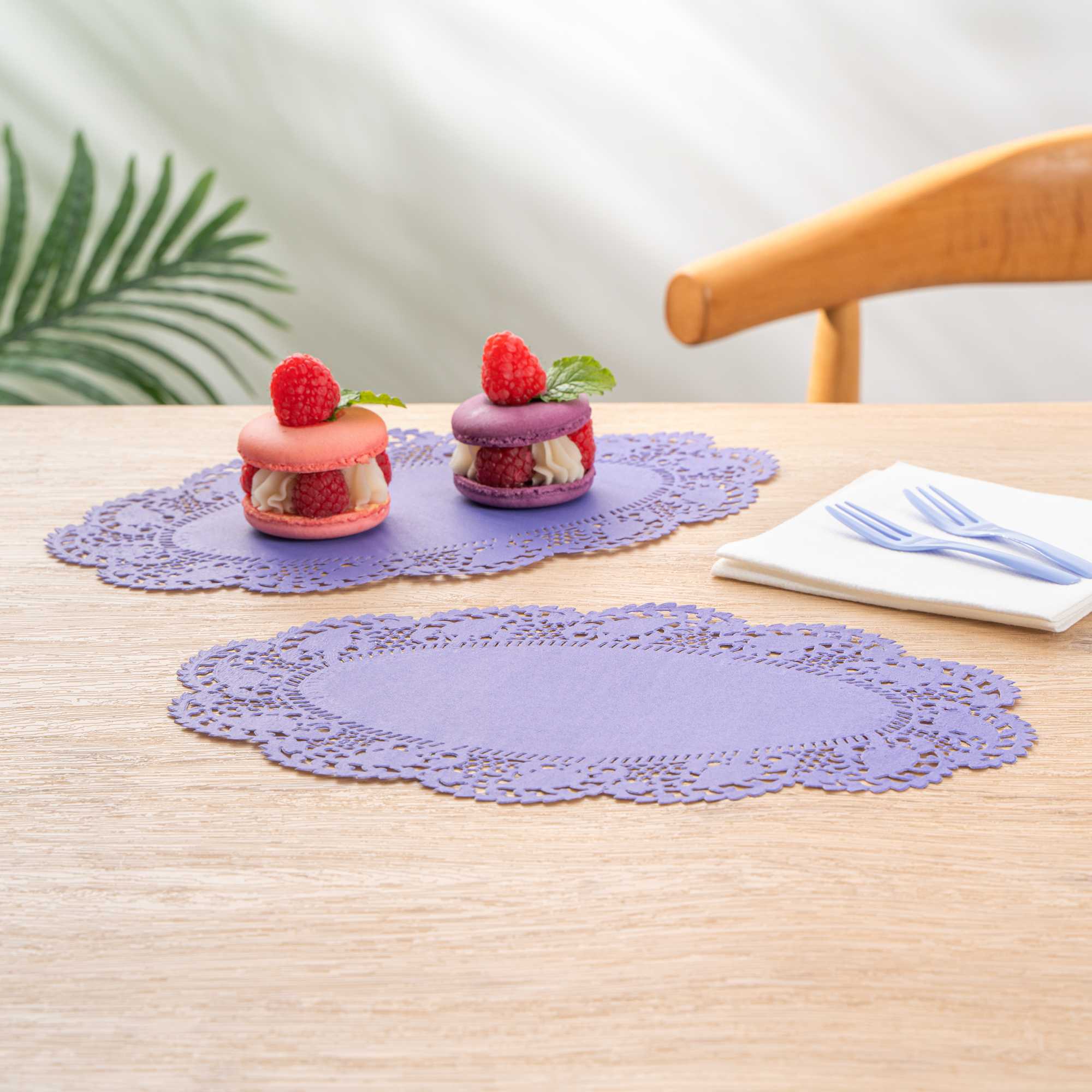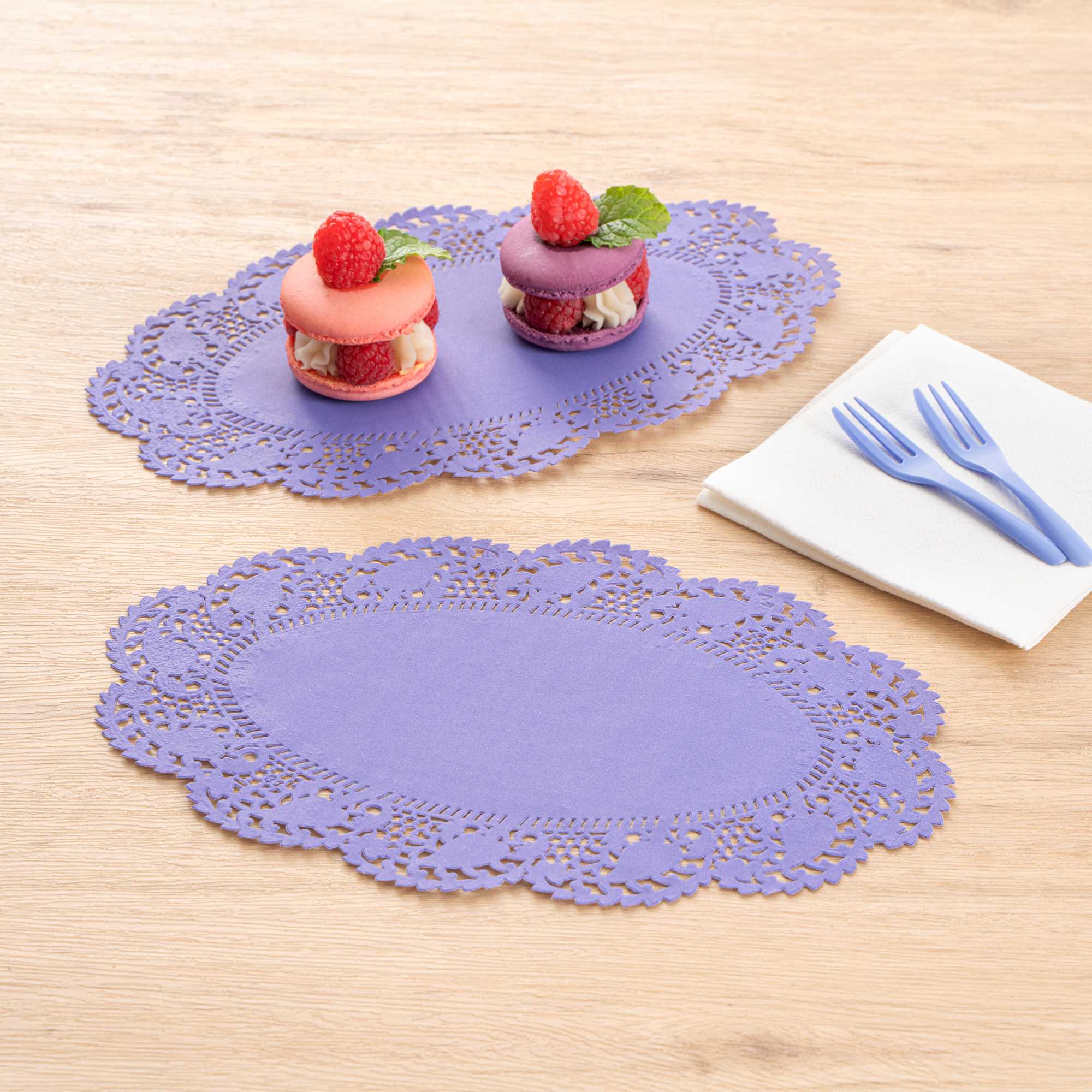 Add an elegant touch to your dessert displays with our Pastry Tek Oval Purple Paper Doilies. Crafted from high-quality paper, these table doilies provide durability while displaying desserts at bakeries or catered luncheons without tearing or losing their structural integrity. Featuring lace-like details, these colored paper doilies increase the visual appeal of food presentations while serving as functional barriers, protecting surfaces, and absorbing moisture. The purple colored finish of these doilies is versatile, allowing them to complement a wide range of table settings and themes, making them an ideal choice for various events and occasions. These lace doilies are disposable to eradicate the hassle of post-event cleanup, offering a convenient and time-saving solution for busy hosts and food establishments. Perfect for use under cupcakes, petit fours, macarons, and other small treats, these small doilies measure 10.5 inches in length by 6.5 inches in width. Sold in a 100 count box.