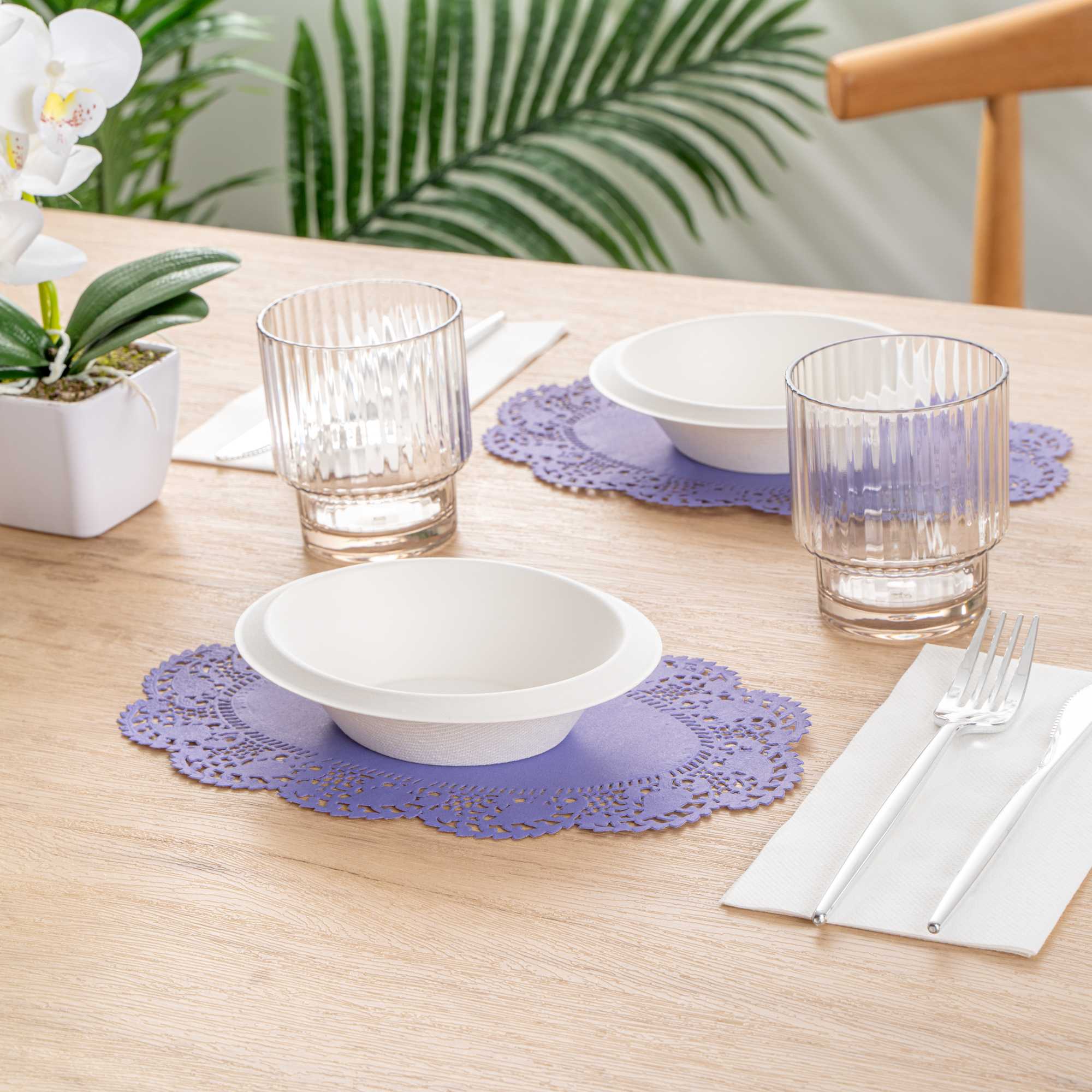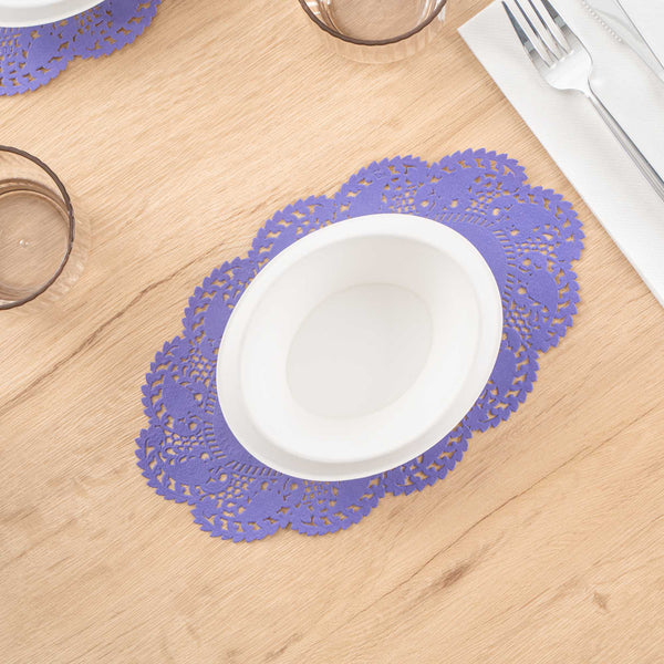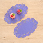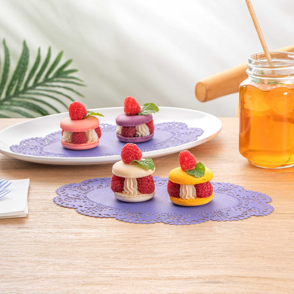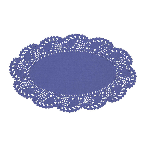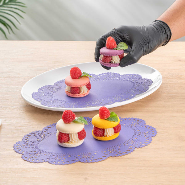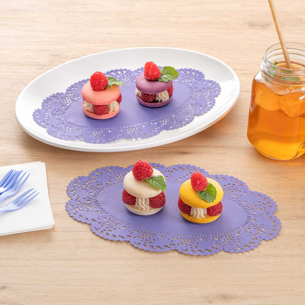 Add an elegant touch to your dessert displays with our Pastry Tek Oval Purple Paper Doilies. Crafted from high-quality paper, these table doilies provide durability while displaying desserts at bakeries or catered luncheons without tearing or losing their structural integrity. Featuring lace-like details, these colored paper doilies increase the visual appeal of food presentations while serving as functional barriers, protecting surfaces, and absorbing moisture. The purple colored finish of these doilies is versatile, allowing them to complement a wide range of table settings and themes, making them an ideal choice for various events and occasions. These lace doilies are disposable to eradicate the hassle of post-event cleanup, offering a convenient and time-saving solution for busy hosts and food establishments. Perfect for use under cupcakes, petit fours, macarons, and other small treats, these small doilies measure 10.5 inches in length by 6.5 inches in width. Sold in a 100 count box.