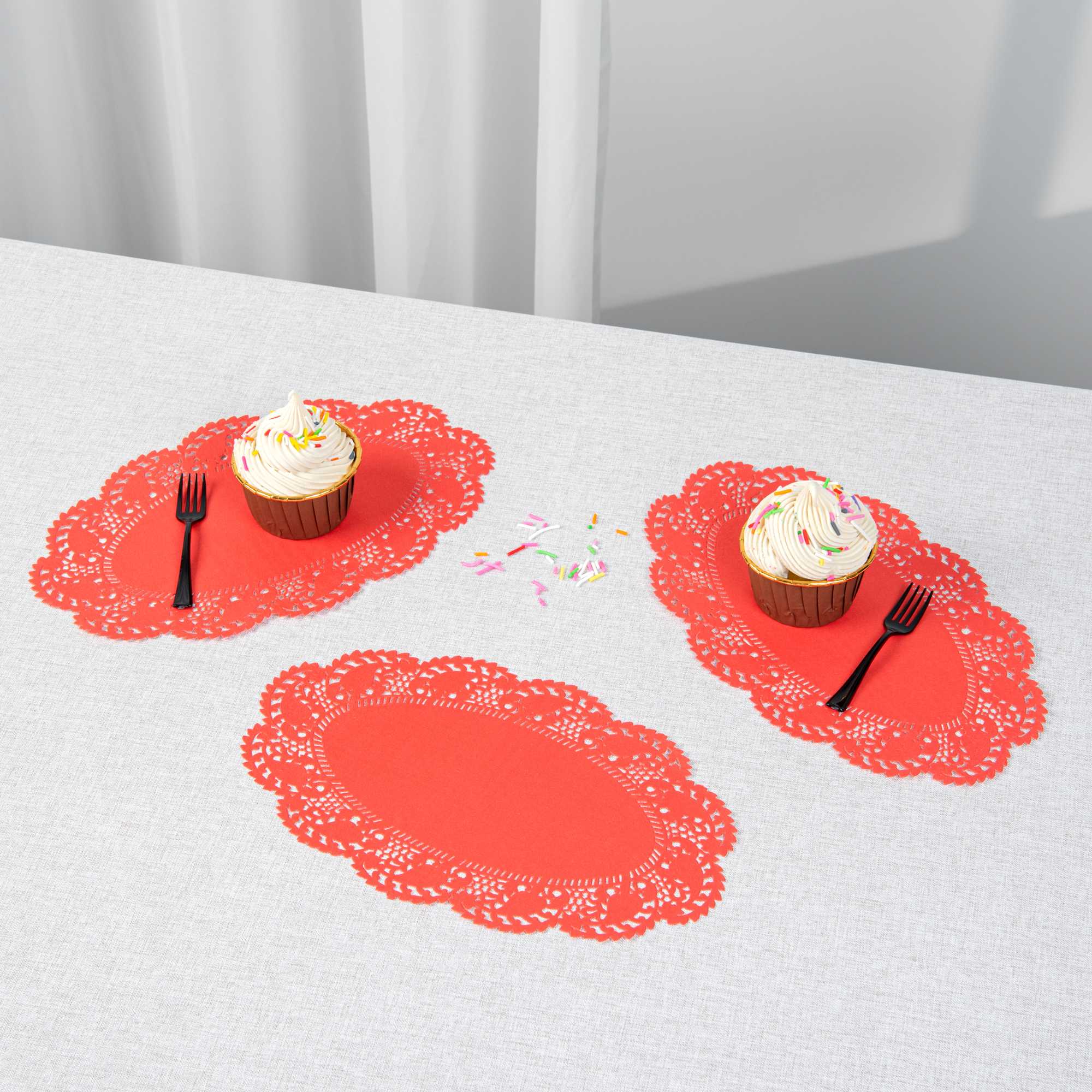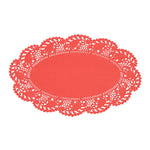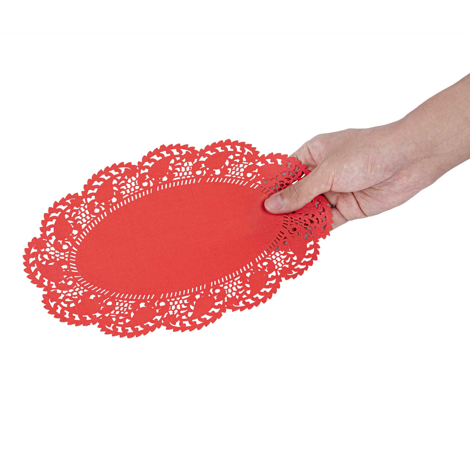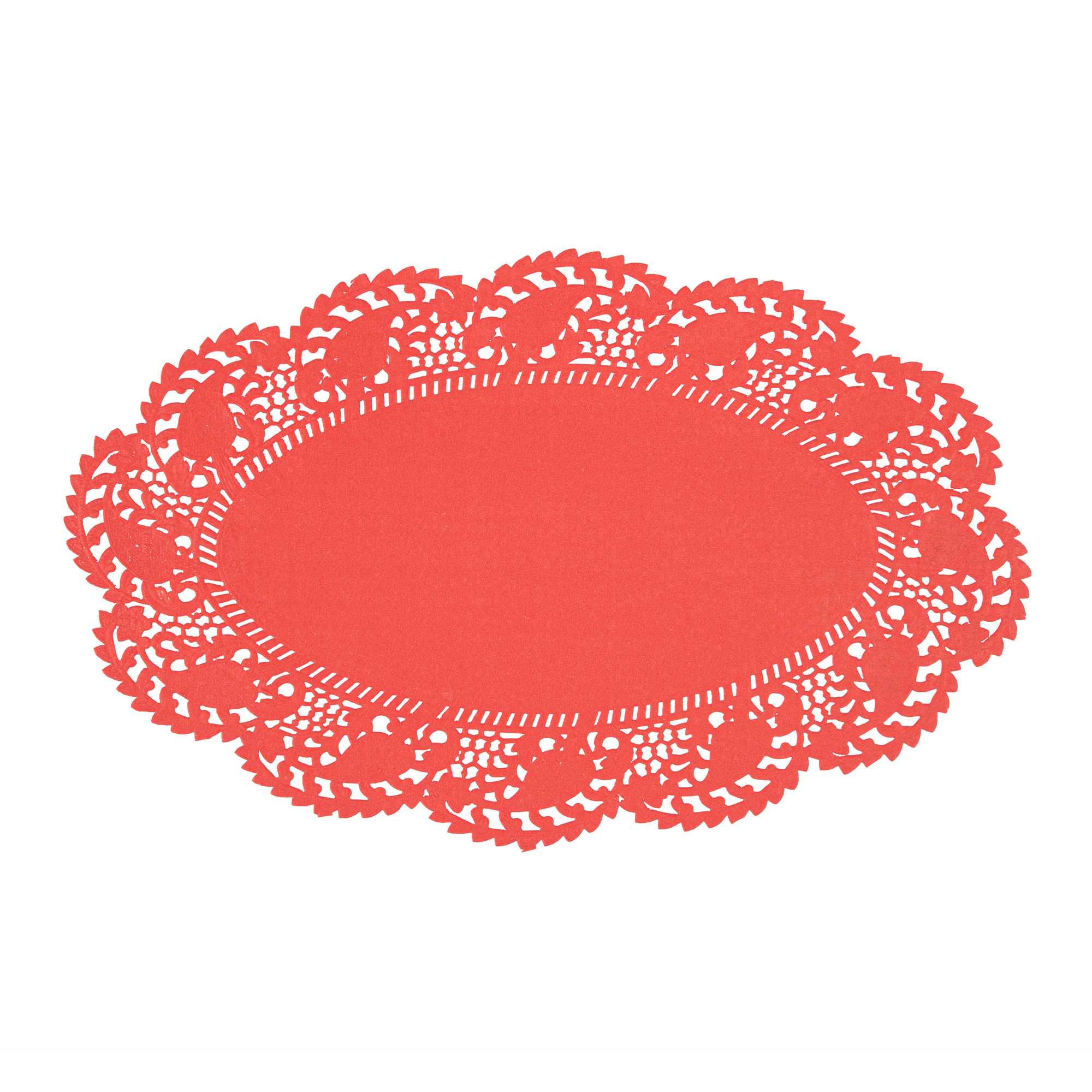 Elevate your dessert presentations with our Pastry Tek Oval Red Paper Doilies. Crafted from high-quality paper, these table doilies provide exceptional durability, ensuring desserts at bakeries or catered luncheons remain intact without tearing. Featuring intricate lace-like details, these lace doilies not only enhance the visual appeal of food displays but also serve as functional barriers, protecting surfaces and absorbing moisture. With their vibrant red colored paper finish, these doilies seamlessly complement a wide range of table settings and themes, making them an ideal choice for various events and occasions. These small doilies are disposable, eliminating the hassle of post-event cleanup and offering a convenient, time-saving solution for busy cafes and food establishments. Measuring 10.5 inches in length by 6.5 inches in width, these paper doilies are perfect for placing under cupcakes, petit fours, macarons, and other small treats. Sold in a 4,000 count box.