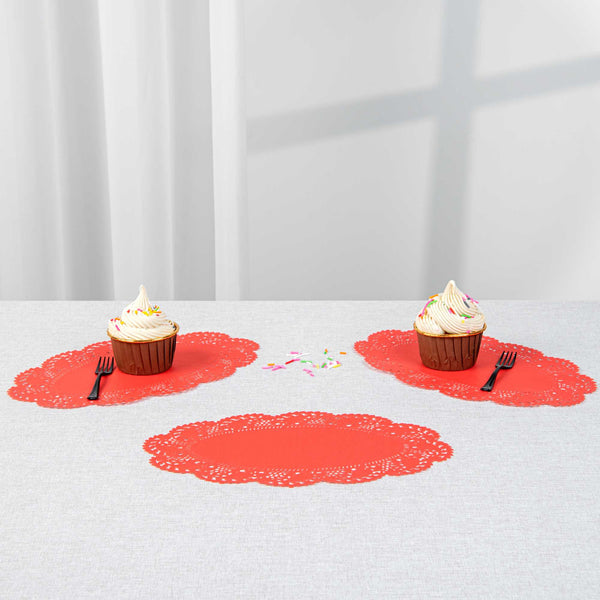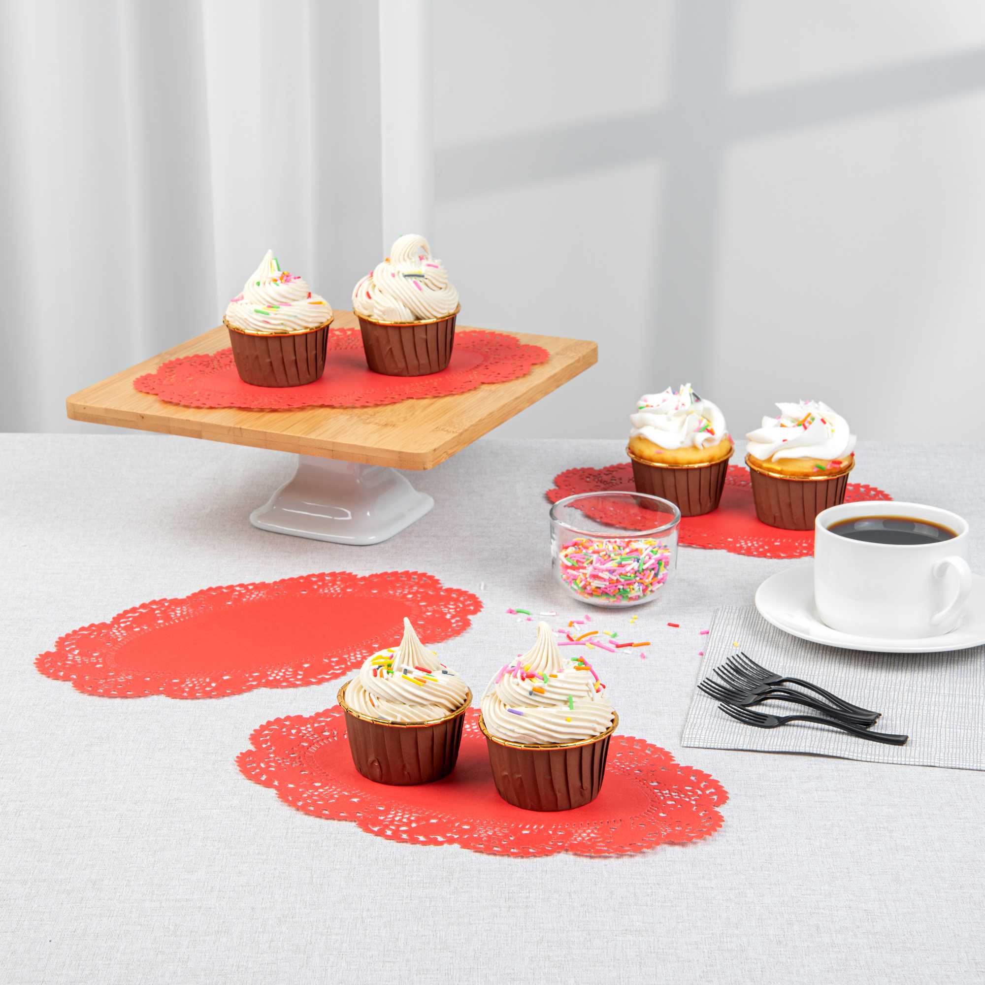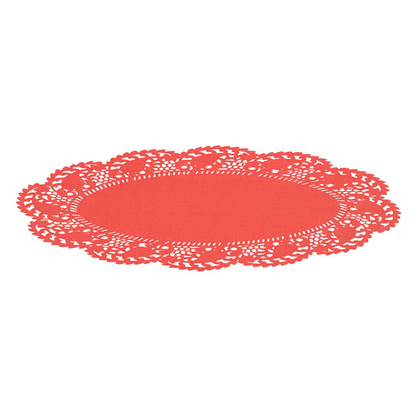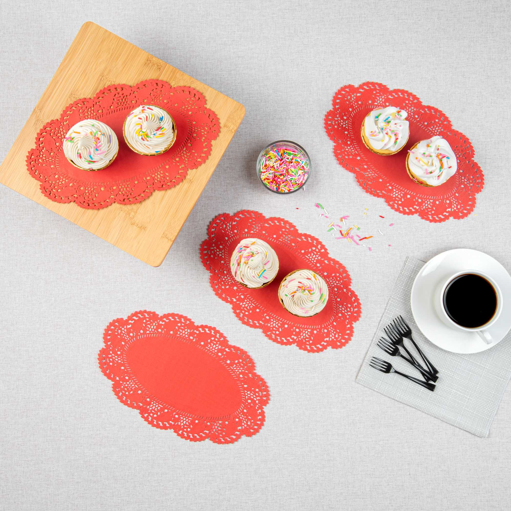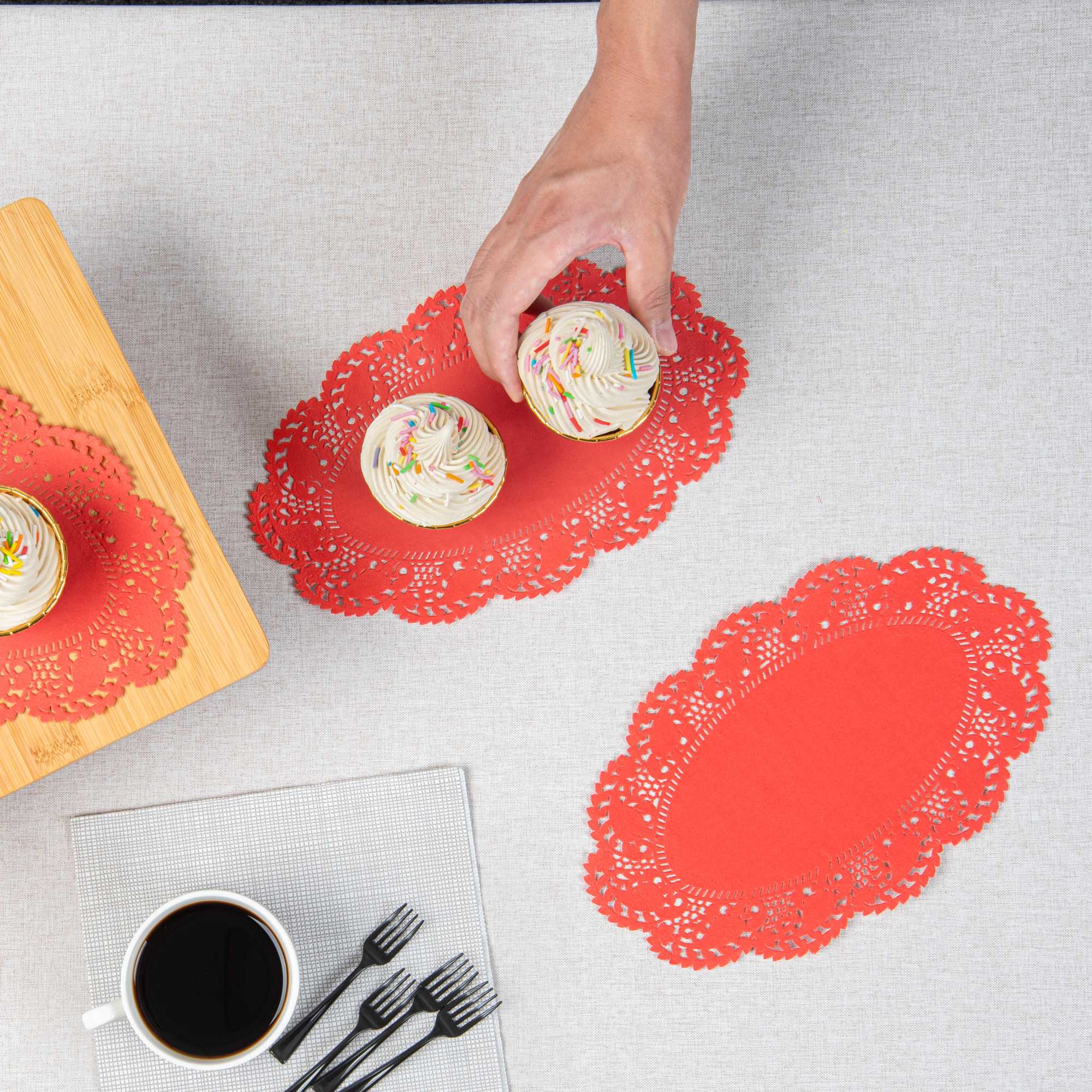 Elevate your dessert presentations with our Pastry Tek Oval Red Paper Doilies. Crafted from high-quality paper, these table doilies provide exceptional durability, ensuring desserts at bakeries or catered luncheons remain intact without tearing. Featuring intricate lace-like details, these lace doilies not only enhance the visual appeal of food displays but also serve as functional barriers, protecting surfaces and absorbing moisture. With their vibrant red colored paper finish, these doilies seamlessly complement a wide range of table settings and themes, making them an ideal choice for various events and occasions. These small doilies are disposable, eliminating the hassle of post-event cleanup and offering a convenient, time-saving solution for busy cafes and food establishments. Measuring 10.5 inches in length by 6.5 inches in width, these paper doilies are perfect for placing under cupcakes, petit fours, macarons, and other small treats. Sold in a 4,000 count box.