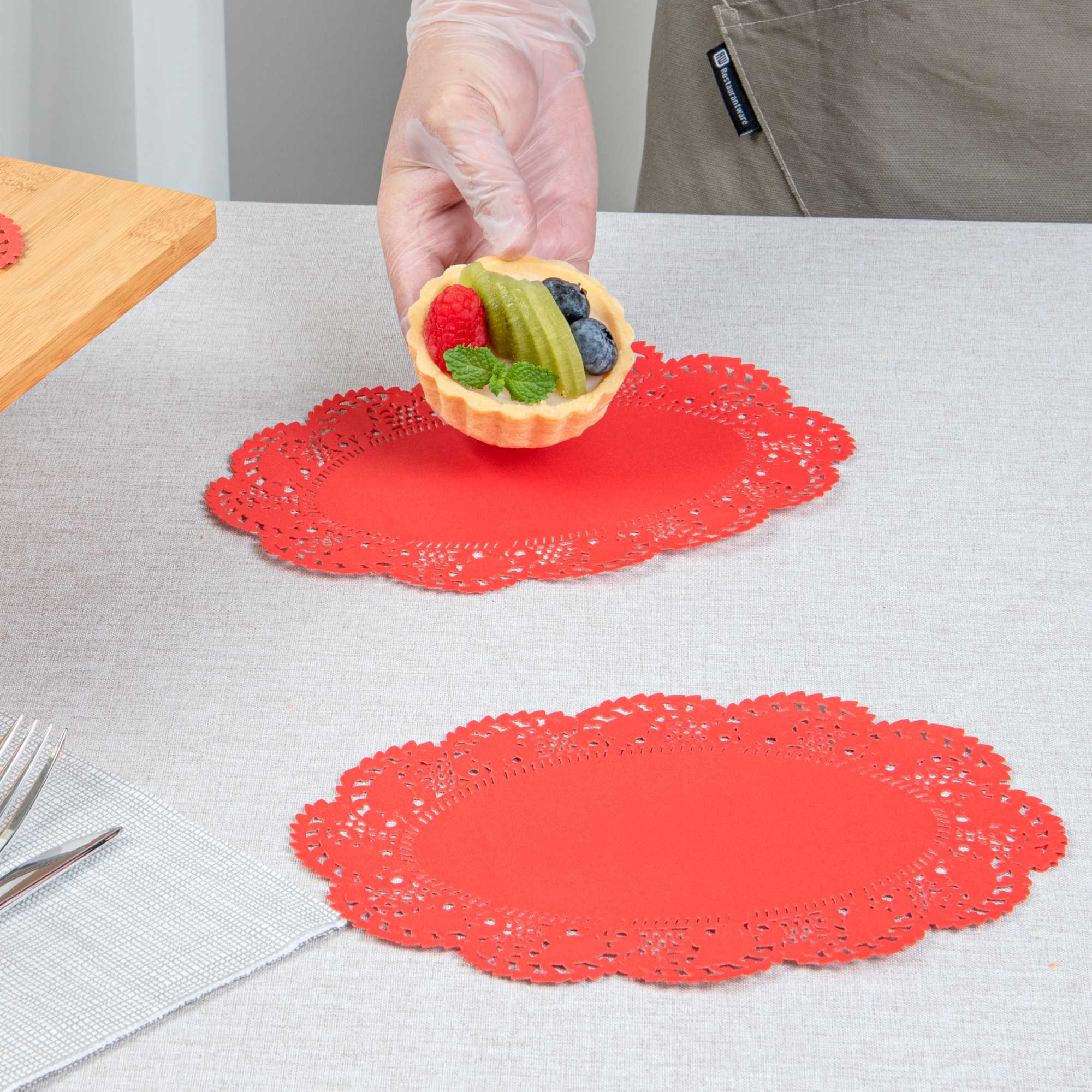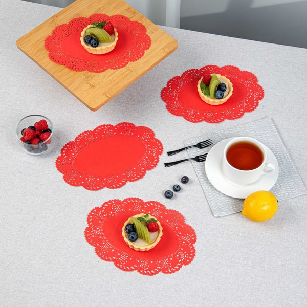 Enhance your dessert displays with our Pastry Tek Oval Red Paper Doilies. Crafted from high-quality paper, these durable lace doilies effortlessly showcase desserts at bakeries or catered luncheons without tearing. The lace-like details of these paper doilies boost the visual appeal of food presentations while serving as functional barriers, protecting surfaces and absorbing moisture. With their red colored finish, these versatile colored paper doilies complement a wide range of table settings and themes, making them perfect for various events and occasions. Designed for convenience, these disposable table doilies eradicate the hassle of post-event cleanup, providing a time-saving solution for busy cafes and food establishments. These doiles are ideal for use under cupcakes, petit fours, macarons, and other small treats. Measuring 9 inches in length by 6.5 inches in width, these lace doilies fit perfectly into your food presentation needs. Sold in a 4,000 count box.