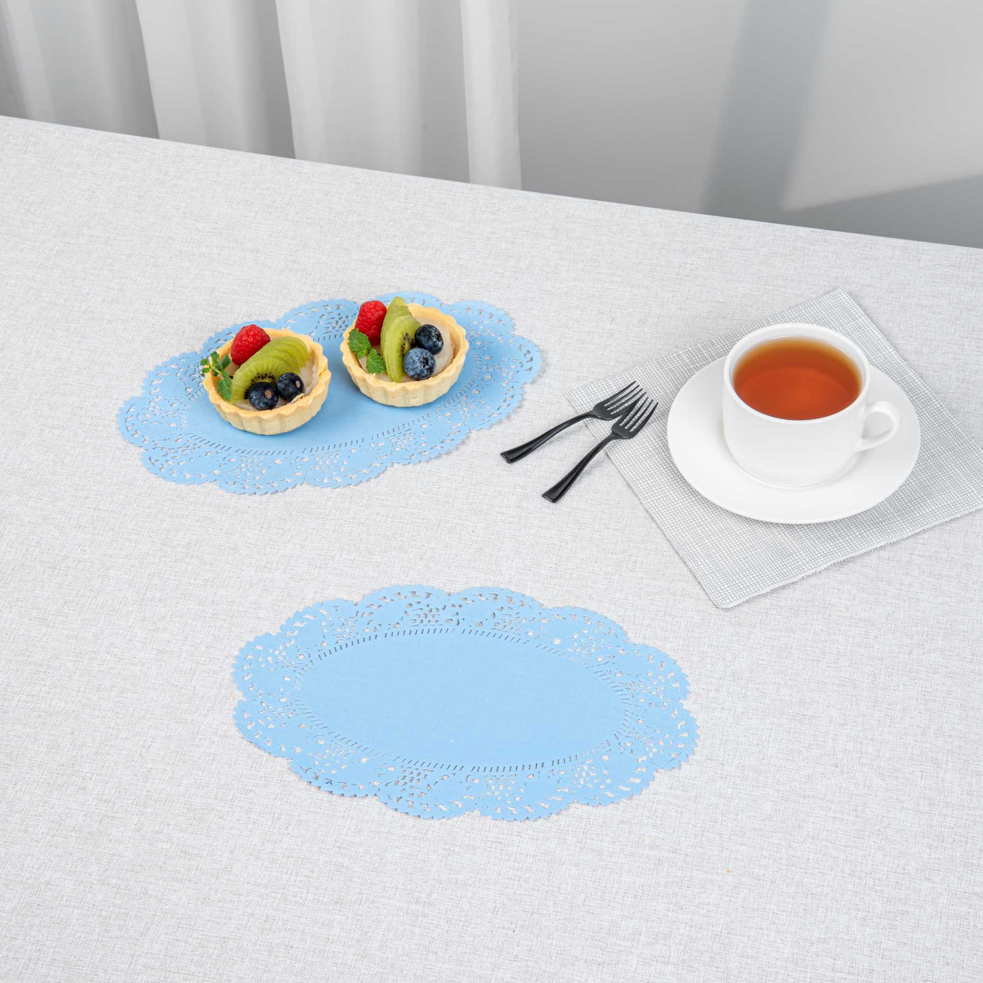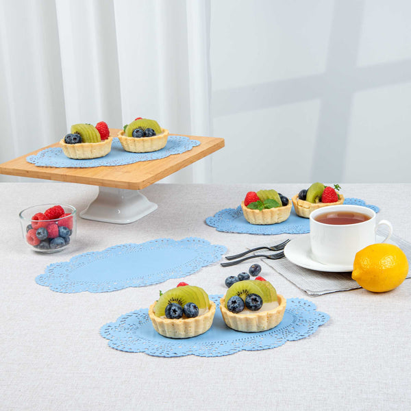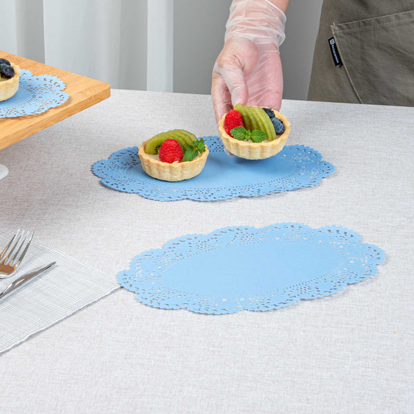 Elevate your dessert displays with our Pastry Tek Oval Sky Blue Paper Doilies, designed to add an elegant touch to any presentation. Crafted from high-quality paper, these lace doilies provide exceptional durability while showcasing desserts at bakeries or catered luncheons without tearing. Featuring intricate lace-like details, these table doilies not only enhance the visual appeal of food presentations but also serve as functional barriers, protecting surfaces and absorbing moisture. The vibrant sky blue finish of these colored paper doilies complements a wide range of table settings and themes, making them ideal for various events and occasions. Disposable by design, these small doilies eradicate the hassle of post-event cleanup, offering a convenient and time-saving solution for busy events and food establishments. Perfect for use under cupcakes, petit fours, macarons, and other small treats, these lace doilies measure 10.5 inches in length by 6.5 inches in width. Sold in a 100 count box.