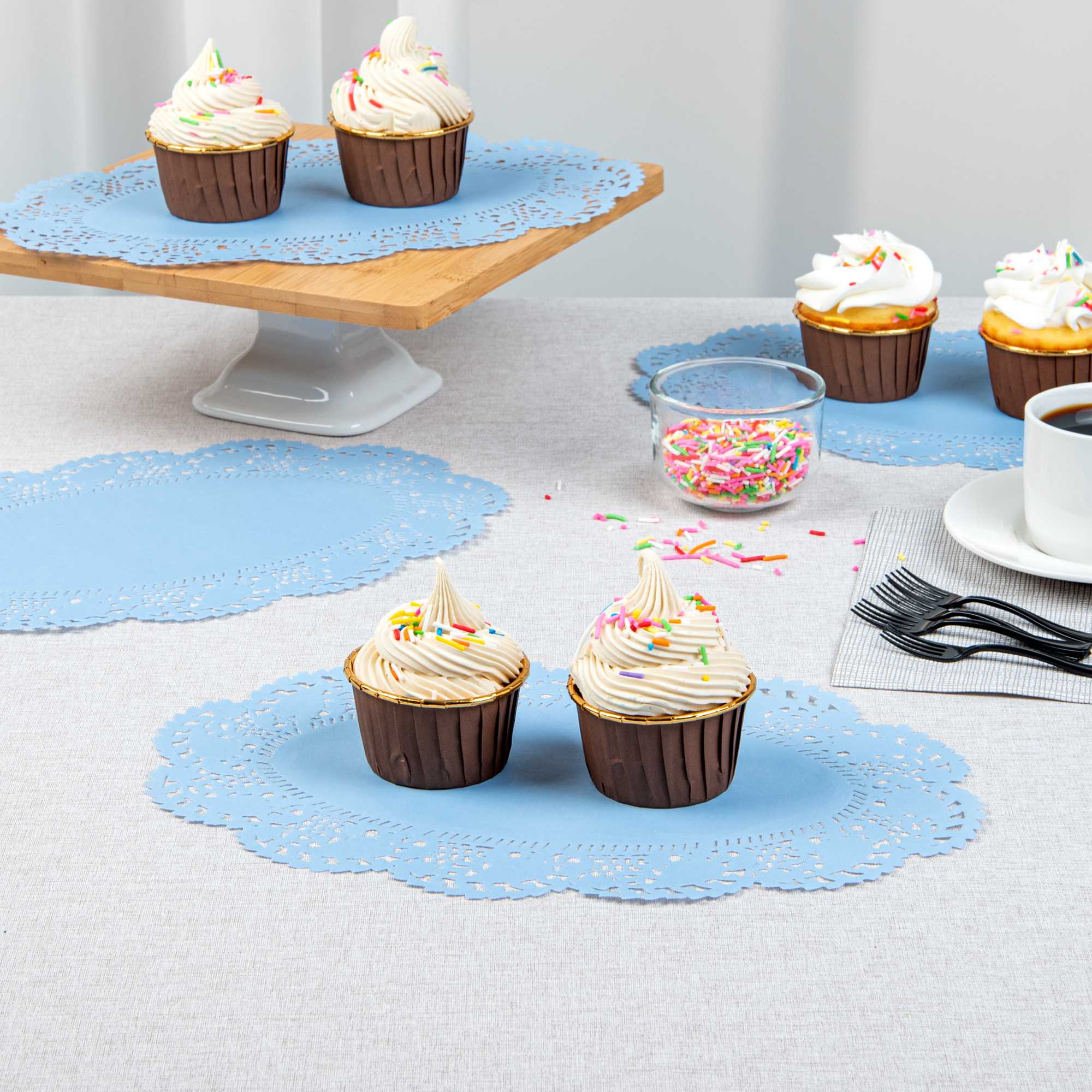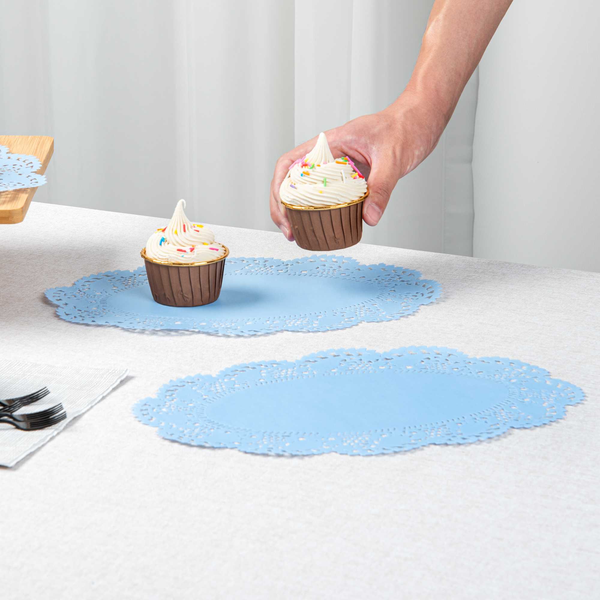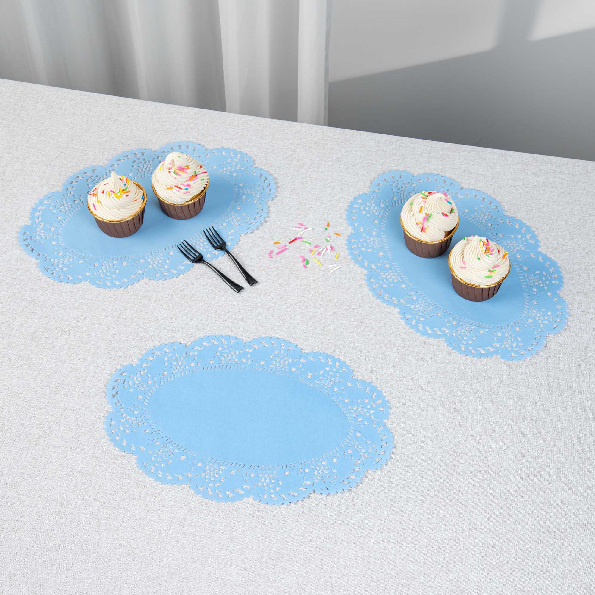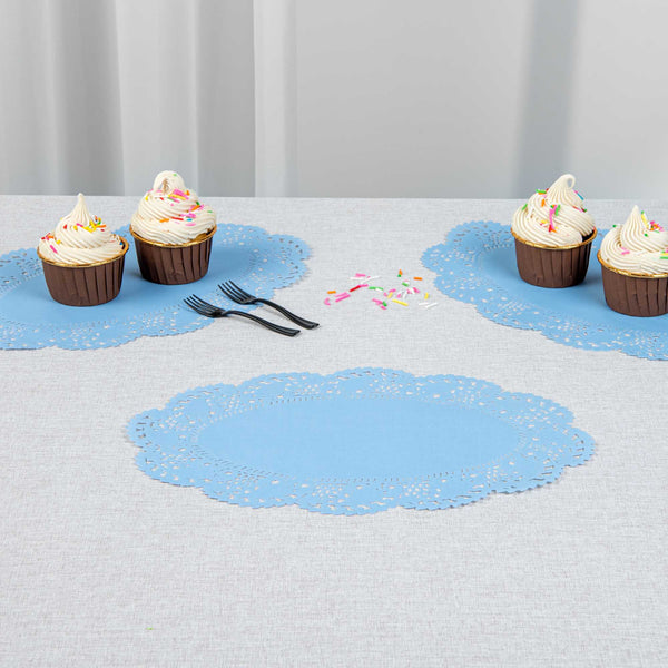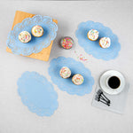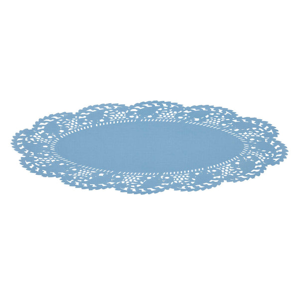 Enhance your dessert displays with our Pastry Tek Oval Sky Blue Paper Doilies, perfect for adding an elegant touch to any presentation. Crafted from high-quality paper, these lace doilies provide durability while displaying desserts at bakeries or catered luncheons without tearing or losing their structural integrity. Lace-like details on these table doilies increase the visual appeal of food presentations while serving as functional barriers, protecting surfaces, and absorbing moisture. The sky blue colored finish of these paper doilies is versatile, allowing them to complement a wide range of table settings and themes, making them an ideal choice for various events and occasions. Disposable design of these small doilies eradicates the hassle of post-event cleanup, offering a convenient and time-saving solution for busy cafes and food establishments. Use these lace doilies under cupcakes, petit fours, macarons, and other small treats to highlight their beauty and ensure a neat presentation. Measuring 12.5 inches in length by 8.5 inches in width, these colored paper doilies are the perfect size for versatile use. Sold in a 100 count box.