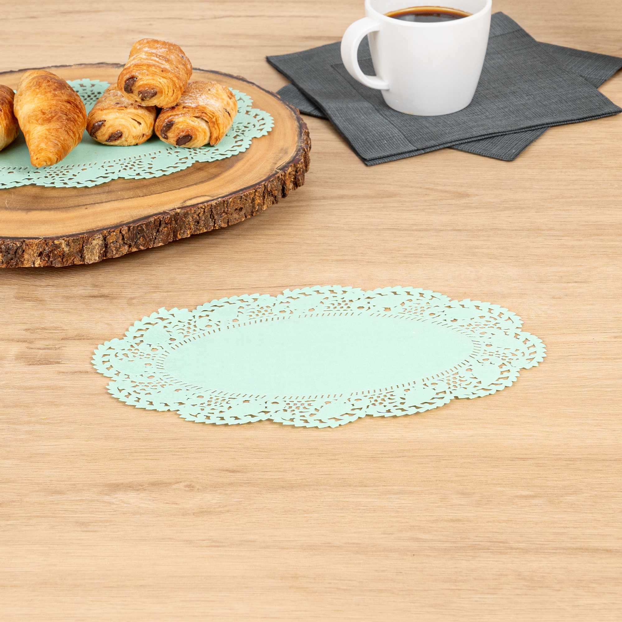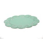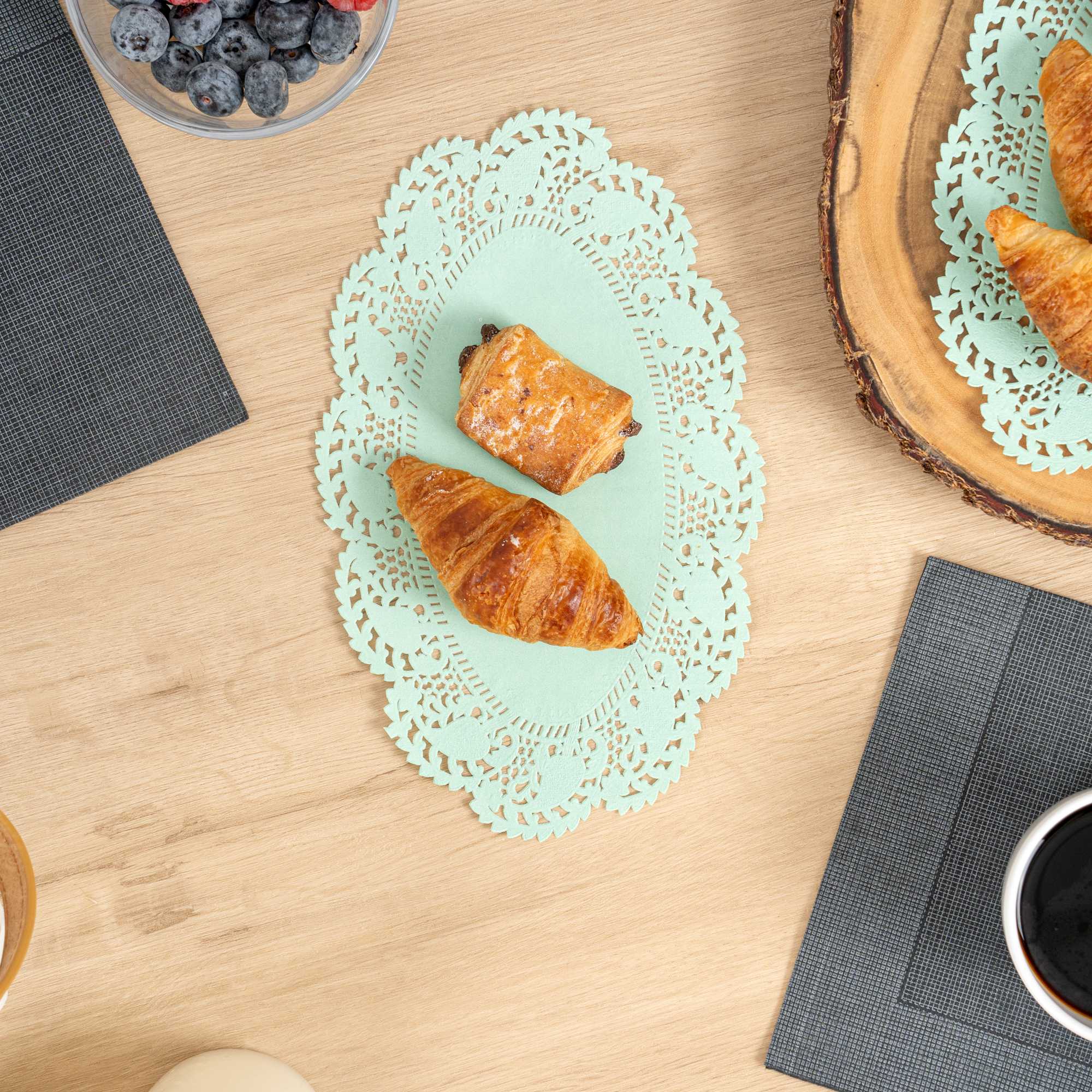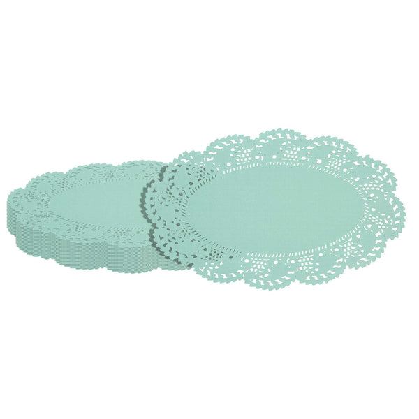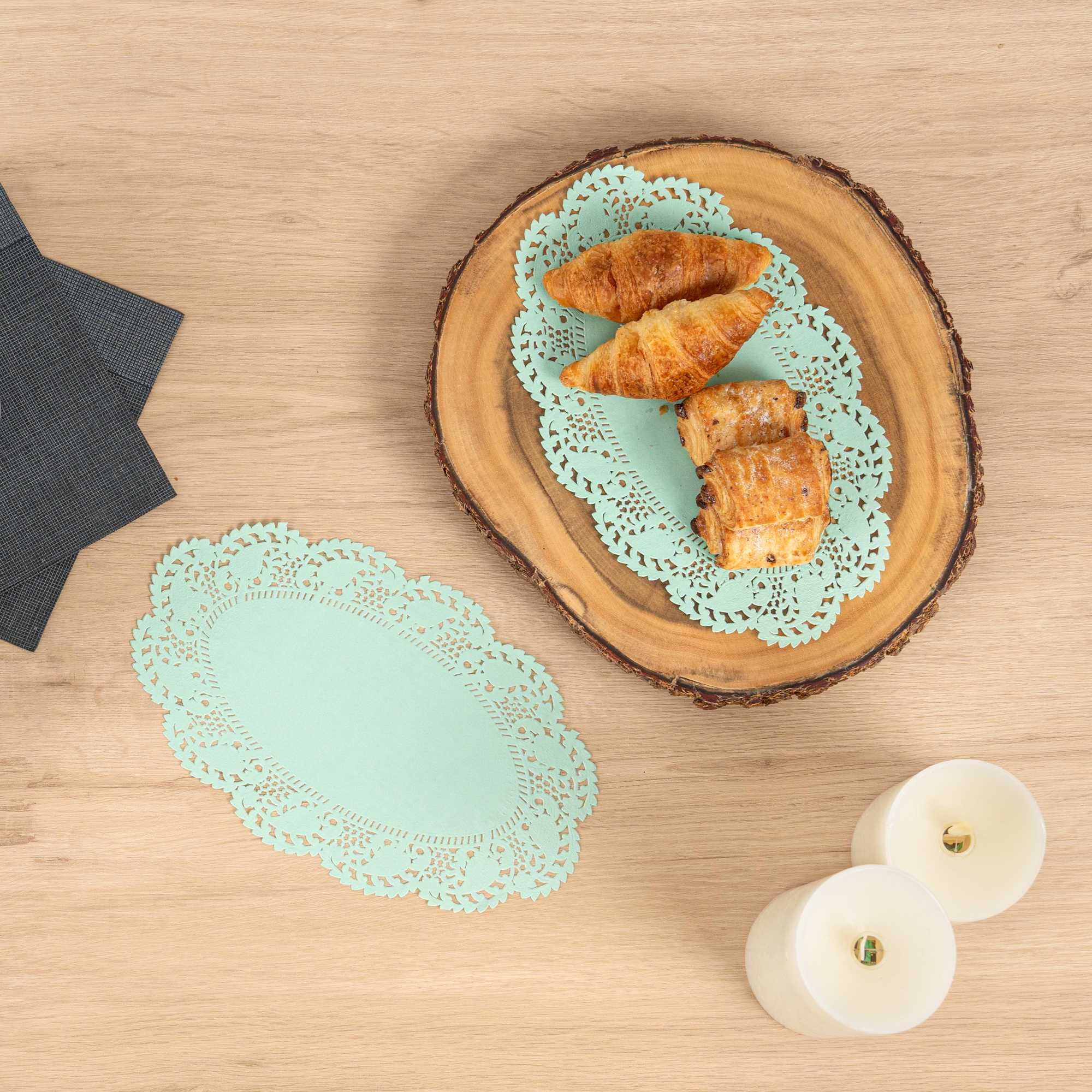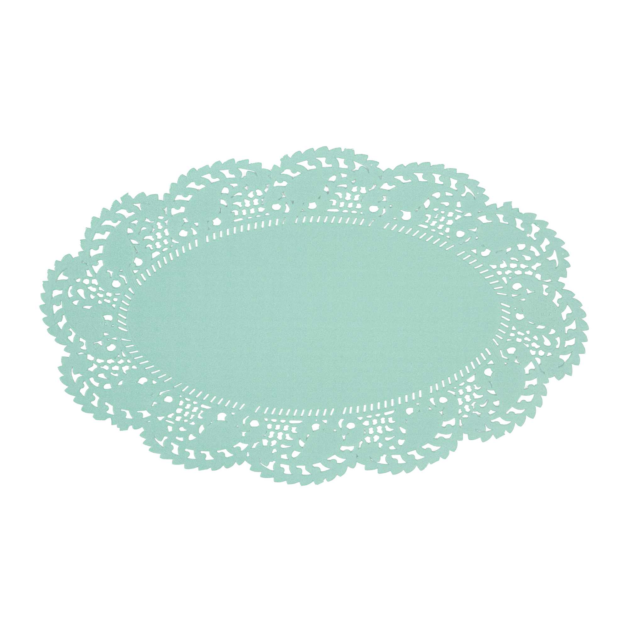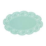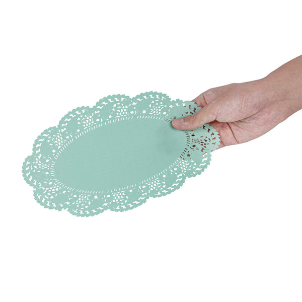 Elevate your dessert displays with our Pastry Tek Oval Teal Paper Doilies, designed to add an elegant touch to any presentation. Crafted from high-quality paper, these lace doilies provide durability while showcasing desserts at bakeries or catered luncheons without tearing or losing their structural integrity. Lace-like details on these paper doilies enhance the visual appeal of food presentations while serving as functional barriers, protecting surfaces, and absorbing moisture. The versatile teal finish of these colored paper doilies allows them to complement a wide range of table settings and themes, making them an ideal choice for various events and occasions. These table doilies are disposable to eradicate the hassle of post-event cleanup, offering a convenient and time-saving solution for busy cafes and food establishments. Perfect for use under cupcakes, petit fours, macarons, and other small treats, these small doilies measure 10.5 inches in length by 6.5 inches in width. Sold in a 100 count box.