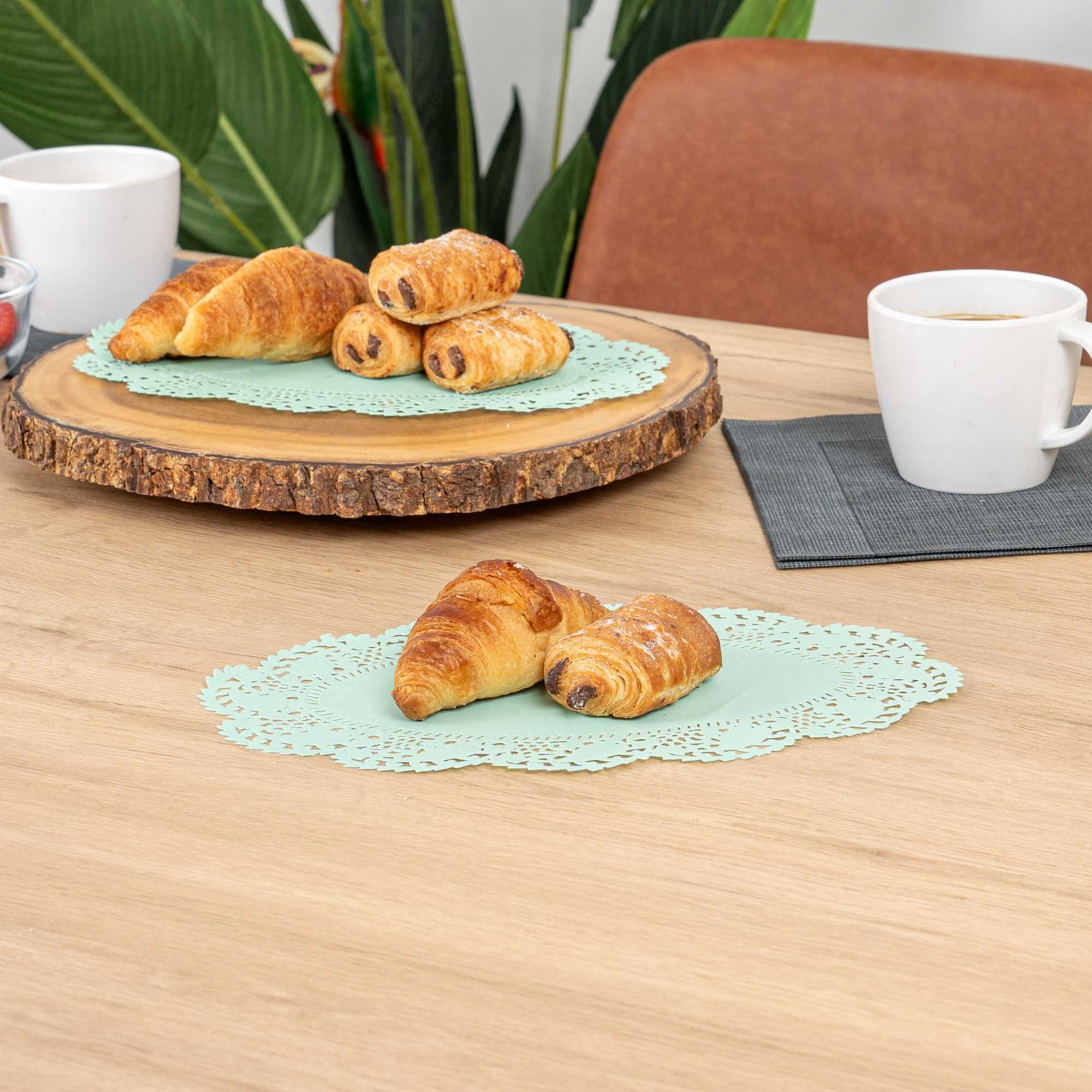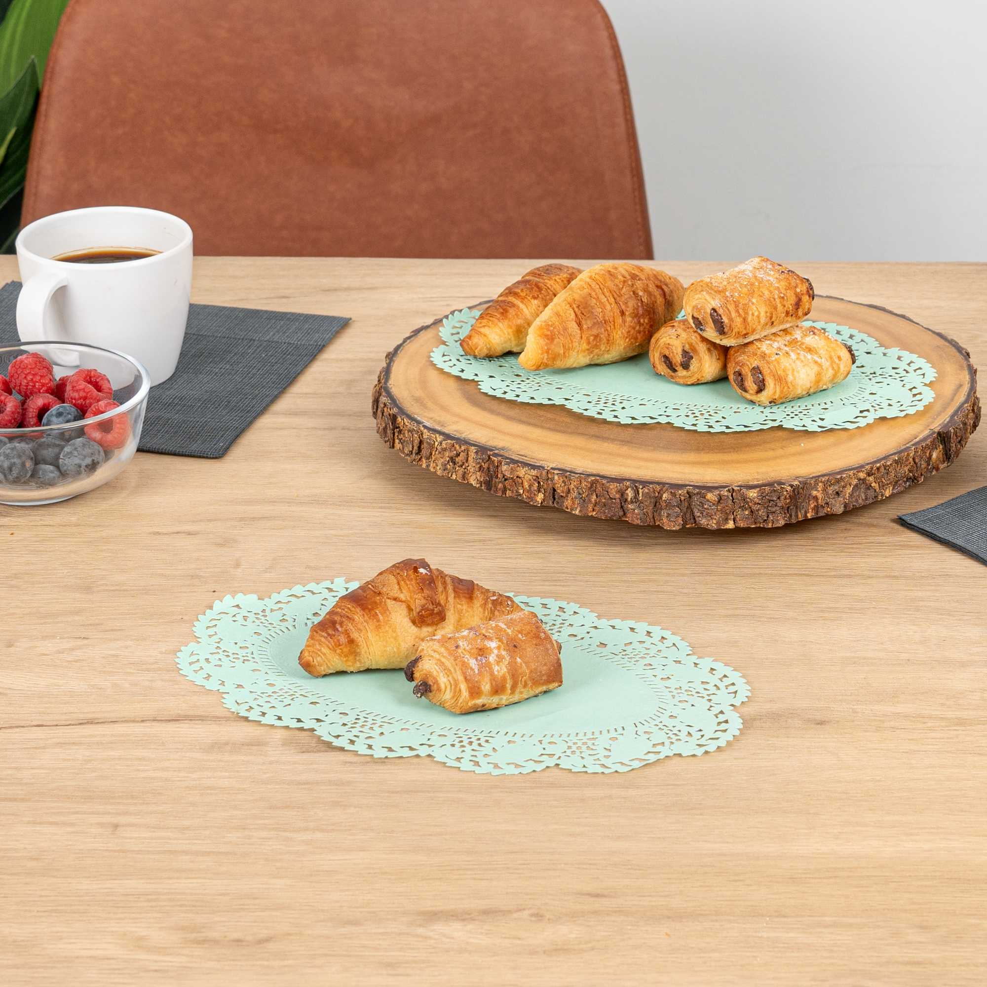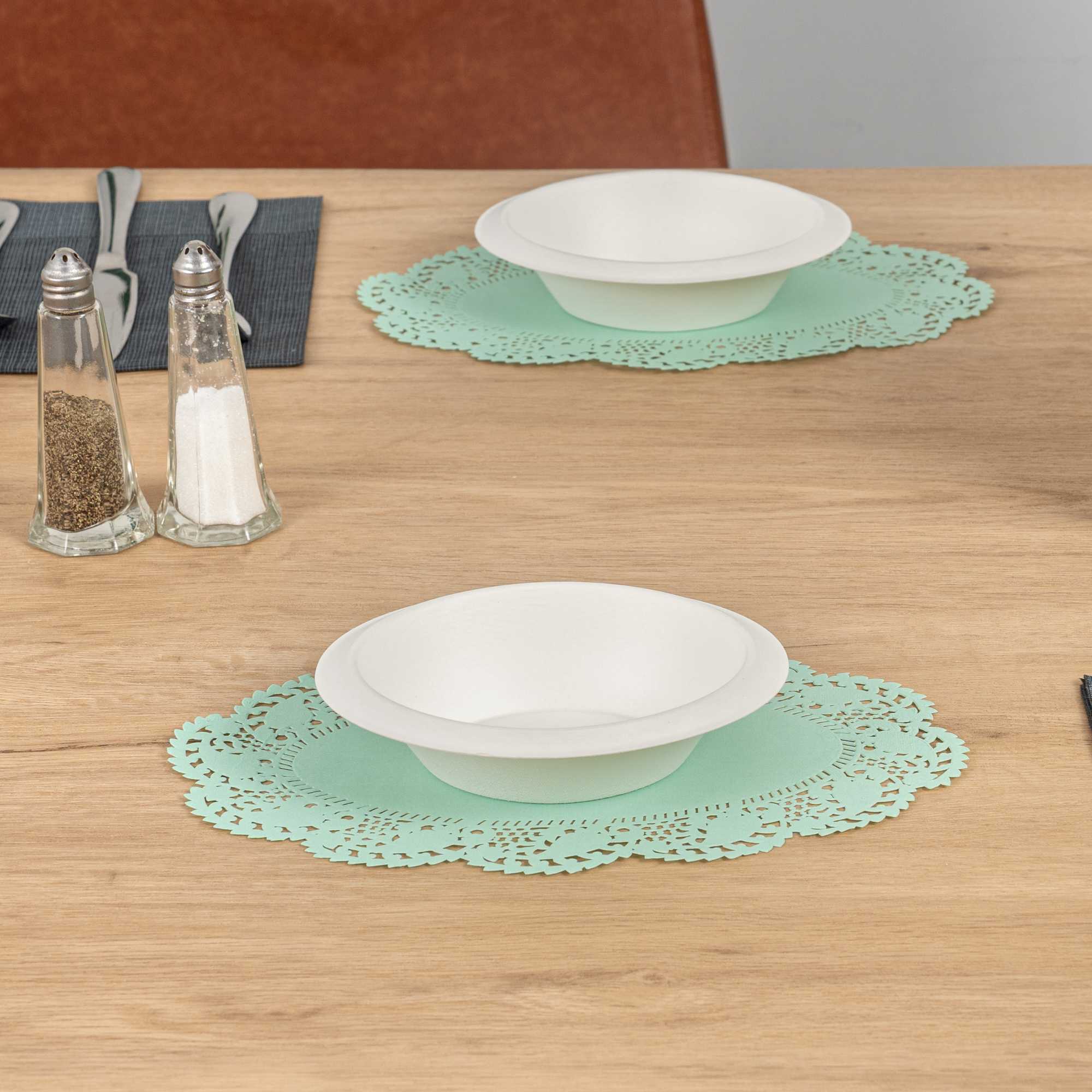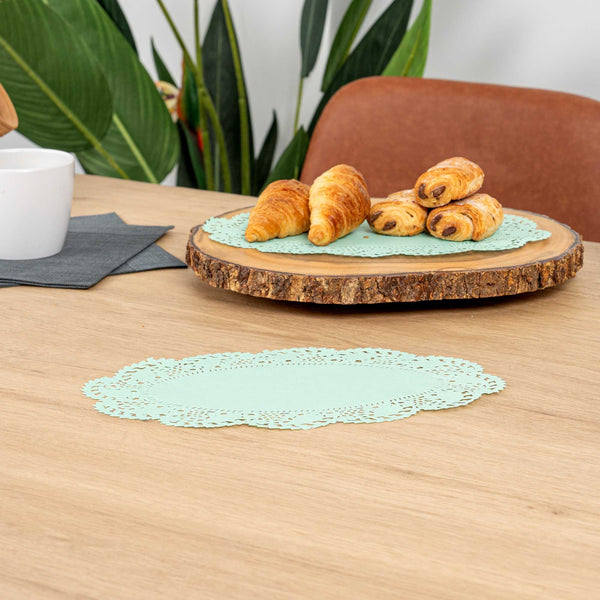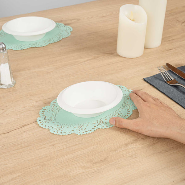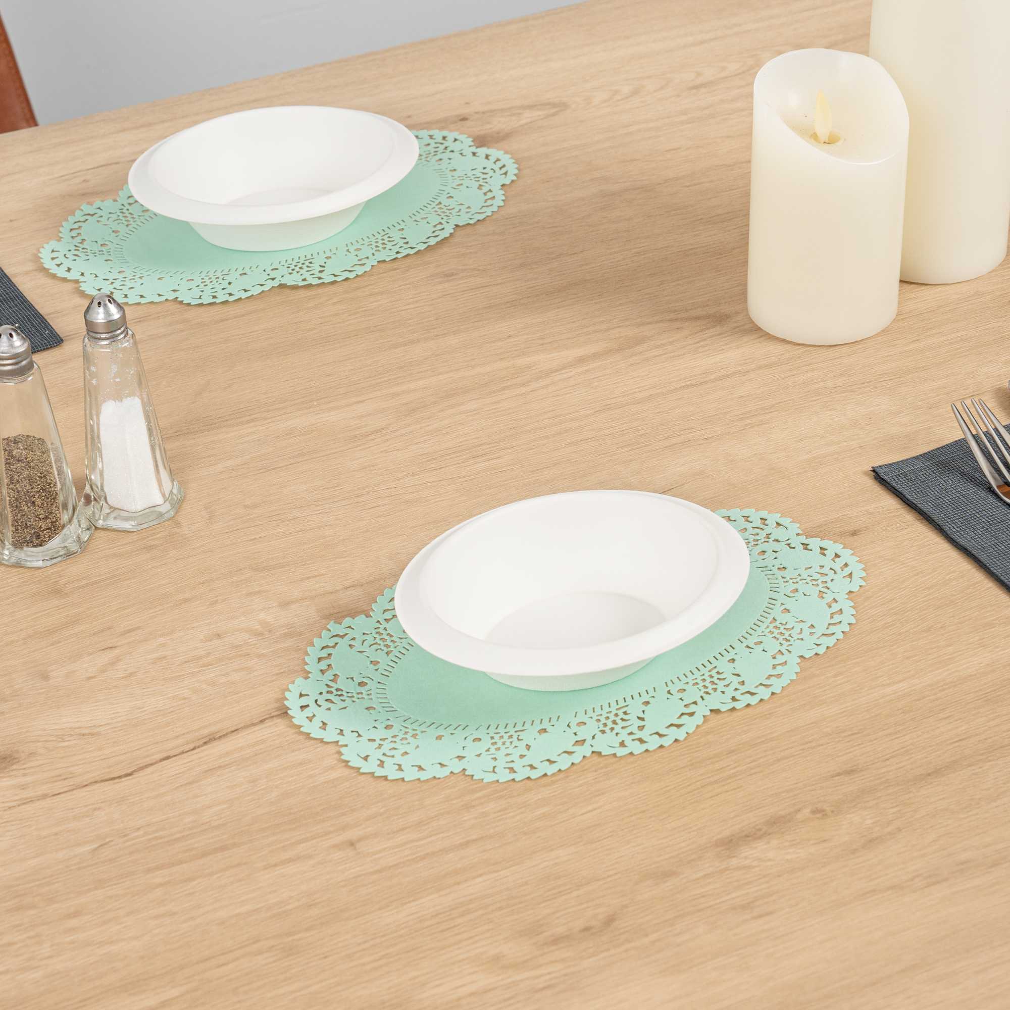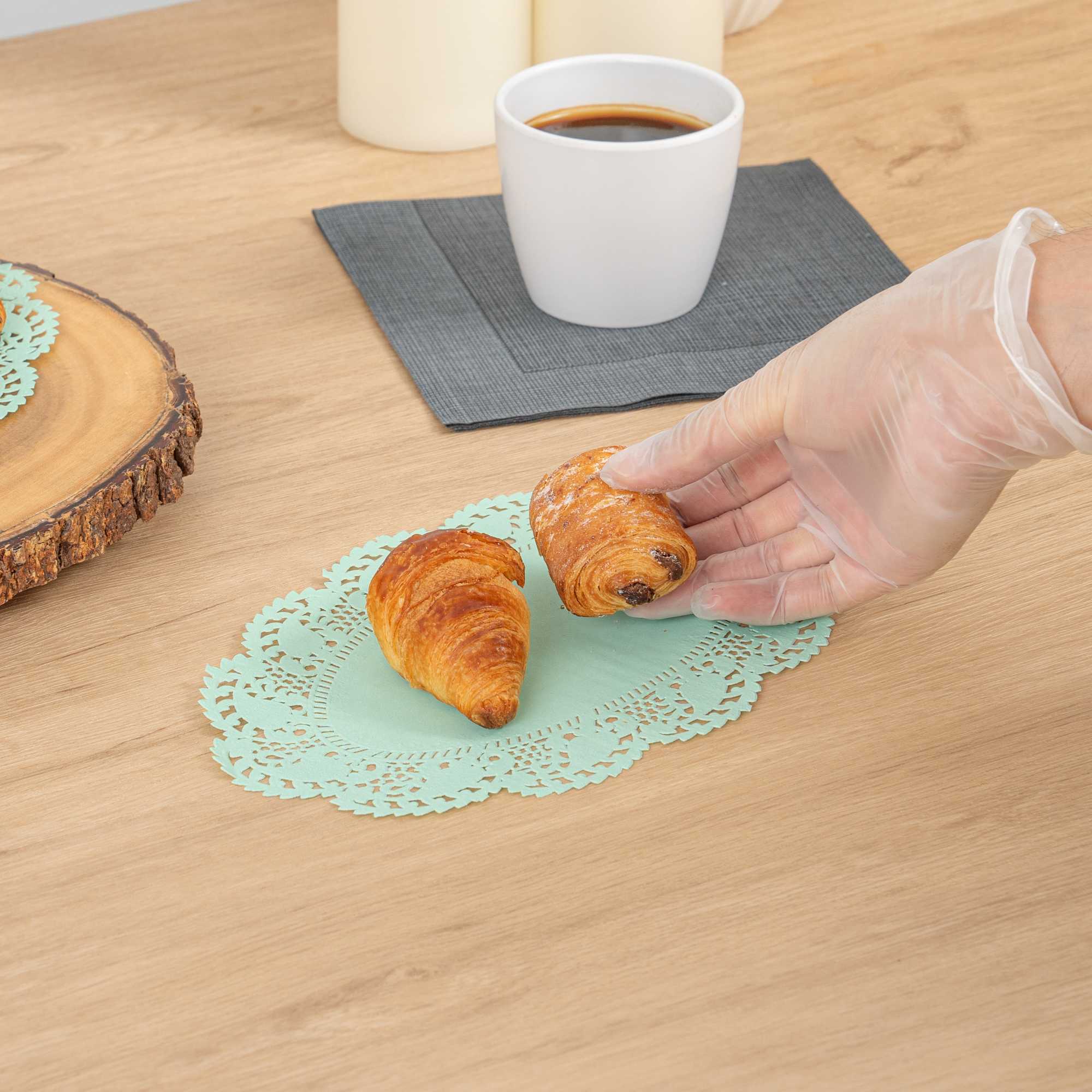 Elevate your dessert displays with our Pastry Tek Oval Teal Paper Doilies, designed to add an elegant touch to any presentation. Crafted from high-quality paper, these lace doilies provide durability while showcasing desserts at bakeries or catered luncheons without tearing or losing their structural integrity. Lace-like details on these paper doilies enhance the visual appeal of food presentations while serving as functional barriers, protecting surfaces, and absorbing moisture. The versatile teal finish of these colored paper doilies allows them to complement a wide range of table settings and themes, making them an ideal choice for various events and occasions. These table doilies are disposable to eradicate the hassle of post-event cleanup, offering a convenient and time-saving solution for busy cafes and food establishments. Perfect for use under cupcakes, petit fours, macarons, and other small treats, these small doilies measure 10.5 inches in length by 6.5 inches in width. Sold in a 100 count box.