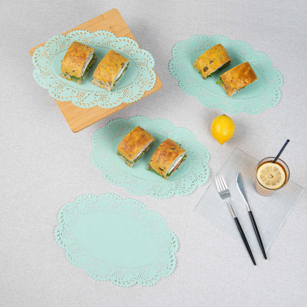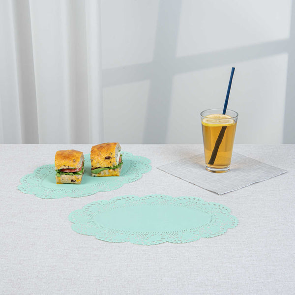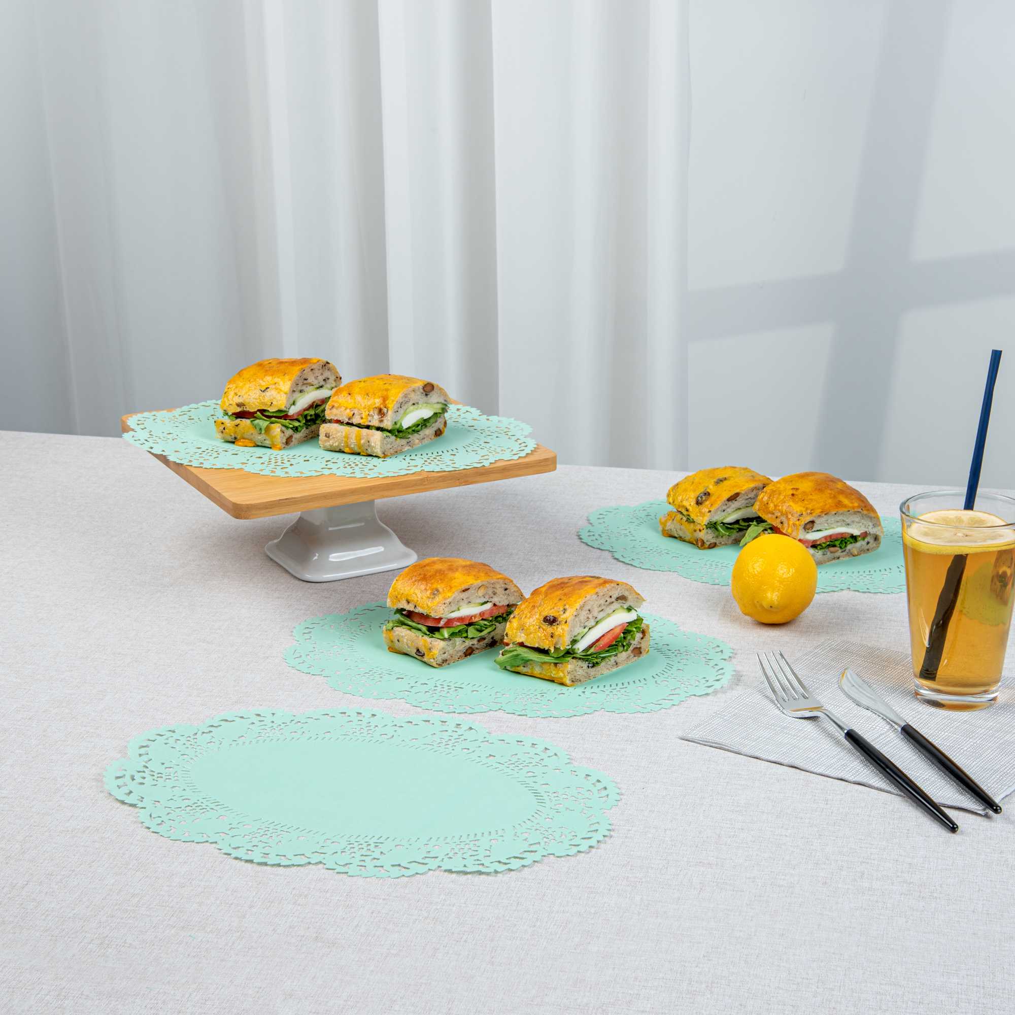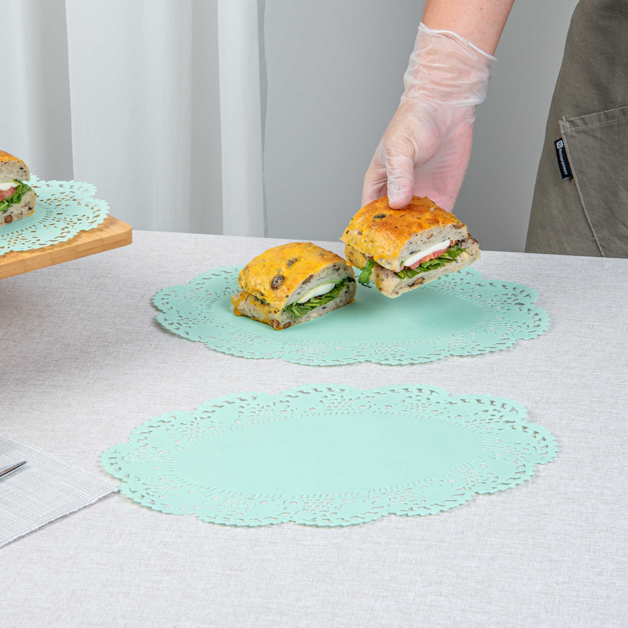 Enhance your dessert presentations with our Pastry Tek Oval Teal Paper Doilies, perfect for adding an elegant touch. Crafted from high-quality paper, these lace doilies provide exceptional durability while displaying desserts at bakeries or catered events without tearing. With intricate lace-like details, these table doilies not only increase the visual appeal of food presentations but also serve as functional barriers, protecting surfaces and absorbing moisture. The teal colored paper doilies effortlessly complement a wide range of table settings and themes, making them an ideal choice for various events and occasions. Offering a convenient and time-saving solution, these disposable paper doilies eradicate the hassle of post-event cleanup, perfect for busy cafes and food establishments. Whether used under cupcakes, petit fours, macarons, or other small treats, these small doilies add a touch of sophistication to any display. Measuring 12.5 inches in length by 8.5 inches in width, these lace doilies are the perfect size for showcasing your culinary creations. Sold in a 100 count box.